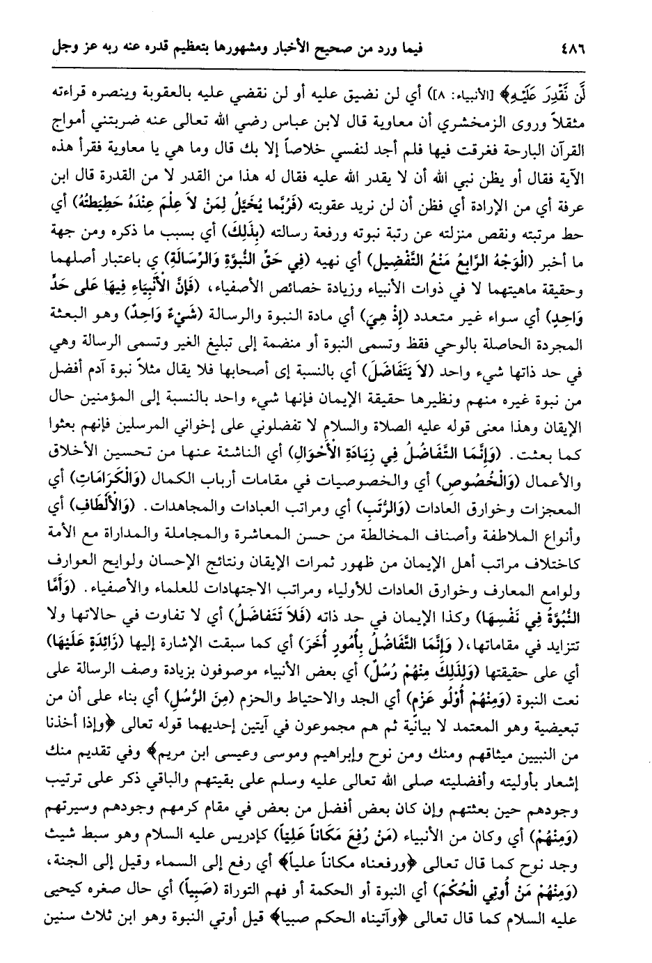 لَنْ نَقْدِرَ عَلَيْهِ [الأنبياء: 8] ) أي لن نضيق عليه أو لن نقضي عليه بالعقوبة وينصره قراءته مثقلا وروى الزمخشري أن معاوية قال لابن عباس رضي الله تعالى عنه ضربتني أمواج القرآن البارحة فغرقت فيها فلم أجد لنفسي خلاصا إلا بك قال وما هي يا معاوية فقرأ هذه الآية فقال أو يظن نبي الله أن لا يقدر الله عليه فقال له هذا من القدر لا من القدرة قال ابن عرفة أي من الإرادة أي فظن أن لن نريد عقوبته (فَرُبَّمَا يُخَيَّلُ لِمَنْ لَا عِلْمَ عِنْدَهُ حَطِيطَتُهُ) أي حط مرتبته ونقص منزلته عن رتبة نبوته ورفعة رسالته (بذلك) أي بسبب ما ذكره ومن جهة ما أخبر (الوجه الرّابع منع التّفضيل) أي نهيه (في حقّ النّبوّة والرّسالة) أي باعتبار أصلهما وحقيقة ماهيتهما لا في ذوات الأنبياء وزيادة خصائص الأصفياء، (فإنّ الأنبياء فيها على حدّ واحد) أي سواء غير متعدد (إذ هي) أي مادة النبوة والرسالة (شيء واحد) وهو البعثة المجردة الحاصلة بالوحي فقط وتسمى النبوة أو منضمة إلى تبليغ الغير وتسمى الرسالة وهي في حد ذاتها شيء واحد (لا يتفاضل) أي بالنسبة إى أصحابها فلا يقال مثلا نبوة آدم أفضل من نبوة غيره منهم ونظيرها حقيقة الإيمان فإنها شيء واحد بالنسبة إلى المؤمنين حال الإيقان وهذا معنى قوله عليه الصلاة والسلام لا تفضلوني على إخواني المرسلين فإنهم بعثوا كما بعثت. (وإنّما التّفاضل في زيادة الأحوال) أي الناشئة عنها من تحسين الأخلاق والأعمال (والخصوص) أي والخصوصيات في مقامات أرباب الكمال (والكرامات) أي المعجزات وخوارق العادات (والرّتب) أي ومراتب العبادات والمجاهدات. (والألطاف) أي وأنواع الملاطفة وأصناف المخالطة من حسن المعاشرة والمجاملة والمداراة مع الأمة كاختلاف مراتب أهل الإيمان من ظهور ثمرات الإيقان ونتائج الإحسان ولوايح العوارف ولوامع المعارف وخوارق العادات للأولياء ومراتب الاجتهادات للعلماء والأصفياء. (وأمّا النّبوّة في نفسها) وكذا الإيمان في حد ذاته (فلا تتفاضل) أي لا تفاوت في حالاتها ولا تتزايد في مقاماتها، (وإنّما التّفاضل بأمور أخر) أي كما سبقت الإشارة إليها (زائدة عليها) أي على حقيقتها (ولذلك منهم رسل) أي بعض الأنبياء موصوفون بزيادة وصف الرسالة على نعت النبوة (ومنهم أولو عزم) أي الجد والاحتياط والحزم (من الرّسل) أي بناء على أن من تبعيضية وهو المعتمد لا بيانية ثم هم مجموعون في آيتين إحديهما قَوْلُهُ تَعَالَى وَإِذْ أَخَذْنا مِنَ النَّبِيِّينَ مِيثاقَهُمْ وَمِنْكَ وَمِنْ نُوحٍ وَإِبْراهِيمَ وَمُوسى وَعِيسَى ابْنِ مَرْيَمَ وفي تقديم منك إشعار بأوليته وأفضليته صلى الله تعالى عليه وسلم على بقيتهم والباقي ذكر على ترتيب وجودهم حين بعثتهم وإن كان بعض أفضل من بعض في مقام كرمهم وجودهم وسيرتهم (ومنهم) أي وكان من الأنبياء (من رفع مكانا عليّا) كإدريس عليه السلام وهو سبط شيث وجد نوح كما قال تعالى وَرَفَعْناهُ مَكاناً عَلِيًّا أي رفع إلى السماء وقيل إلى الجنة، (ومنهم من أوتي الحكم) أي النبوة أو الحكمة أو فهم التوراة (صبيا) أي حال صغره كيحيى عليه السلام كما قال تعالى وَآتَيْناهُ الْحُكْمَ صَبِيًّا قيل أوتي النبوة وهو ابن ثلاث سنين