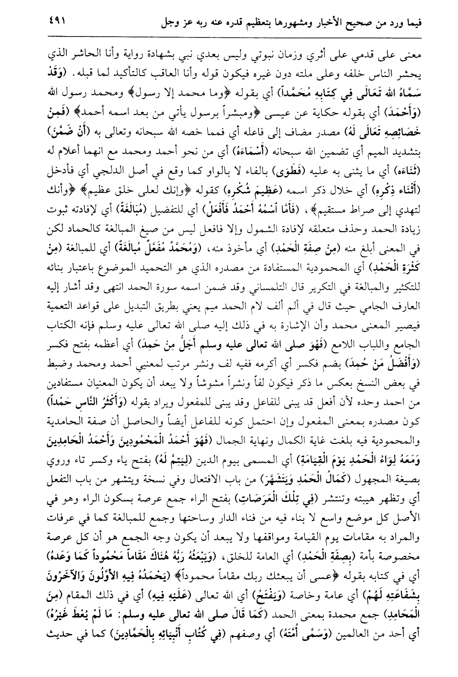 معنى على قدمي على أثري وزمان نبوتي وليس بعدي نبي بشهادة رواية وأنا الحاشر الذي يحشر الناس خلفه وعلى ملته دون غيره فيكون قوله وأنا العاقب كالتأكيد لما قبله. (وَقَدْ سَمَّاهُ اللَّهُ تَعَالَى فِي كِتَابِهِ مُحَمَّدًا) أي بقوله وَما مُحَمَّدٌ إِلَّا رَسُولٌ ومحمد رسول الله (وأحمد) أي بقوله حكاية عن عيسى وَمُبَشِّراً بِرَسُولٍ يَأْتِي مِنْ بَعْدِي اسْمُهُ أَحْمَدُ (فمن خصائصه تعالى له) مصدر مضاف إلى فاعله أي فمما خصه الله سبحانه وتعالى به (أن ضمّن) بتشديد الميم أي تضمين الله سبحانه (أسماءه) أي من نحو أحمد ومحمد مع انهما أعلام له (ثناءه) أي ما يثنى به عليه (فطوى) بالفاء لا بالواو كما وقع في أصل الدلجي أي فأدخل (أثناء ذكره) أي خلال ذكر اسمه (عظيم شكره) كقوله وَإِنَّكَ لَعَلى خُلُقٍ عَظِيمٍ وَإِنَّكَ لَتَهْدِي إِلى صِراطٍ مُسْتَقِيمٍ، (فأمّا اسمه أحمد فأفعل) أي للتفضيل (مبالغة) أي لإفادته ثبوت زيادة الحمد وحذف متعلقه لإفادة الشمول وإلا فافعل ليس من صيغ المبالغة كالحماد لكن في المعنى أبلغ منه (من صفة الحمد) أي مأخوذ منه، (ومحمّد مفعّل مبالغة) أي للمبالغة (من كثرة الحمد) أي المحمودية المستفادة من مصدره الذي هو التحميد الموضوع باعتبار بنائه للتكثير والمبالغة في التكرير قال التلمساني وقد ضمن اسمه سورة الحمد انتهى وقد أشار إليه العارف الجامي حيث قال في ألم ألف لام الحمد ميم يعني بطريق التبديل على قواعد التعمية فيصير المعنى محمد وأن الإشارة به في ذلك إليه صلى الله تعالى عليه وسلم فإنه الكتاب الجامع واللباب اللامع (فهو صلى الله تعالى عليه وسلم أجلّ من حمد) أي أعظمه بفتح فكسر (وأفضل من حمد) بضم فكسر أي أكرمه ففيه لف ونشر مرتب لمعنيي أحمد ومحمد وضبط في بعض النسخ بعكس ما ذكر فيكون لفا ونشرا مشوشا ولا يبعد أن يكون المعنيان مستفادين من احمد وحده لأن أفعل قد يبنى للفاعل وقد يبنى للمفعول ويراد بقوله (وأكثر النّاس حمدا) كون مصدره بمعنى المفعول وإن احتمل كونه للفاعل أيضا والحاصل أن صفة الحامدية والمحمودية فيه بلغت غاية الكمال ونهاية الجمال (فَهُوَ أَحْمَدُ الْمَحْمُودِينَ وَأَحْمَدُ الْحَامِدِينَ وَمَعَهُ لِوَاءُ الحمد يوم القيامة) أي المسمى بيوم الدين (ليتمّ له) بفتح ياء وكسر تاء وروي بصيغة المجهول (كمال الحمد ويتشهّر) من باب الافتعال وفي نسخة ويتشهر من باب التفعل أي وتظهر هيبته وتنتشر (في تلك العرصات) بفتح الراء جمع عرصة بسكون الراء وهو في الأصل كل موضع واسع لا بناء فيه من فناء الدار وساحتها وجمع للمبالغة كما في عرفات والمراد به مقامات يوم القيامة ومواقفها ولا يبعد أن يكون وجه الجمع هو أن كل عرصة مخصوصة بأمة (بصفة الحمد) أي العامة للخلق، (وَيَبْعَثَهُ رَبُّهُ هُنَاكَ مَقَامًا مَحْمُودًا كَمَا وَعَدَهُ) أي في كتابه بقوله عَسى أَنْ يَبْعَثَكَ رَبُّكَ مَقاماً مَحْمُوداً (يحمده فيه الأوّلون والآخرون بشفاعته لهم) أي عامة وخاصة (ويفتح) أي الله تعالى (عليه فيه) أي في ذلك المقام (من المحامد) جمع محمدة بمعنى الحمد (كما قال صلى الله تعالى عليه وسلم: ما لم يعط غيره) أي أحد من العالمين (وسمّى أمّته) أي وصفهم (في كتاب أنبيائه بالحمّادين) كما في حديث