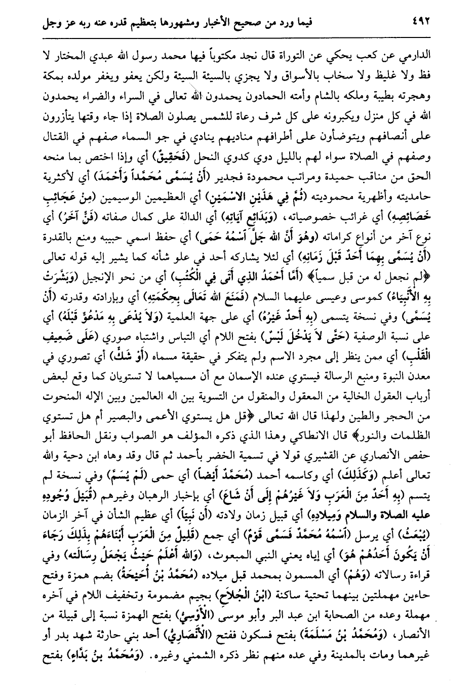 الدارمي عن كعب يحكي عن التوراة قال نجد مكتوبا فيها محمد رسول الله عبدي المختار لا فظ ولا غليظ ولا سخاب بالأسواق ولا يجزي بالسيئة السيئة ولكن يعفو ويغفر مولده بمكة وهجرته بطيبة وملكه بالشام وأمته الحمادون يحمدون الله تعالى في السراء والضراء يحمدون الله في كل منزل ويكبرونه على كل شرف رعاة للشمس يصلون الصلاة إذا جاء وقتها يتأزرون على أنصافهم ويتوضأون على أطرافهم مناديهم ينادي في جو السماء صفهم في القتال وصفهم في الصلاة سواء لهم بالليل دوي كدوي النحل (فحقيق) أي وإذا اختص بما منحه الحق من مناقب حميدة ومراتب محمودة فجدير (أن يسمّى محمّدا وأحمد) أي لأكثرية حامديته وأظهرية محموديته (ثمّ في هذين الاسمين) أي العظيمين الوسيمين (من عجائب خصائصه) أي غرائب خصوصياته، (وبدائع آياته) أي الدالة على كمال صفاته (فنّ آخر) أي نوع آخر من أنواع كراماته (وهو أنّ الله جلّ اسمه حمى) أي حفظ اسمي حبيبه ومنع بالقدرة (أن يسمّى بهما أحد قبل زمانه) أي لئلا يشاركه أحد في علو شأنه كما يشير إليه قوله تعالى لَمْ نَجْعَلْ لَهُ مِنْ قَبْلُ سَمِيًّا (أمّا أحمد الذي أتى في الكتب) أي من نحو الإنجيل (وبشّرت به الأنبياء) كموسى وعيسى عليهما السلام (فمنع الله تعالى بحكمته) أي وبإرادته وقدرته (أن يسمّى) وفي نسخة يتسمى (به أحد غيره) أي على جهة العلمية (ولا يدعى به مدعوّ قبله) أي على نسبة الوصفية (حتّى لا يدخل لبس) بفتح اللام أي التباس واشتباه صوري (على ضعيف القلب) أي ممن ينظر إلى مجرد الاسم ولم يتفكر في حقيقة مسماه (أو شكّ) أي تصوري في معدن النبوة ومنبع الرسالة فيستوي عنده الإسمان مع أن مسمياهما لا تستويان كما وقع لبعض أرباب العقول الخالية من المعقول والمنقول من التسوية بين اله العالمين وبين الإله المنحوت من الحجر والطين ولهذا قال الله تعالى قُلْ هَلْ يَسْتَوِي الْأَعْمى وَالْبَصِيرُ أَمْ هَلْ تَسْتَوِي الظُّلُماتُ وَالنُّورُ قال الانطاكي وهذا الذي ذكره المؤلف هو الصواب ونقل الحافظ أبو حفص الأنصاري عن القشيري قولا في تسمية الخضر بأحمد ثم قال وقد وهاه ابن دحية والله تعالى أعلم (وكذلك) أي وكاسمه أحمد (محمّد أيضا) أي حمى (لم يسمّ) وفي نسخة لم يتسم (بِهِ أَحَدٌ مِنَ الْعَرَبِ وَلَا غَيْرُهُمْ إِلَى أن شاع) أي بإخبار الرهبان وغيرهم (قبيل وجوده عليه الصلاة والسلام وميلاده) أي قبيل زمان ولادته (أن نبيّا) أي عظيم الشأن في آخر الزمان (يبعث) أي يرسل (اسمه محمّد فسمّى قوم) أي جمع (قَلِيلٌ مِنَ الْعَرَبِ أَبْنَاءَهُمْ بِذَلِكَ رَجَاءَ أَنْ يكون أحدهم هو) أي إياه يعني النبي المبعوث، (والله أعلم حيث يجعل رسالته) وفي قراءة رسالاته (وهم) أي المسمون بمحمد قبل ميلاده (محمّد بن أحيحة) بضم همزة وفتح حاءين مهملتين بينهما تحتية ساكنة (ابن الجلاح) بجيم مضمومة وتخفيف اللام في آخره مهملة وعده من الصحابة ابن عبد البر وأبو موسى (الأوسيّ) بفتح الهمزة نسبة إلى قبيلة من الأنصار، (ومحمّد بن مسلمة) بفتح فسكون ففتح (الأنصاريّ) أحد بني حارثة شهد بدر أو غيرهما ومات بالمدينة وفي عده منهم نظر ذكره الشمني وغيره. (ومحمّد بن بدّاء) بفتح