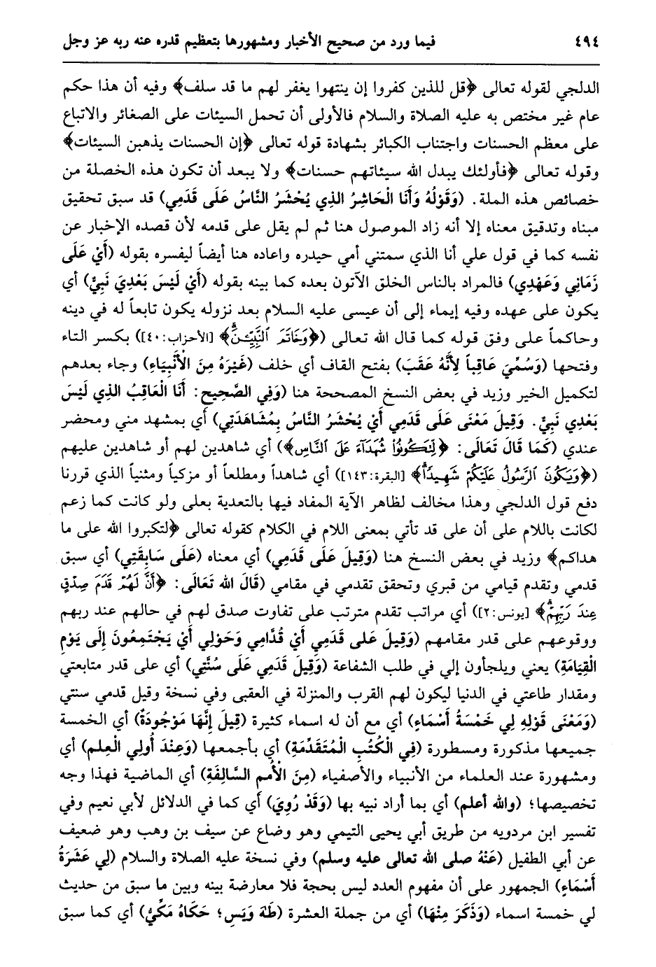 الدلجي لقوله تَعَالَى قُلْ لِلَّذِينَ كَفَرُوا إِنْ يَنْتَهُوا يُغْفَرْ لَهُمْ ما قَدْ سَلَفَ وفيه أن هذا حكم عام غير مختص به عليه الصلاة والسلام فالأولى أن تحمل السيئات على الصغائر والاتباع على معظم الحسنات واجتناب الكبائر بشهادة قوله تعالى إِنَّ الْحَسَناتِ يُذْهِبْنَ السَّيِّئاتِ وقوله تعالى فَأُوْلئِكَ يُبَدِّلُ اللَّهُ سَيِّئاتِهِمْ حَسَناتٍ ولا يبعد أن تكون هذه الخصلة من خصائص هذه الملة. (وَقَوْلُهُ وَأَنَا الْحَاشِرُ الَّذِي يُحْشَرُ النَّاسُ عَلَى قدمي) قد سبق تحقيق مبناه وتدقيق معناه إلا أنه زاد الموصول هنا ثم لم يقل على قدمه لأن قصده الإخبار عن نفسه كما في قول علي أنا الذي سمتني أمي حيدره واعاده هنا أيضا ليفسره بقوله (أي على زماني وعهدي) فالمراد بالناس الخلق الآتون بعده كما بينه بقوله (أي ليس بعدي نبيّ) أي يكون على عهده وفيه إيماء إلى أن عيسى عليه السلام بعد نزوله يكون تابعا له في دينه وحاكما على وفق قوله كما قال الله تعالى (وَخاتَمَ النَّبِيِّينَ [الأحزاب: 40] ) بكسر التاء وفتحها (وسمّي عاقبا لأنّه عقب) بفتح القاف أي خلف (غيره من الأنبياء) وجاء بعدهم لتكميل الخير وزيد في بعض النسخ المصححة هنا (وَفِي الصَّحِيحِ: أَنَا الْعَاقِبُ الَّذِي لَيْسَ بَعْدِي نَبِيٌّ. وَقِيلَ مَعْنَى عَلَى قَدَمِي أَيْ يُحْشَرُ النّاس بمشاهدتي) أي بمشهد مني ومحضر عندي (كَمَا قَالَ تَعَالَى: لِتَكُونُوا شُهَداءَ عَلَى النَّاسِ) أي شاهدين لهم أو شاهدين عليهم (وَيَكُونَ الرَّسُولُ عَلَيْكُمْ شَهِيداً [البقرة: 143] ) أي شاهدا ومطلعا أو مزكيا ومثنيا الذي قررنا دفع قول الدلجي وهذا مخالف لظاهر الآية المفاد فيها بالتعدية بعلى ولو كانت كما زعم لكانت باللام على أن على قد تأتي بمعنى اللام في الكلام كقوله تعالى لِتُكَبِّرُوا اللَّهَ عَلى ما هَداكُمْ وزيد في بعض النسخ هنا (وقيل على قدمي) أي معناه (على سابقتي) أي سبق قدمي وتقدم قيامي من قبري وتحقق تقدمي في مقامي (قَالَ اللَّهُ تَعَالَى: أَنَّ لَهُمْ قَدَمَ صِدْقٍ عِنْدَ رَبِّهِمْ [يونس: 2] ) أي مراتب تقدم مترتب على تفاوت صدق لهم في حالهم عند ربهم ووقوعهم على قدر مقامهم (وَقِيلَ عَلَى قَدَمِي أَيْ قُدَّامِي وَحَوْلِي أَيْ يجتمعون إلى يوم القيامة) يعني ويلجأون إلي في طلب الشفاعة (وقيل قدمي على سنّتي) أي على قدر متابعتي ومقدار طاعتي في الدنيا ليكون لهم القرب والمنزلة في العقبى وفي نسخة وقيل قدمي سنتي (ومعنى قوله لي خمسة أسماء) أي مع أن له اسماء كثيرة (قيل إنّها موجودة) أي الخمسة جميعها مذكورة ومسطورة (في الكتب المتقدّمة) أي بأجمعها (وعند أولي العلم) أي ومشهورة عند العلماء من الأنبياء والأصفياء (من الأمم السّالفة) أي الماضية فهذا وجه تخصيصها؛ (والله أعلم) أي بما أراد نبيه بها (وقد روي) أي كما في الدلائل لأبي نعيم وفي تفسير ابن مردويه من طريق أبي يحيى التيمي وهو وضاع عن سيف بن وهب وهو ضعيف عن أبي الطفيل (عنه صلى الله تعالى عليه وسلم) وفي نسخة عليه الصلاة والسلام (لي عشرة أسماء) الجمهور على أن مفهوم العدد ليس بحجة فلا معارضة بينه وبين ما سبق من حديث لي خمسة اسماء (وذكر منها) أي من جملة العشرة (طه ويس؛ حكاه مكّيّ) أي كما سبق