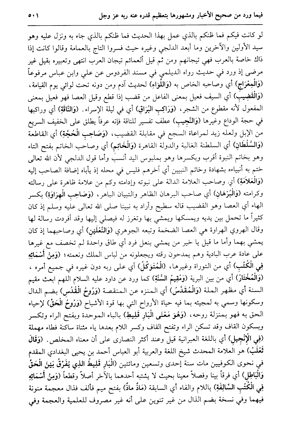 لو كانت فيكم فما ظنكم بالذي عمل بهذا الحديث فما ظنكم بالذي جاء به ونزل عليه وهو سيد الأولين والآخرين وما أبعد الدلجي وغيره حيث فسروا التاج بالعمامة وقالوا كانت إذا ذاك خاصة بالعرب فهي تيجانهم ومن ثم قيل ألعمائم تيجان العرب انتهى وتعبيره بقيل غير مرضى إذ ورد في حديث رواه الديلمي في مسند الفردوس عن علي وابن عباس مرفوعا (والمعراج) أي وصاحبه الخاص به (واللّواء) لحديث آدم ومن دونه تحت لوائي يوم القيامة، (والقضيب) أي السيف فعيل بمعنى الفاعل من قضب إذا قطع وقيل العصا فهو فعيل بمعنى المفعول لأنه مقطوع من الشجر، (وراكب البراق) أي في ليلة الإسراء. (والنّاقة) أي وراكبها في حجة الوداع وغيرها (والنّجيب) عطف تفسير للناقة فإنه عرفا يطلق على الخفيف السريع من الإبل ولعله زيد لمراعاة السجع في مقابلة القضيب، (وصاحب الحجّة) أي القاطعة (والسّلطان) أي السلطنة الغالبة والدولة القاهرة (والخاتم) أي وصاحب الخاتم بفتح التاء وهو بخاتم النبوة أقرب وبكسرها وهو بملبوس اليد أنسب وأما قول الدلجي لأن الله تعالى ختم به أنبياءه بشهادة وخاتم النبيين أي آخرهم فليس في محله إذ يأباه إضافة الصاحب إليه (والعلامة) أي وصاحب العلامة الدالة على نبوته وإدامته وكم من علامة ظاهرة على رسالته وكرامته (والبرهان) أي صاحب البرهان الظاهر والتبيان الباهر، (وصاحب الهراوة) بكسر الهاء أي العصا وهو القضيب قاله سطيح وأراد به نبينا صلى الله تعالى عليه وسلم إذ كان كثيرا ما تحمل بين يديه ويمسكها ويمشي بها وتغرز له فيصلي إليها وقد أفردت رسالة لها وقال الهروي الهراوة هي العصا الضخمة وتبعه الجوهري (والنّعلين) أي وصاحبهما إذ كان يمشي بهما وأما ما قيل يا خير من يمشي بنعل فرد أي طاق واحدة لم تخصف مع غيرها على عادة عرب البادية وهم يمدحون رقته ويجعلونه من لباس الملك ونعمته؛ (ومن أسمائه في الكتب) أي من التوراة وغيرها، (المتوكّل) أي على ربه دون غيره في جميع أمره، (والمختار) أي من بين البرية (ومقيم السّنّة) كما ورد عن داود عليه السلام اللهم ابعث مقيم السنة أي مظهر الملة (والمقدّس) أي المنزه عن المنقصة (وروح القدس) بضم الدال وسكونها وسمي به لمجيئه بما فيه حياة الأرواح التي بها قوة الأشباح (وروح الحقّ) لإحياء الحق به فهو بمنزلة روحه، (وهو معنى البار قليط) بالباء الموحدة وبفتح الراء وتكسر وبسكون القاف وقد تسكن الراء وتفتح القاف وكسر اللام بعدها ياء مثناة ساكنة فطاء مهملة (في الإنجيل) أي باللغة العبرانية قيل وعند أكثر النصارى على أن معناه المخلص. (وقال ثعلب) هو العلامة المحدث شيخ اللغة والعربية أبو العباس أحمد بن يحيى البغدادي المقدم في نحوى الكوفيين مات سنة إحدى وتسعين ومائتين (البار قليط الذي يفرّق بين الحقّ والباطل) أي فرقا بينا وفصلا معينا بحيث لا يشتبه أحدهما بالآخر أصلا وقطعا (ومن أسمائه في الكتب السّالفة) باللام والفاء أي السابقة (ماذ ماذ) بفتح ميم فألف فذال معجمة منونة فيهما وفي نسخة بضم الذال من غير تنوين على أنه غير مصروف للعلمية والعجمة وفي