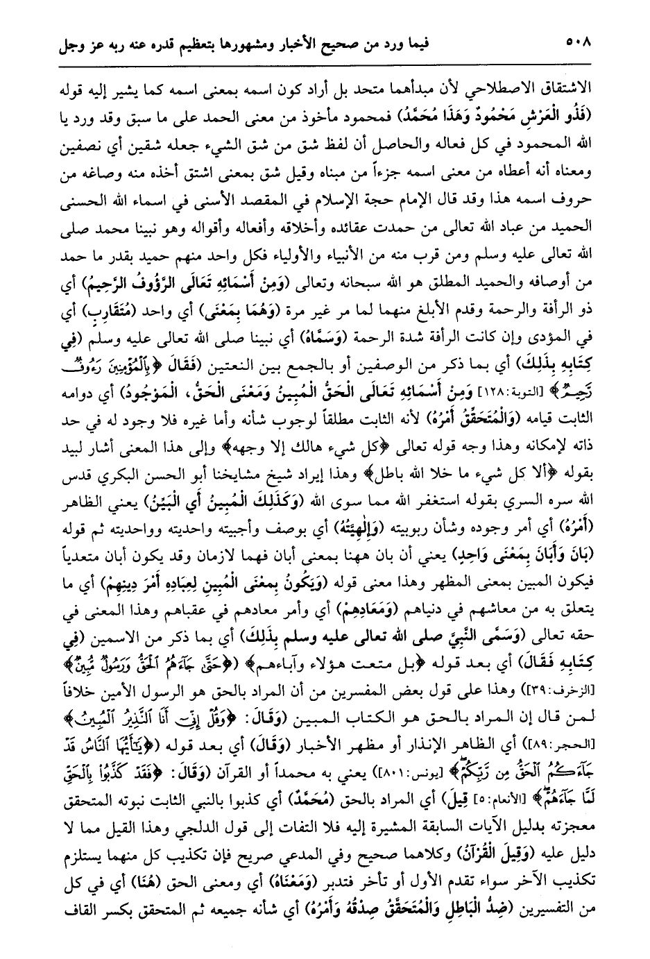 الاشتقاق الاصطلاحي لأن مبدأهما متحد بل أراد كون اسمه بمعنى اسمه كما يشير إليه قوله (فذو العرش محمود وهذا محمّد) فمحمود مأخوذ من معنى الحمد على ما سبق وقد ورد يا الله المحمود في كل فعاله والحاصل أن لفظ شق من شق الشيء جعله شقين أي نصفين ومعناه أنه أعطاه من معنى اسمه جزءا من مبناه وقيل شق بمعنى اشتق أخذه منه وصاغه من حروف اسمه هذا وقد قال الإمام حجة الإسلام في المقصد الأسنى في اسماء الله الحسنى الحميد من عباد الله تعالى من حمدت عقائده وأخلاقه وأفعاله وأقواله وهو نبينا محمد صلى الله تعالى عليه وسلم ومن قرب منه من الأنبياء والأولياء فكل واحد منهم حميد بقدر ما حمد من أوصافه والحميد المطلق هو الله سبحانه وتعالى (ومن أسمائه تعالى الرّؤوف الرّحيم) أي ذو الرأفة والرحمة وقدم الأبلغ منهما لما مر غير مرة (وهما بمعنى) أي واحد (متقارب) أي في المؤدى وإن كانت الرأفة شدة الرحمة (وسمّاه) أي نبينا صلى الله تعالى عليه وسلم (في كتابه بذلك) أي بما ذكر من الوصفين أو بالجمع بين النعتين (فقال بِالْمُؤْمِنِينَ رَؤُفٌ رَحِيمٌ [التوبة: 128] وَمِنْ أَسْمَائِهِ تَعَالَى الْحَقُّ الْمُبِينُ وَمَعْنَى الْحَقِّ، الموجود) أي دوامه الثابت قيامه (والمتحقّق أمره) لأنه الثابت مطلقا لوجوب شأنه وأما غيره فلا وجود له في حد ذاته لإمكانه وهذا وجه قوله تعالى كُلُّ شَيْءٍ هالِكٌ إِلَّا وَجْهَهُ وإلى هذا المعنى أشار لبيد بقوله (ألا كل شيء ما خلا الله باطل) وهذا إيراد شيخ مشايخنا أبو الحسن البكري قدس الله سره السري بقوله استغفر الله مما سوى الله (وكذلك المبين أي البيّن) يعني الظاهر (أمره) أي أمر وجوده وشأن ربوبيته (وإلهيّته) أي بوصف وأجبيته واحديته وواحديته ثم قوله (بان وأبان بمعنى واحد) يعني أن بان ههنا بمعنى أبان فهما لازمان وقد يكون أبان متعديا فيكون المبين بمعنى المظهر وهذا معنى قوله (ويكون بمعنى المبين لعباده أمر دينهم) أي ما يتعلق به من معاشهم في دنياهم (ومعادهم) أي وأمر معادهم في عقباهم وهذا المعنى في حقه تعالى (وسمّى النّبيّ صلى الله تعالى عليه وسلم بذلك) أي بما ذكر من الاسمين (في كتابه فقال) أي بعد قوله بَلْ مَتَّعْتُ هؤُلاءِ وَآباءَهُمْ (حَتَّى جاءَهُمُ الْحَقُّ وَرَسُولٌ مُبِينٌ [الزخرف: 39] ) وهذا على قول بعض المفسرين من أن المراد بالحق هو الرسول الأمين خلافا لمن قال إن المراد بالحق هو الكتاب المبين (وقال: وَقُلْ إِنِّي أَنَا النَّذِيرُ الْمُبِينُ [الحجر: 89] ) أي الظاهر الإنذار أو مظهر الأخبار (وقال) أي بعد قوله (يا أَيُّهَا النَّاسُ قَدْ جاءَكُمُ الْحَقُّ مِنْ رَبِّكُمْ [يونس: 801] ) يعني به محمدا أو القرآن (وَقَالَ: فَقَدْ كَذَّبُوا بِالْحَقِّ لَمَّا جاءَهُمْ [الْأَنْعَامِ: 5] قيل) أي المراد بالحق (محمّد) أي كذبوا بالنبي الثابت نبوته المتحقق معجزته بدليل الآيات السابقة المشيرة إليه فلا التفات إلى قول الدلجي وهذا القيل مما لا دليل عليه (وقيل القرآن) وكلاهما صحيح وفي المدعي صريح فإن تكذيب كل منهما يستلزم تكذيب الآخر سواء تقدم الأول أو تأخر فتدبر (ومعناه) أي ومعنى الحق (هنا) أي في كل من التفسيرين (ضدّ الباطل والمتحقّق صدقه وأمره) أي شأنه جميعه ثم المتحقق بكسر القاف