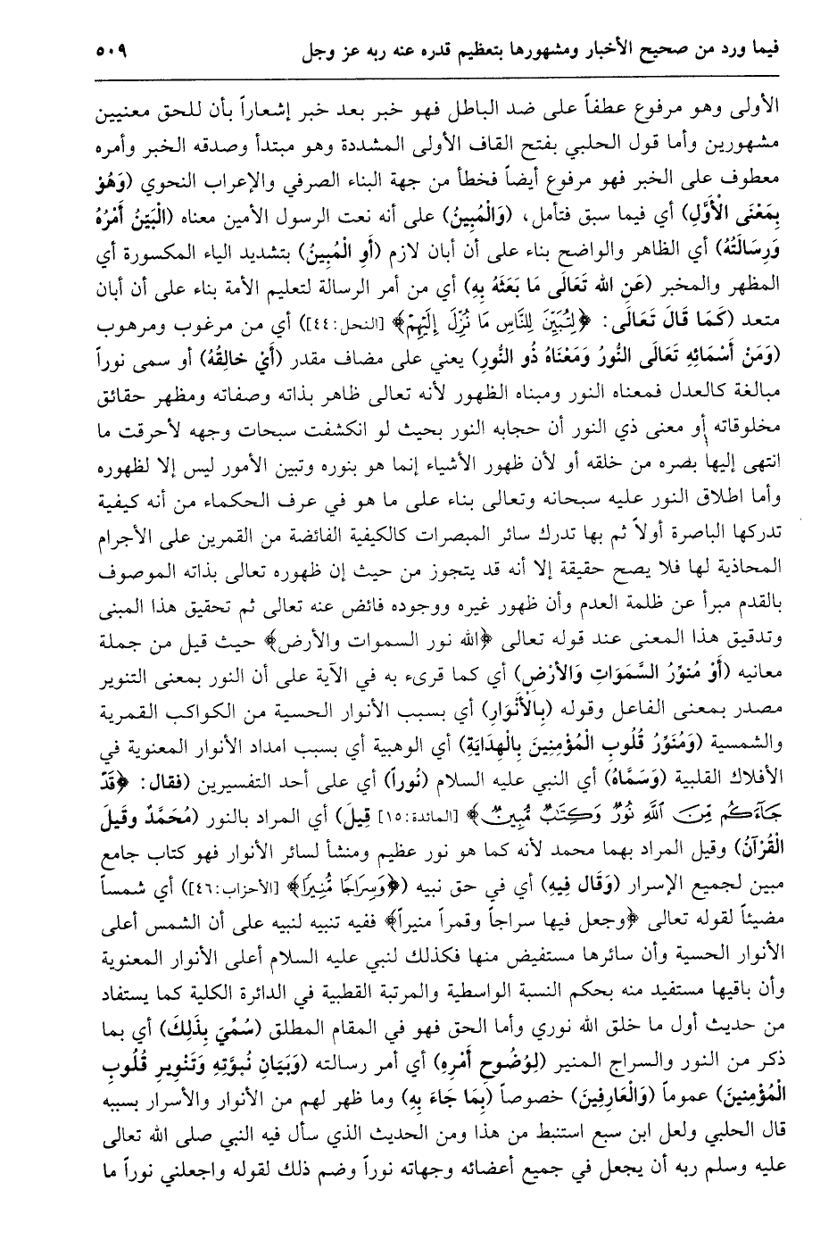 الأولى وهو مرفوع عطفا على ضد الباطل فهو خبر بعد خبر إشعارا بأن للحق معنيين مشهورين وأما قول الحلبي بفتح القاف الأولى المشددة وهو مبتدأ وصدقه الخبر وأمره معطوف على الخبر فهو مرفوع أيضا فخطأ من جهة البناء الصرفي والإعراب النحوي (وهو بمعنى الأوّل) أي فيما سبق فتأمل، (والمبين) على أنه نعت الرسول الأمين معناه (البين أمره ورسالته) أي الظاهر والواضح بناء على أن أبان لازم (أو المبين) بتشديد الياء المكسورة أي المظهر والمخبر (عن الله تعالى ما بعثه به) أي من أمر الرسالة لتعليم الأمة بناء على أن أبان متعد (كَمَا قَالَ تَعَالَى: لِتُبَيِّنَ لِلنَّاسِ مَا نُزِّلَ إِلَيْهِمْ [النحل: 44] ) أي من مرغوب ومرهوب (وَمِنْ أَسْمَائِهِ تَعَالَى النُّورُ وَمَعْنَاهُ ذُو النُّورِ) يعني على مضاف مقدر (أي خالقه) أو سمى نورا مبالغة كالعدل فمعناه النور ومبناه الظهور لأنه تعالى ظاهر بذاته وصفاته ومظهر حقائق مخلوقاته أو معنى ذي النور أن حجابه النور بحيث لو انكشفت سبحات وجهه لأحرقت ما انتهى إليها بصره من خلقه أو لأن ظهور الأشياء إنما هو بنوره وتبين الأمور ليس إلا لظهوره وأما اطلاق النور عليه سبحانه وتعالى بناء على ما هو في عرف الحكماء من أنه كيفية تدركها الباصرة أولا ثم بها تدرك سائر المبصرات كالكيفية الفائضة من القمرين على الأجرام المحاذية لها فلا يصح حقيقة إلا أنه قد يتجوز من حيث إن ظهوره تعالى بذاته الموصوف بالقدم مبرأ عن ظلمة العدم وأن ظهور غيره ووجوده فائض عنه تعالى ثم تحقيق هذا المبنى وتدقيق هذا المعنى عند قوله تعالى اللَّهُ نُورُ السَّماواتِ وَالْأَرْضِ حيث قيل من جملة معانيه (أو منوّر السّموات والأرض) أي كما قرىء به في الآية على أن النور بمعنى التنوير مصدر بمعنى الفاعل وقوله (بالأنوار) أي بسبب الأنوار الحسية من الكواكب القمرية والشمسية (ومنوّر قلوب المؤمنين بالهداية) أي الوهبية أي بسبب امداد الأنوار المعنوية في الأفلاك القلبية (وسمّاه) أي النبي عليه السلام (نورا) أي على أحد التفسيرين (فَقَالَ: قَدْ جاءَكُمْ مِنَ اللَّهِ نُورٌ وَكِتابٌ مُبِينٌ [المائدة: 15] قيل) أي المراد بالنور (محمّد وقيل القرآن) وقيل المراد بهما محمد لأنه كما هو نور عظيم ومنشأ لسائر الأنوار فهو كتاب جامع مبين لجميع الإسرار (وقال فيه) أي في حق نبيه (وَسِراجاً مُنِيراً [الأحزاب: 46] ) أي شمسا مضيئا لقوله تعالى وَجَعَلَ فِيها سِراجاً وَقَمَراً مُنِيراً ففيه تنبيه لنبيه على أن الشمس أعلى الأنوار الحسية وأن سائرها مستفيض منها فكذلك لنبي عليه السلام أعلى الأنوار المعنوية وأن باقيها مستفيد منه بحكم النسبة الواسطية والمرتبة القطبية في الدائرة الكلية كما يستفاد من حديث أول ما خلق الله نوري وأما الحق فهو في المقام المطلق (سمّي بذلك) أي بما ذكر من النور والسراج المنير (لوضوح أمره) أي أمر رسالته (وبيان نبوّته وتنوير قلوب المؤمنين) عموما (والعارفين) خصوصا (بما جاء به) وما ظهر لهم من الأنوار والأسرار بسببه قال الحلبي ولعل ابن سبع استنبط من هذا ومن الحديث الذي سأل فيه النبي صلى الله تعالى عليه وسلم ربه أن يجعل في جميع أعضائه وجهاته نورا وضم ذلك لقوله واجعلني نورا ما