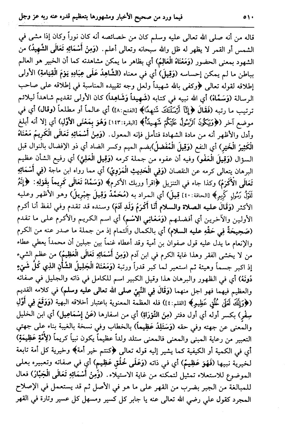 قاله من أنه صلى الله تعالى عليه وسلم كان من خصائصه أنه كان نورا وكان إذا مشى في الشمس أو القمر لا يظهر له ظل والله سبحانه وتعالى أعلم. (ومن أسمائه تعالى الشّهيد) من الشهود بمعنى الحضور (ومعناه العالم) أي بظاهر ما يمكن مشاهدته كما أن الخبير هو العالم بباطن ما لم يمكن إحساسه (وقيل) أي في معناه (الشّاهد على عباده يوم القيامة) الأولى إطلاقه لقوله تعالى وَكَفى بِاللَّهِ شَهِيداً ولعل وجه تقييده المناسبة في إطلاقه على صاحب الرسالة (وسمّاه) أي الله نبيه في كتابه (شهيدا وشاهدا) كان الأولى تقديم شاهدا ليلائم ترتيب ما رتبه (فقال إِنَّا أَرْسَلْناكَ شاهِداً [الفتح: 8] ) أي عالما أو مطلعا (وقال) أي في موضع آخر (وَيَكُونَ الرَّسُولُ عَلَيْكُمْ شَهِيداً [الْبَقَرَةِ: 143] وَهُوَ بِمَعْنَى الأوّل) أي إلا أنه أبلغ وأدل والأظهر أنه من مادة الشهادة فتأمل فإنه المعول. (ومن أسمائه تعالى الكريم معناه الكثير الخير) أي النفع (وقيل المفضل) بضم الميم وكسر الضاد أي ذو الإفضال بالنوال قبل السؤال (وقيل العفو) وفيه أن عفوه من جملة كرمه (وقيل العليّ) أي رفيع الشأن عظيم البرهان يتعالى كرمه عن النقصان (وفي الحديث المرويّ) أي مما رواه ابن ماجة (في أسمائه تعالى الأكرم) وكذا جاء في التنزيل اقْرَأْ وَرَبُّكَ الْأَكْرَمُ (وَسَمَّاهُ تَعَالَى كَرِيمًا بِقَوْلِهِ: إِنَّهُ لَقَوْلُ رَسُولٍ كَرِيمٍ [الحاقة: 40] قيل) أي المراد به (محمّد وقيل جبريل) وهو الأظهر وعليه الأكثر (وقال عليه الصلاة والسلام أنا أكرم ولد آدم) وسنده قد تقدم وفي لفظ أنا أكرم الأولين والآخرين أي أفضلهم (ومعاني الاسم) أي اسم الكريم والأكرم على ما تقدم (صحيحة في حقّه عليه السلام) أي بالكمال والتمام إذ من جملة ما صدر عنه من الكرم والإنعام ما يدل عليه قول صفوان بن أمية وقد أعطاه غنما بين جبلين أن محمدا يعطي عطاء من لا يخشى الفقر وهذا غاية الكرم في ابن آدم (ومن أسمائه تعالى العظيم) من عظم الشيء إذ اكبر جسما وهيئة ثم استعير لما كبر قدرا ورتبة (وَمَعْنَاهُ الْجَلِيلُ الشَّأْنِ الَّذِي كُلُّ شَيْءٍ دُونَهُ) أي في الظهور والبرهان هذا وقيل الكبير اسم للكامل في ذاته والجليل في صفاته والعظيم فيهما فهو اجل منهما (وقال في النّبيّ صلى الله تعالى عليه وسلم) في كلامه القديم (وَإِنَّكَ لَعَلى خُلُقٍ عَظِيمٍ [القلم: 4] ) فله العظمة المعنوية باعتبار أخلاقه البهية (ووقع في أوّل سفر) بكسر أوله أي أول دفتر (من التّوراة) أي من اسفارها (عن إسماعيل) أي ابن الخليل والمعنى عن جهته وفي حقه (وستلد عظيما) بالخطاب وفي نسخة بالغيبة بناء على جهتي التعبير من رعاية المبنى والمعنى فالمعنى ستلد ولدا عظيما يكون نبيا كريما (لأمّة عظيمة) أي في الكمية أو الكيفية كما يشير إليه قوله تعالى كُنْتُمْ خَيْرَ أُمَّةٍ وخيرية كل أمة تابعة لخيرية نبيها (فهو عظيم) أي في ذاته (وعلى خلق عظيم) أي في صفاته وتعبيره بعلى الموضوع للاستعلاء تمثيل لتمكنه من غاية الاستيلاء. (ومن أسمائه تعالى الجبّار) فعال للمبالغة من الجبر بضرب من القهر على ما هو في الأصل ثم قد يستعمل في الإصلاح المجرد كقول علي رضي الله تعالى عنه يا جابر كل كسير ومسهل كل عسير وتارة في القهر