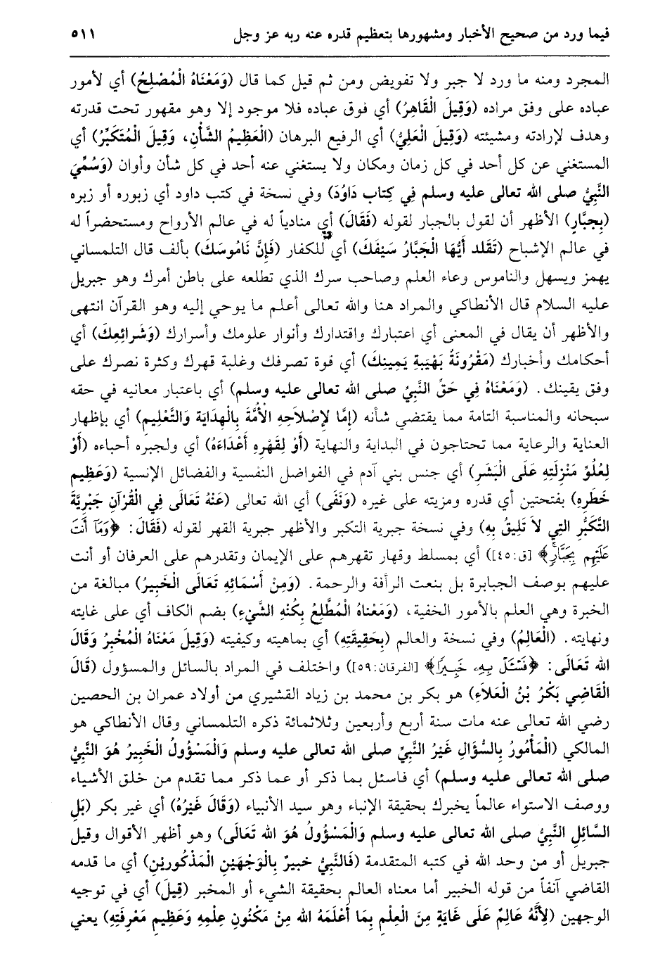 المجرد ومنه ما ورد لا جبر ولا تفويض ومن ثم قيل كما قال (ومعناه المصلح) أي لأمور عباده على وفق مراده (وقيل القاهر) أي فوق عباده فلا موجود إلا وهو مقهور تحت قدرته وهدف لإرادته ومشيئته (وقيل العليّ) أي الرفيع البرهان (العظيم الشّأن، وقيل المتكبّر) أي المستغني عن كل أحد في كل زمان ومكان ولا يستغني عنه أحد في كل شأن وأوان (وسمّي النّبيّ صلى الله تعالى عليه وسلم في كتاب داود) وفي نسخة في كتب داود أي زبوره أو زبره (بجبّار) الأظهر أن لقول بالجبار لقوله (فقال) أي مناديا له في عالم الأرواح ومستحضرا له في عالم الإشباح (تقلد أيّها الجبّار سيفك) أي للكفار (فإنّ ناموسك) بألف قال التلمساني يهمز ويسهل والناموس وعاء العلم وصاحب سرك الذي تطلعه على باطن أمرك وهو جبريل عليه السلام قال الأنطاكي والمراد هنا والله تعالى أعلم ما يوحي إليه وهو القرآن انتهى والأظهر أن يقال في المعنى أي اعتبارك واقتدارك وأنوار علومك وأسرارك (وشرائعك) أي أحكامك وأخبارك (مقرونة بهيبة يمينك) أي قوة تصرفك وغلبة قهرك وكثرة نصرك على وفق يقينك. (ومعناه في حقّ النّبيّ صلى الله تعالى عليه وسلم) أي باعتبار معانيه في حقه سبحانه والمناسبة التامة مما يقتضي شأنه (إمّا لإصلاحه الأمّة بالهداية والتّعليم) أي بإظهار العناية والرعاية مما تحتاجون في البداية والنهاية (أو لقهره أعداءه) أي ولجبره أحباءه (أو لعلوّ منزلته على البشر) أي جنس بني آدم في الفواضل النفسية والفضائل الإنسية (وعظيم خطره) بفتحتين أي قدره ومزيته على غيره (ونفى) أي الله تعالى (عَنْهُ تَعَالَى فِي الْقُرْآنِ جَبْرِيَّةَ التَّكَبُّرِ الَّتِي لا تليق به) وفي نسخة جبرية التكبر والأظهر جبرية القهر لقوله (فقال: وَما أَنْتَ عَلَيْهِمْ بِجَبَّارٍ [ق: 45] ) أي بمسلط وقهار تقهرهم على الإيمان وتقدرهم على العرفان أو أنت عليهم بوصف الجبابرة بل بنعت الرأفة والرحمة. (ومن أسمائه تعالى الخبير) مبالغة من الخبرة وهي العلم بالأمور الخفية، (ومعناه المطّلع بكنه الشّيء) بضم الكاف أي على غايته ونهايته. (العالم) وفي نسخة والعالم (بحقيقته) أي بماهيته وكيفيته (وقيل معناه المخبر وقال الله تعالى: فَسْئَلْ بِهِ خَبِيراً [الفرقان: 59] ) واختلف في المراد بالسائل والمسؤول (قال القاضي بكر بن العلاء) هو بكر بن محمد بن زياد القشيري من أولاد عمران بن الحصين رضي الله تعالى عنه مات سنة أربع وأربعين وثلاثمائة ذكره التلمساني وقال الأنطاكي هو المالكي (المأمور بالسّؤال غير النّبيّ صلى الله تعالى عليه وسلم والمسؤول الخبير هو النّبيّ صلى الله تعالى عليه وسلم) أي فاسئل بما ذكر أو عما ذكر مما تقدم من خلق الأشياء ووصف الاستواء عالما يخبرك بحقيقة الإنباء وهو سيد الأنبياء (وقال غيره) أي غير بكر (بل السّائل النّبيّ صلى الله تعالى عليه وسلم والمسؤول هو الله تعالى) وهو أظهر الأقوال وقيل جبريل أو من وحد الله في كتبه المتقدمة (فالنّبيّ خبير بالوجهين المذكورين) أي ما قدمه القاضي آنفا من قوله الخبير أما معناه العالم بحقيقة الشيء أو المخبر (قيل) أي في توجيه الوجهين (لِأَنَّهُ عَالِمٌ عَلَى غَايَةٍ مِنَ الْعِلْمِ بِمَا أَعْلَمَهُ اللَّهُ مِنْ مَكْنُونِ عِلْمِهِ وَعَظِيمِ مَعْرِفَتِهِ) يعني