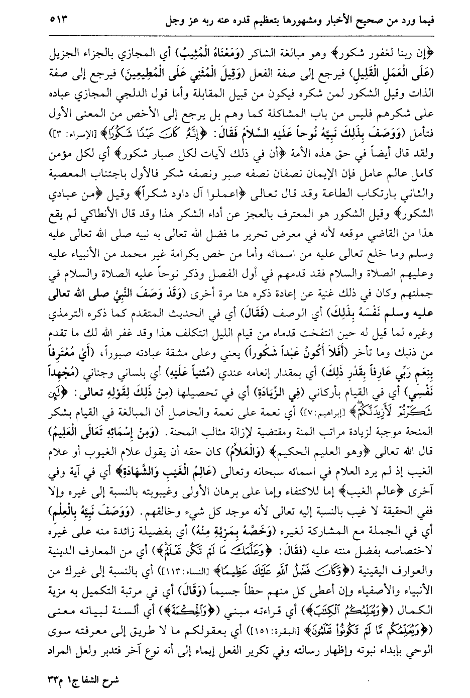 إِنَّ رَبَّنا لَغَفُورٌ شَكُورٌ وهو مبالغة الشاكر (ومعناه المثيب) أي المجازي بالجزاء الجزيل (على العمل القليل) فيرجع إلى صفة الفعل (وقيل المثني على المطيعين) فيرجع إلى صفة الذات وقيل الشكور لمن شكره فيكون من قبيل المقابلة وأما قول الدلجي المجازي عباده على شكرهم فليس من باب المشاكلة كما وهم بل يرجع إلى الأخص من المعنى الأول فتأمل (وَوَصَفَ بِذَلِكَ نَبِيَّهُ نُوحًا عَلَيْهِ السَّلَامُ فَقَالَ: إِنَّهُ كانَ عَبْداً شَكُوراً [الإسراء: 3] ) ولقد قال أيضا في حق هذه الأمة إِنَّ فِي ذلِكَ لَآياتٍ لِكُلِّ صَبَّارٍ شَكُورٍ أي لكل مؤمن كامل عالم عامل فإن الإيمان نصفان نصفه صبر ونصفه شكر فالأول باجتناب المعصية والثاني بارتكاب الطاعة وقد قال تعالى اعْمَلُوا آلَ داوُدَ شُكْراً وقيل مِنْ عِبادِيَ الشَّكُورُ وقيل الشكور هو المعترف بالعجز عن أداء الشكر هذا وقد قال الأنطاكي لم يقع هذا من القاضي موقعه لأنه في معرض تحرير ما فضل الله تعالى به نبيه صلى الله تعالى عليه وسلم وما خلع تعالى عليه من اسمائه وأما من خص بكرامة غير محمد من الأنبياء عليه وعليهم الصلاة والسلام فقد قدمهم في أول الفصل وذكر نوحا عليه الصلاة والسلام في جملتهم وكان في ذلك غنية عن إعادة ذكره هنا مرة أخرى (وقد وصف النّبيّ صلى الله تعالى عليه وسلم نفسه بذلك) أي الوصف (فقال) أي في الحديث المتقدم كما ذكره الترمذي وغيره لما قيل له حين انتفخت قدماه من قيام الليل اتتكلف هذا وقد غفر الله لَكَ مَا تَقَدَّمَ مِنْ ذَنْبِكَ وَمَا تَأَخَّرَ (أفلا أكون عبدا شكورا) يعني وعلى مشقة عبادته صبورا، (أي معترفا بنعم ربّي عارفا بقدر ذلك) أي بمقدار إنعامه عندي (مثنيا عليه) أي بلساني وجناني (مجهدا نفسي) أي في القيام بأركاني (في الزّيادة) أي في تحصيلها (مِنْ ذَلِكَ لِقَوْلِهِ تَعَالَى: لَئِنْ شَكَرْتُمْ لَأَزِيدَنَّكُمْ [إبراهيم: 7] ) أي نعمة على نعمة والحاصل أن المبالغة في القيام بشكر المنحة موجبة لزيادة مراتب المنة ومقتضية لإزالة مثالب المحنة. (ومن إسمائه تعالى العليم) قال الله تعالى وَهُوَ الْعَلِيمُ الْحَكِيمُ (والعلّام) كان حقه أن يقول علام الغيوب أو علام الغيب إذ لم يرد العلام في اسمائه سبحانه وتعالى (عالِمُ الْغَيْبِ وَالشَّهادَةِ أي في آية وفي آخرى عالِمِ الْغَيْبِ إما للاكتفاء وإما على برهان الأولى وغيبوبته بالنسبة إلى غيره وإلا ففي الحقيقة لا غيب بالنسبة إليه تعالى لأنه موجد كل شيء وخالقهم. (ووصف نبيّه بالعلم) أي في الجملة مع المشاركة لغيره (وخصّه بمزيّة منه) أي بفضيلة زائدة منه على غيره لاختصاصه بفضل منته عليه (فقال: وَعَلَّمَكَ ما لَمْ تَكُنْ تَعْلَمُ