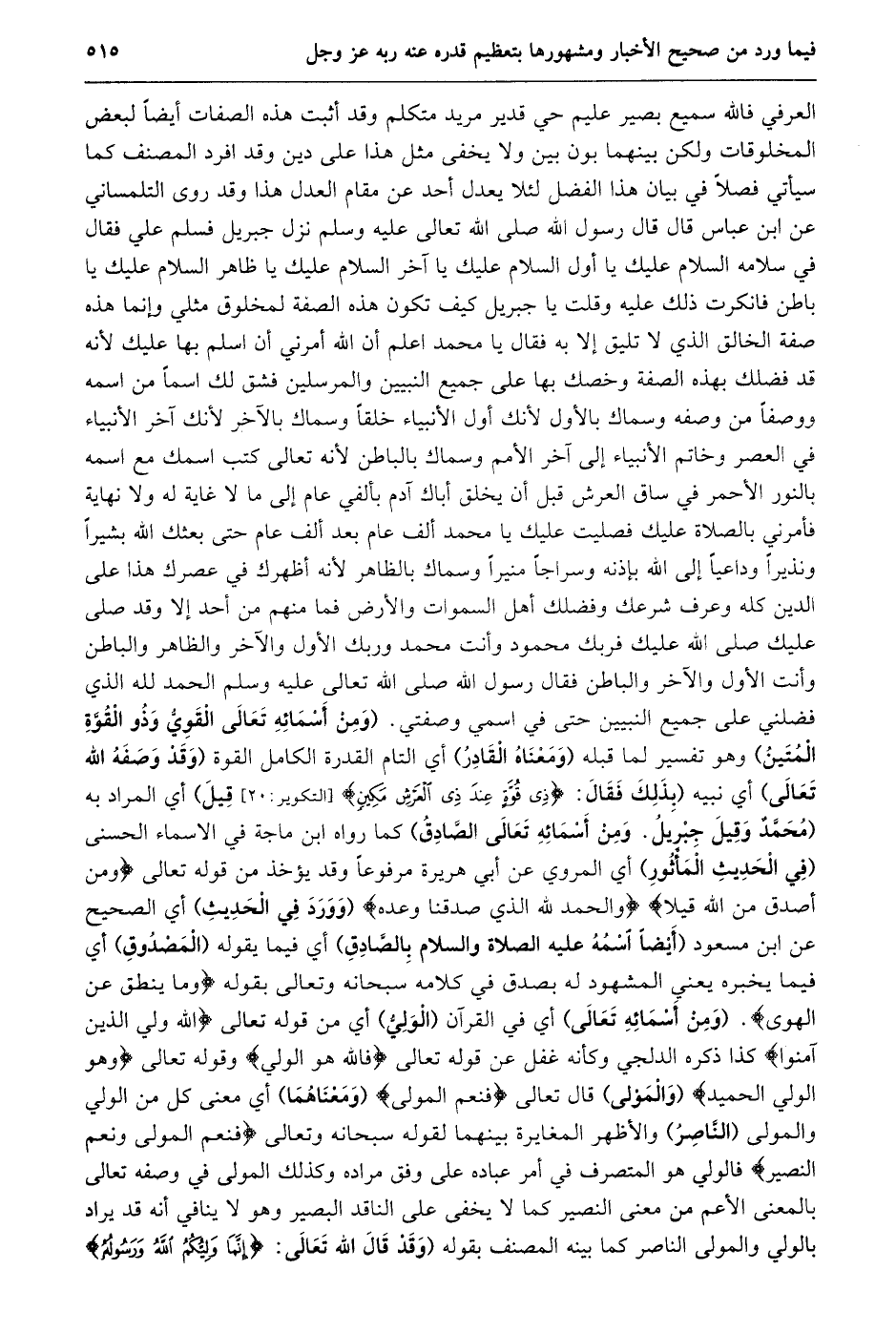 العرفي فالله سميع بصير عليم حي قدير مريد متكلم وقد أثبت هذه الصفات أيضا لبعض المخلوقات ولكن بينهما بون بين ولا يخفى مثل هذا على دين وقد افرد المصنف كما سيأتي فصلا في بيان هذا الفضل لئلا يعدل أحد عن مقام العدل هذا وقد روى التلمساني عن ابن عباس قال قال رسول الله صلى الله تعالى عليه وسلم نزل جبريل فسلم علي فقال في سلامه السلام عليك يا أول السلام عليك يا آخر السلام عليك يا ظاهر السلام عليك يا باطن فانكرت ذلك عليه وقلت يا جبريل كيف تكون هذه الصفة لمخلوق مثلي وإنما هذه صفة الخالق الذي لا تليق إلا به فقال يا محمد اعلم أن الله أمرني أن اسلم بها عليك لأنه قد فضلك بهذه الصفة وخصك بها على جميع النبيين والمرسلين فشق لك اسما من اسمه ووصفا من وصفه وسماك بالأول لأنك أول الأنبياء خلقا وسماك بالآخر لأنك آخر الأنبياء في العصر وخاتم الأنبياء إلى آخر الأمم وسماك بالباطن لأنه تعالى كتب اسمك مع اسمه بالنور الأحمر في ساق العرش قبل أن يخلق أباك آدم بألفي عام إلى ما لا غاية له ولا نهاية فأمرني بالصلاة عليك فصليت عليك يا محمد ألف عام بعد ألف عام حتى بعثك الله بشيرا وَنَذِيرًا وَدَاعِيًا إِلَى اللَّهِ بِإِذْنِهِ وَسِرَاجًا مُنِيرًا وسماك بالظاهر لأنه أظهرك في عصرك هذا على الدين كله وعرف شرعك وفضلك أهل السموات والأرض فما منهم من أحد إلا وقد صلى عليك صلى الله عليك فربك محمود وأنت محمد وربك الأول والآخر والظاهر والباطن وأنت الأول والآخر والباطن فقال رسول الله صلى الله تعالى عليه وسلم الحمد لله الذي فضلني على جميع النبيين حتى في اسمي وصفتي. (وَمِنْ أَسْمَائِهِ تَعَالَى الْقَوِيُّ وَذُو الْقُوَّةِ الْمَتِينُ) وهو تفسير لما قبله (ومعناه القادر) أي التام القدرة الكامل القوة (وقد وصفه الله تعالى) أي نبيه (بِذَلِكَ فَقَالَ: ذِي قُوَّةٍ عِنْدَ ذِي الْعَرْشِ مَكِينٍ [التكوير: 20] قيل) أي المراد به (مُحَمَّدٌ وَقِيلَ جِبْرِيلُ. وَمِنْ أَسْمَائِهِ تَعَالَى الصَّادِقُ) كما رواه ابن ماجة في الاسماء الحسنى (في الحديث المأثور) أي المروي عن أبي هريرة مرفوعا وقد يؤخذ من قوله تعالى وَمَنْ أَصْدَقُ مِنَ اللَّهِ قِيلًا والْحَمْدُ لِلَّهِ الَّذِي صَدَقَنا وَعْدَهُ (وورد في الحديث) أي الصحيح عن ابن مسعود (أيضا اسمه عليه الصلاة والسلام بالصّادق) أي فيما يقوله (المصدوق) أي فيما يخبره يعني المشهود له بصدق في كلامه سبحانه وتعالى بقوله وَما يَنْطِقُ عَنِ الْهَوى. (ومن أسمائه تعالى) أي في القرآن (الوليّ) أي من قوله تعالى اللَّهُ وَلِيُّ الَّذِينَ آمَنُوا كذا ذكره الدلجي وكأنه غفل عن قوله تعالى فَاللَّهُ هُوَ الْوَلِيُّ وقوله تعالى وَهُوَ الْوَلِيُّ الْحَمِيدُ (والمولى) قال تعالى فَنِعْمَ الْمَوْلى (ومعناهما) أي معنى كل من الولي والمولى (النّاصر) والأظهر المغايرة بينهما لقوله سبحانه وتعالى فَنِعْمَ الْمَوْلى وَنِعْمَ النَّصِيرُ فالولي هو المتصرف في أمر عباده على وفق مراده وكذلك المولى في وصفه تعالى بالمعنى الأعم من معنى النصير كما لا يخفى على الناقد البصير وهو لا ينافي أنه قد يراد بالولي والمولى الناصر كما بينه المصنف بقوله (وَقَدْ قَالَ اللَّهُ تَعَالَى: إِنَّما وَلِيُّكُمُ اللَّهُ وَرَسُولُهُ