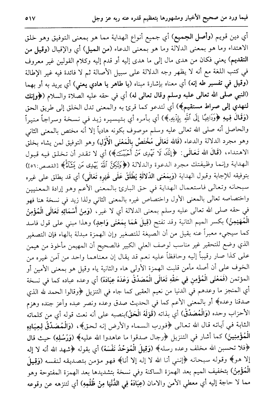 أي دين قويم (وأصل الجميع) أي جميع أنواع الهداية مما هو بمعنى التوفيق وهو خلق الاهتداء وما هو بمعنى الدلالة وما هو بمعنى الدعاء (من الميل) أي والإقبال (وقيل من التقديم) يعني فكان من هدى مال إلى ما هدى إليه أو قدم إليه وكلام القولين غير معروف في كتب اللغة مع أنه لا يظهر وجه الدلالة على سبيل الأصالة ثم لا فائدة فيه غير الإطالة (وقيل في تفسير طه إنه) أي معناه بإشارة مبناه (يا طاهر يا هادي يعني) أي يريد به أو بهما (النبي صلى الله تعالى عليه وسلم وقال تعالى له) أي في حقه عليه الصلاة والسلام (وَإِنَّكَ لَتَهْدِي إِلى صِراطٍ مُسْتَقِيمٍ) أي لتدعو كما قرئ به والمعنى تدل الخلق إلى طريق الحق (وقال فيه وَداعِياً إِلَى اللَّهِ بِإِذْنِهِ) أي بأمره أي بتيسيره زيد في نسخة وسراجا منيرا والحاصل أنه صلى الله تعالى عليه وسلم موصوف بكونه هاديا إلا أنه مختص بالمعنى الثاني وهو مجرد الدلالة والدعاء (فالله تعالى مختصّ بالمعنى الأوّل) وهو التوفيق لمن يشاء بخلق الاهتداء، (قال الله تعالى: إِنَّكَ لا تَهْدِي مَنْ أَحْبَبْتَ) أي لا تقدر أن تخلق فيه قبول الهداية وإنما وظيفتك مجرد الدعوة والدلالة (وَلكِنَّ اللَّهَ يَهْدِي مَنْ يَشاءُ [القصص: 56] ) بتوفيقه للإجابة وقبول الهداية (وبمعنى الدّلالة يطلق على غيره تعالى) أي قد يطلق على غيره سبحانه وتعالى فاستعمال الهداية في حق البارئ بالمعنى الأعم وهو إرادة المعنيين واختصاصه تعالى بالمعنى الأول واختصاص غيره بالمعنى الثاني ولذا زيد في نسخة هنا فهو في حقه صلى الله تعالى عليه وسلم بمعنى الدلالة أي لا غير، (ومن أسمائه تعالى المؤمن المهيمن) بكسر الميم الثانية وقد تفتح (قيل هما بمعنى واحد) وهذا مبني على قول فاسد كما سيجيء معبرا عنه بقيل من أن الصيغة للتصغير وإن الهمزة مبدلة بالهاء فإن التصغير الذي وضع للتحقير غير مناسب لوصف العلي الكبير فالصحيح أن المهيمن مأخوذ من هيمن على كذا صار رقيبا إليه وحافظا عليه نعم قد يقال إن معناهما واحد من آمن غيره من الخوف على أن أصله مأمن قلبت الهمزة الأولى هاء والثانية ياء وقيل هو بمعنى الأمين أو المؤتمن (فَمَعْنَى الْمُؤْمِنِ فِي حَقِّهِ تَعَالَى الْمُصَدِّقُ وَعْدَهُ عباده) أي وعده عباده كما في نسخة أي المنجز ما وعدهم في الدنيا من نعيم العقبى كما جاء في التنزيل وَقالُوا الْحَمْدُ لِلَّهِ الَّذِي صَدَقَنا وَعْدَهُ أو بالمعنى الأعم كما في الحديث صدق وعده ونصر عبده وأعز جنده وهزم الأحزاب وحده (والمصدّق) أي بذاته (قوله الحقّ) بنصبه على أنه نعت قوله أي من كلماته الثابتة في آياته قال الله تعالى فَوَ رَبِّ السَّماءِ وَالْأَرْضِ إِنَّهُ لَحَقٌّ، (والمصدّق لعباده المؤمنين) كما أشار في التنزيل رِجالٌ صَدَقُوا ما عاهَدُوا اللَّهَ عَلَيْهِ (ورسله) حيث قال فَلا تَحْسَبَنَّ اللَّهَ مُخْلِفَ وَعْدِهِ رُسُلَهُ (وقيل الموحّد نفسه) أي بقوله شَهِدَ اللَّهُ أَنَّهُ لا إِلهَ إِلَّا هُوَ وقوله سبحانه إِنَّنِي أَنَا اللَّهُ لا إِلهَ إِلَّا أَنَا فهو مؤمن بتصديقه لنفسه (وقيل المؤمن) بتخفيف الميم بعد الهمزة الساكنة وفي نسخة بتشديدها بعد الهمزة المفتوحة وهو مما لا حاجة إليه أي معطي الأمن والامان (عباده في الدّنيا من ظلمه) أي لتنزهه عن وقوعه
