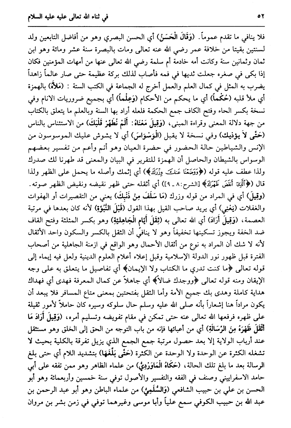 فلا ينافي ما تقدم عموما. (وقال الحسن) أي الحسن البصري وهو من أفاضل التابعين ولد لسنتين بقيتا من خلافة عمر رضي الله عنه تعالى ومات بالبصرة سنة عشر ومائة وهو ابن ثمان وثمانين سنة وكانت أمه خادمة أم سلمة رضي الله تعالى عنها من أمهات المؤمنين فكان إذا بكى في صغره جعلت ثديها في فمه فأصاب لذلك بركة عظيمة حتى صار عالما زاهدا يضرب به المثل في كمال العلم والعمل أخرج له الجماعة في الكتب الستة: (ملأه) بالهمزة أي ملأ قلبه (حكما) أي ما يحكم من الأحكام (وعلما) أي بجميع ضروريات الانام وفي نسخة بكسر الحاء وفتح الكاف جمع الحكمة فلعله أراد بها السنة وبالعلم ما يتعلق بالكتاب من جهة دلالة المعنى وقراءة المبنى، (وقيل معناه: ألم نطهّر قلبك) من الاستئناس بالناس (حتّى لا يؤذيك) وفي نسخة لا يقبل (الوسواس) أي لا يشوش عليك الموسوسون من الإنس والشياطين حالة الحضور في حضرة العيان وهو أتم وأعم من تفسير بعضهم الوسواس بالشيطان والحاصل أن الهمزة للتقرير في البيان والمعنى قد طهرنا لك صدرك ولذا عطف عليه قوله (وَوَضَعْنا عَنْكَ وِزْرَكَ) أي إثمك وأصله ما يحمل على الظهر ولذا قال (الَّذِي أَنْقَضَ ظَهْرَكَ [الشرح: 8- 9] ) أي أثقله حتى ظهر نقيضه ونقيض الظهر صوته.