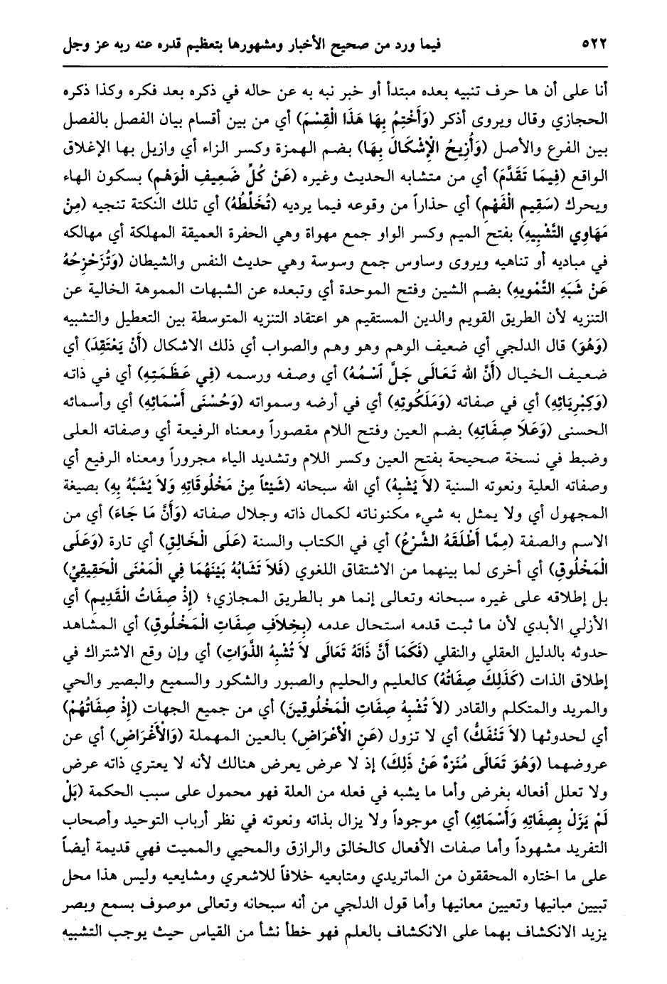 أنا على أن ها حرف تنبيه بعده مبتدأ أو خبر نبه به عن حاله في ذكره بعد فكره وكذا ذكره الحجازي وقال ويروى أذكر (وأختم بها هذا القسم) أي من بين أقسام بيان الفصل بالفصل بين الفرع والأصل (وأزيح الإشكال بها) بضم الهمزة وكسر الزاء أي وازيل بها الإغلاق الواقع (فيما تقدّم) أي من متشابه الحديث وغيره (عن كلّ ضعيف الوهم) بسكون الهاء ويحرك (سقيم الفهم) أي حذارا من وقوعه فيما يرديه (تخلّطه) أي تلك النكتة تنجيه (من مهاوي التّشبيه) بفتح الميم وكسر الواو جمع مهواة وهي الحفرة العميقة المهلكة أي مهالكه في مباديه أو تناهيه ويروى وساوس جمع وسوسة وهي حديث النفس والشيطان (وتزحزحه عن شبه التّمويه) بضم الشين وفتح الموحدة أي وتبعده عن الشبهات المموهة الخالية عن التنزيه لأن الطريق القويم والدين المستقيم هو اعتقاد التنزيه المتوسطة بين التعطيل والتشبيه (وهو) قال الدلجي أي ضعيف الوهم وهو وهم والصواب أي ذلك الاشكال (أن يعتقد) أي ضعيف الخيال (أنّ الله تعالى جلّ اسمه) أي وصفه ورسمه (في عظمته) أي في ذاته (وكبريائه) أي في صفاته (وملكوته) أي في أرضه وسمواته (وحسنى أسمائه) أي وأسمائه الحسنى (وعلا صفاته) بضم العين وفتح اللام مقصورا ومعناه الرفيعة أي وصفاته العلى وضبط في نسخة صحيحة بفتح العين وكسر اللام وتشديد الياء مجرورا ومعناه الرفيع أي وصفاته العلية ونعوته السنية (لا يشبه) أي الله سبحانه (شيئا من مخلوقاته ولا يشبّه به) بصيغة المجهول أي ولا يمثل به شيء مكنوناته لكمال ذاته وجلال صفاته (وأنّ ما جاء) أي من الاسم والصفة (ممّا أطلقه الشّرع) أي في الكتاب والسنة (على الخالق) أي تارة (وعلى المخلوق) أي أخرى لما بينهما من الاشتقاق اللغوي (فلا تشابه بينهما في المعنى الحقيقيّ) بل إطلاقه على غيره سبحانه وتعالى إنما هو بالطريق المجازي؛ (إذ صفات القديم) أي الأزلي الأبدي لأن ما ثبت قدمه استحال عدمه (بخلاف صفات المخلوق) أي المشاهد حدوثه بالدليل العقلي والنقلي (فكما أنّ ذاته تعالى لا تشبه الذّوات) أي وإن وقع الاشتراك في إطلاق الذات (كذلك صفاته) كالعليم والحليم والصبور والشكور والسميع والبصير والحي والمريد والمتكلم والقادر (لا تشبه صفات المخلوقين) أي من جميع الجهات (إذ صفاتهم) أي لحدوثها (لا تنفكّ) أي لا تزول (عن الأعراض) بالعين المهملة (والأغراض) أي عن عروضهما (وهو تعالى منزه عن ذلك) إذ لا عرض يعرض هنالك لأنه لا يعتري ذاته عرض ولا تعلل أفعاله بغرض وأما ما يشبه في فعله من العلة فهو محمول على سبب الحكمة (بل لم يزل بصفاته وأسمائه) أي موجودا ولا يزال بذاته ونعوته في نظر أرباب التوحيد وأصحاب التفريد مشهودا وأما صفات الأفعال كالخالق والرازق والمحيي والمميت فهي قديمة أيضا على ما اختاره المحققون من الماتريدي ومتابعيه خلافا للاشعري ومشايعيه وليس هذا محل تبيين مبانيها وتعيين معانيها وأما قول الدلجي من أنه سبحانه وتعالى موصوف بسمع وبصر يزيد الانكشاف بهما على الانكشاف بالعلم فهو خطأ نشأ من القياس حيث يوجب التشبيه