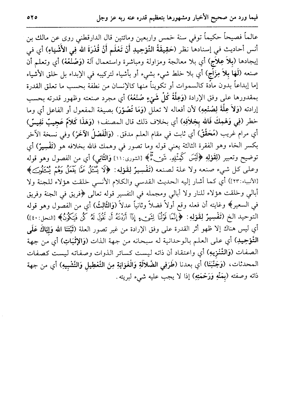 عالما فصيحا حكيما توفي سنة خمس واربعين ومائتين قال الدارقطني روى عن مالك بن أنس أحاديث في إسنادها نظر (حَقِيقَةُ التَّوْحِيدِ أَنْ تَعْلَمَ أَنَّ قُدْرَةَ اللَّهِ في الأشياء) أي في إيجادها (بلا علاج) أي بلا معالجة ومزاولة ومباشرة واستعمال آلة (وصنعه) أي وتعلم أن صنعه (لها بلا مزاج) أي بلا خلط شيء بشيء أو بأشياء لتركيبه في الإبداء بل خلق الأشياء إما إبداعا بدون مادة كالسموات أو تكوينا منها كالإنسان من نطفة بحسب ما تعلق القدرة بمقدورها على وفق الإرادة (وعلّة كلّ شيء صنعه) أي مجرد صنعته وظهور قدرته بحسب إرادته (ولا علّة لصنعه) لأن أفعاله لا تعلل (وما تصوّر) بصيغة المفعول أو الفاعل أي وما خطر (في وهمك فالله بخلافه) أي بخلاف ذلك قال المصنف؛ (وهذا كلام عجيب نفيس) أي مرام غريب (محقّق) أي ثابت في مقام العلم مدقق. (والفضل الآخر) وفي نسخة الآخر بكسر الخاء وهو الفقرة الثالثة يعني قوله وما تصور في وهمك فالله بخلافه هو (تفسير) أي توضيح وتعبير (لقوله لَيْسَ كَمِثْلِهِ شَيْءٌ [الشورى: 11] والثّاني) أي من الفصول وهو قوله وعلى كل شيء صنعه ولا علة لصنعه (تفسير لقوله: لا يُسْئَلُ عَمَّا يَفْعَلُ وَهُمْ يُسْئَلُونَ [الأنبياء: 23] ) أي كما أشار إليه الحديث القدسي والكلام الأنسي خلقت هؤلاء للجنة ولا أبالي وخلقت هؤلاء للنار ولا أبالي ومجمله في التفسير قوله تعالى فَرِيقٌ فِي الْجَنَّةِ وَفَرِيقٌ فِي السَّعِيرِ وغايته أن فعله وقع أولا فضلا وثانيا عدلا (والثّالث) أي من الفصول وهو قوله التوحيد الخ (تَفْسِيرٌ لِقَوْلِهِ: إِنَّما قَوْلُنا لِشَيْءٍ إِذا أَرَدْناهُ أَنْ نَقُولَ لَهُ كُنْ فَيَكُونُ [النحل: 40] ) أي ليس هناك إلا ظهور أثر القدرة على وفق الإرادة من غير تصور العلة (ثبّتنا الله وإيّاك على التّوحيد) أي على العلم بالوحدانية له سبحانه من جهة الذات (والإثبات) أي من جهة الصفات (والتّنزيه) أي واعتقاد أن ذاته ليست كسائر الذوات وصفاته ليست كصفات المحدثات، (وجنّبنا) أي بعدنا (طرفي الضّلالة والغواية من التّعطيل والتّشبيه) أي من جهة ذاته وصفته (بمنّه ورحمته) إذا لا يجب عليه شيء لبريته.
