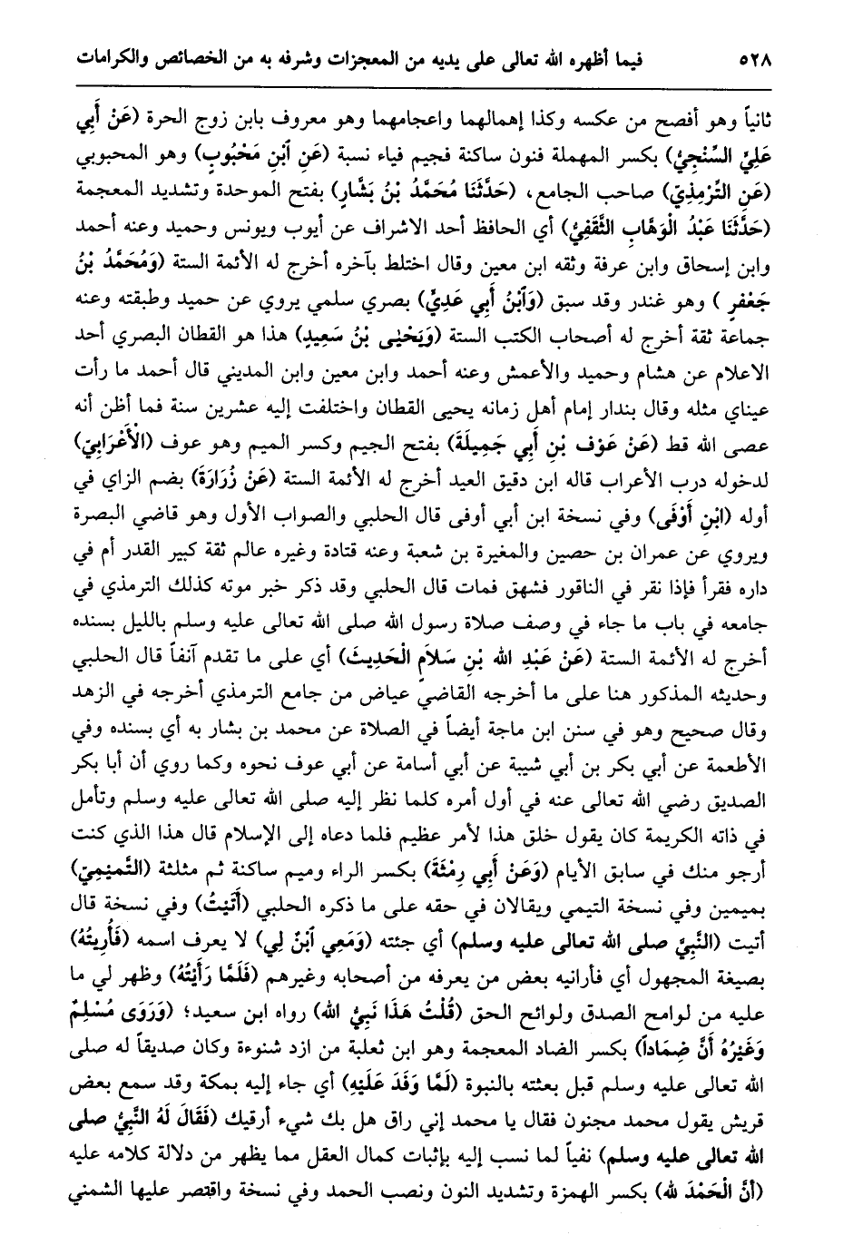 ثانيا وهو أفصح من عكسه وكذا إهمالهما واعجامهما وهو معروف بابن زوج الحرة (عن أبي عليّ السّنجيّ) بكسر المهملة فنون ساكنة فجيم فياء نسبة (عن ابن محبوب) وهو المحبوبي (عن التّرمذيّ) صاحب الجامع، (حدّثنا محمّد بن بشّار) بفتح الموحدة وتشديد المعجمة (حدّثنا عبد الوهّاب الثّقفيّ) أي الحافظ أحد الاشراف عن أيوب ويونس وحميد وعنه أحمد وابن إسحاق وابن عرفة وثقه ابن معين وقال اختلط بآخره أخرج له الأئمة الستة (ومحمّد بن جعفر) وهو غندر وقد سبق (وابن أبي عديّ) بصري سلمي يروي عن حميد وطبقته وعنه جماعة ثقة أخرج له أصحاب الكتب الستة (ويحيى بن سعيد) هذا هو القطان البصري أحد الاعلام عن هشام وحميد والأعمش وعنه أحمد وابن معين وابن المديني قال أحمد ما رأت عيناي مثله وقال بندار إمام أهل زمانه يحيى القطان واختلفت إليه عشرين سنة فما أظن أنه عصى الله قط (عن عوف بن أبي جميلة) بفتح الجيم وكسر الميم وهو عوف (الأعرابيّ) لدخوله درب الأعراب قاله ابن دقيق العيد أخرج له الأئمة الستة (عن زرارة) بضم الزاي في أوله (ابن أوفى) وفي نسخة ابن أبي أوفى قال الحلبي والصواب الأول وهو قاضي البصرة ويروي عن عمران بن حصين والمغيرة بن شعبة وعنه قتادة وغيره عالم ثقة كبير القدر أم في داره فقرأ فإذا نقر في الناقور فشهق فمات قال الحلبي وقد ذكر خبر موته كذلك الترمذي في جامعه في باب ما جاء في وصف صلاة رسول الله صلى الله تعالى عليه وسلم بالليل بسنده أخرج له الأئمة الستة (عن عبد الله بن سلام الحديث) أي على ما تقدم آنفا قال الحلبي وحديثه المذكور هنا على ما أخرجه القاضي عياض من جامع الترمذي أخرجه في الزهد وقال صحيح وهو في سنن ابن ماجة أيضا في الصلاة عن محمد بن بشار به أي بسنده وفي الأطعمة عن أبي بكر بن أبي شيبة عن أبي أسامة عن أبي عوف نحوه وكما روي أن أبا بكر الصديق رضي الله تعالى عنه في أول أمره كلما نظر إليه صلى الله تعالى عليه وسلم وتأمل في ذاته الكريمة كان يقول خلق هذا لأمر عظيم فلما دعاه إلى الإسلام قال هذا الذي كنت أرجو منك في سابق الأيام (وعن أبي رمثة) بكسر الراء وميم ساكنة ثم مثلثة (التّميميّ) بميمين وفي نسخة التيمي ويقالان في حقه على ما ذكره الحلبي (أتيت) وفي نسخة قال أتيت (النّبيّ صلى الله تعالى عليه وسلم) أي جئته (ومعي ابن لي) لا يعرف اسمه (فأريته) بصيغة المجهول أي فأرانيه بعض من يعرفه من أصحابه وغيرهم (فلمّا رأيته) وظهر لي ما عليه من لوامح الصدق ولوائح الحق (قلت هذا نبيّ الله) رواه ابن سعيد؛ (وروى مسلم وغيره أنّ ضمادا) بكسر الضاد المعجمة وهو ابن ثعلبة من ازد شنوءة وكان صديقا له صلى الله تعالى عليه وسلم قبل بعثته بالنبوة (لمّا وفد عليه) أي جاء إليه بمكة وقد سمع بعض قريش يقول محمد مجنون فقال يا محمد إني راق هل بك شيء أرقيك (فقال له النّبيّ صلى الله تعالى عليه وسلم) نفيا لما نسب إليه بإثبات كمال العقل مما يظهر من دلالة كلامه عليه (أنّ الحمد لله) بكسر الهمزة وتشديد النون ونصب الحمد وفي نسخة واقتصر عليها الشمني