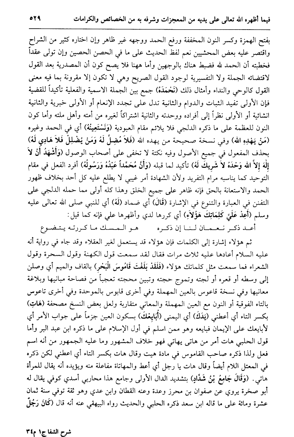 ثم هؤلاء إشارة إلى الكلمات فإن هؤلاء قد يستعمل لغير العقلاء وقد جاء في رواية أنه عليه السلام أعادها عليه ثلاث مرات فقال لقد سمعت قول الكهنة وقول السحرة وقول الشعراء فما سمعت مثل كلماتك هؤلاء (فلقد بلغت قاموس البحر) بالقاف والميم أي وصلن إلى وسطه أو قعره أو لجته وتموج حجته وتبين محجته تعجبا من فصاحة مبانيها وبلاغة معانيها وفي نسخة قاعوس بالعين المهملة وفي أخرى قابوس بالموحدة وفي أخرى تاعوس بالتاء الفوقية أو النون مع العين المهملة والمعاني متقاربة ولعل بعض النسخ مصحفة (هات) بكسر التاء أي أعطني (يدك) أي اليمنى (أبايعك) بسكون العين جزما على جواب الأمر أي لأبايعك على الإيمان فبايعه وهو ممن اسلم في أول الإسلام على ما ذكره ابن عبد البر وأما قول الحلبي هات أمر من هاتى يهاتي فهو خلاف المشهور وما عليه الجمهور من أنه اسم فعل ولذا ذكره صاحب القاموس في مادة هيت وقال هات بكسر التاء أي اعطني لكن ذكره في المعتل اللام أيضا وقال هات يا رجل أي أعط والمهاتاة مفاعلة منه ويؤيده أنه يقال للمرأة هاتي. (وقال جامع بن شدّاد) بتشديد الدال الأولى وجامع هذا محاربي أسدي كوفي يقال له أبو صخرة يروي عن صفوان بن محرز وعدة وعنه القطان وابن عدي وهو ثقة توفي سنة ثمان عشرة ومائة على ما قاله ابن سعد ذكره الحلبي والحديث رواه البيهقي عنه أنه قال (كان رجل