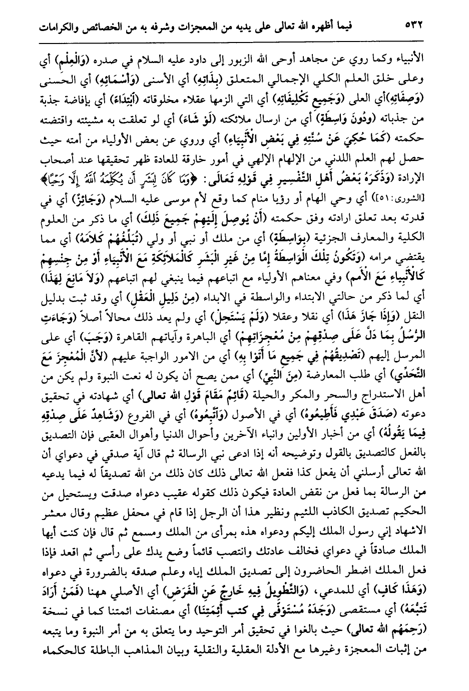 الأنبياء وكما روي عن مجاهد أوحى الله الزبور إلى داود عليه السلام في صدره (والعلم) أي وعلى خلق العلم الكلي الإجمالي المتعلق (بذاته) أي الأسنى (وأسمائه) أي الحسنى (وصفاته) أي العلى (وجميع تكليفاته) أي التي الزمها عقلاء مخلوقاته (ابتداء) أي بإفاضة جذبة من جذباته (ودون واسطة) أي من ارسال ملائكته (لو شاء) أي لو تعلقت به مشيئته واقتضته حكمته (كَمَا حُكِيَ عَنْ سُنَّتِهِ فِي بَعْضِ الْأَنْبِيَاءِ) أي وروي عن بعض الأولياء من أمته حيث حصل لهم العلم اللدني من الإلهام الإلهي في أمور خارقة للعادة ظهر تحقيقها عند أصحاب الإرادة (وَذَكَرَهُ بَعْضُ أَهْلِ التَّفْسِيرِ فِي قَوْلِهِ تَعَالَى: وَما كانَ لِبَشَرٍ أَنْ يُكَلِّمَهُ اللَّهُ إِلَّا وَحْياً [الشورى: 51] ) أي وحي الهام أو رؤيا منام كما وقع لأم موسى عليه السلام (وجائز) أي في قدرته بعد تعلق ارادته وفق حكمته (أن يوصل إليهم جميع ذلك) أي ما ذكر من العلوم الكلية والمعارف الجزئية (بواسطة) أي من ملك أو نبي أو ولي (تبلّغهم كلامه) أي مما يقتضي مرامه (وَتَكُونُ تِلْكَ الْوَاسِطَةُ إِمَّا مِنْ غَيْرِ الْبَشَرِ كَالْمَلَائِكَةِ مَعَ الْأَنْبِيَاءِ أَوْ مِنْ جِنْسِهِمْ كَالْأَنْبِيَاءِ مع الأمم) وفي معناهم الأولياء مع اتباعهم فيما ينبغي لهم اتباعهم (ولا مانع لهذا) أي لما ذكر من حالتي الابتداء والواسطة في الابداء (من دليل العقل) أي وقد ثبت بدليل النقل (وإذا جاز هذا) أي نقلا وعقلا (ولم يستحل) أي ولم يعد ذلك محالا أصلا (وَجَاءَتِ الرُّسُلُ بِمَا دَلَّ عَلَى صِدْقِهِمْ مِنْ معجزاتهم) أي الباهرة وآياتهم القاهرة (وجب) أي على المرسل إليهم (تصديقهم في جميع ما أتوا به) أي من الامور الواجبة عليهم (لأنّ المعجز مع التّحدّي) أي طلب المعارضة (من النّبيّ) أي ممن يصح أن يكون له نعت النبوة ولم يكن من أهل الاستدراج والسحر والمكر والحيلة (قائم مقام قول الله تعالى) أي شهادته في تحقيق دعوته (صدق عبدي فأطيعوه) أي في الأصول (واتّبعوه) أي في الفروع (وشاهد على صدقه فيما يقوله) أي من أخبار الأولين وانباء الآخرين وأحوال الدنيا وأهوال العقبى فإن التصديق بالفعل كالتصديق بالقول وتوضيحه أنه إذا ادعى نبي الرسالة ثم قال آية صدقي في دعواي أن الله تعالى أرسلني أن يفعل كذا ففعل الله تعالى ذلك كان ذلك من الله تصديقا له فيما يدعيه من الرسالة بما فعل من نقض العادة فيكون ذلك كقوله عقيب دعواه صدقت ويستحيل من الحكيم تصديق الكاذب اللئيم ونظير هذا أن الرجل إذا قام في محفل عظيم وقال معشر الاشهاد إني رسول الملك إليكم ودعواه هذه بمرأى من الملك ومسمع ثم قال فإن كنت أيها الملك صادقا في دعواي فخالف عادتك وانتصب قائما وضع يدك على رأسي ثم اقعد فإذا فعل الملك اضطر الحاضرون إلى تصديق الملك إياه وعلم صدقه بالضرورة في دعواه (وهذا كاف) أي للمدعي، (والتّطويل فيه خارج عن الغرض) أي الأصلي ههنا (فمن أراد تتبّعه) أي مستقصى (وجده مستوفى في كتب أئمتنا) أي مصنفات ائمتنا كما في نسخة (رحمهم الله تعالى) حيث بالغوا في تحقيق أمر التوحيد وما يتعلق به من أمر النبوة وما يتبعه من إثبات المعجزة وغيرها مع الأدلة العقلية والنقلية وبيان المذاهب الباطلة كالحكماء