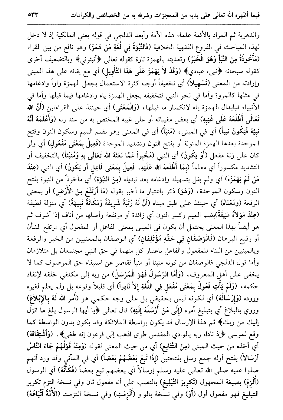والدهرية ثم المراد بالأئمة علماء هذه الأمة وأبعد الدلجي في قوله يعني المالكية إذ لا دخل لهذه المباحث في الفروع الفقهية الخلافية (فالنّبوّة في لغة من همز) وهو نافع من بين القراء (مأخوذة من النّبأ وهو الخبر) وتعديته بالهمزة تارة كقوله تعالى أَنْبِئُونِي وبالتضعيف أخرى كقوله سبحانه نَبِّئْ عِبادِي (وقد لا يهمز على هذا التّأويل) أي مع بقائه على هذا المبنى وإرادته من المعنى (تسهيلا) أي تخفيفا أوجبه كثرة الاستعمال بجعل الهمزة واوا وادغامها في مثلها كالمروة وأما في نحو النبي فتخفيفه بجعل الهمزة ياء وادغامها فيما قبلها وأما في الأنبياء فبابدال الهمزة ياء لانكسار ما قبلها، (والمعنى) أي حينئذ على القراءتين (أنّ الله تعالى أطلعه على غيبه) أي بعض مغيباته أو على غيبه المختص به من عند ربه (وأعلمه أنّه نبيّه فيكون نبيا) أي في المبنى، (منبّأ) أي في المعنى وهو بضم الميم وسكون النون وفتح الموحدة بعدها الهمزة المنونة أو بفتح النون وتشديد الموحدة (فعيل بمعنى مفعول) أي ولو كان على زنة مفعل (أو يكون) أي النبي (مُخْبِرًا عَمَّا بَعَثَهُ اللَّهُ تَعَالَى بِهِ وَمُنَبِّئًا) بالتخفيف أو التشديد مكسورا أي معلما (بِمَا أَطْلَعَهُ اللَّهُ عَلَيْهِ، فَعِيلٌ بِمَعْنَى فَاعِلٍ أو يكون) أي النبي (عند من لم يهمزه) أي ولم يقل بتسهيله وإدغامه بعد تبديله (من النّبوّة) أي مأخوذا من النبوة بفتح النون وسكون الموحدة، (وهو) ذكر باعتبار ما أخبر بقوله (ما ارتفع من الأرض) أو بمعنى الرفعة (ومعناه) أي حينئذ على طبق مبناه (أنّ له رتبة شريفة ومكانة نبيهة) أي منزلة لطيفة (عند مولاه منيفة) بضم الميم وكسر النون أي زائدة أو مرتفعة وأصلها من أناف إذا أشرف ثم هو أيضا بهذا المعنى يحتمل أن يكون في المبنى بمعنى الفاعل أو المفعول أي مرتفع الشأن أو رفيع البرهان (فالوصفان في حقّه مؤتلفان) أي الوصفان بالمعنيين من الخبر والرفعة وبالمبنيين من البناء للمفعول والفاعل باعتبار كل منهما في حق النبي مجتمعان بل متلازمان وأما قول الدلجي فالوصفان من كونه منبئا أو منبأ فقاصر عن استيفاء حق الموصوف كما لا يخفى على أهل المعروف، (وأمّا الرّسول فهو المرسل) من ربه إلى مكلفي خلقه لإنفاذ حكمه، (وَلَمْ يَأْتِ فَعُولٌ بِمَعْنَى مُفْعَلٍ فِي اللُّغَةِ إلّا نادرا) أي قليلا وقوعه بل ولم يعلم لغيره وروده (وإرساله) أي لكونه ليس بحقيقي بل على وجه حكمي هو (أمر الله له بالإبلاغ) وروي بالبلاغ أي بتبليغ أمره (إلى من أرسله إليه) قال تعالى يا أَيُّهَا الرَّسُولُ بَلِّغْ ما أُنْزِلَ إِلَيْكَ مِنْ رَبِّكَ ثم هذا الإرسال قد يكون بواسطة الملائكة وقد يكون بدون الواسطة كما وقع لموسى إِذْ ناداهُ رَبُّهُ بِالْوادِ الْمُقَدَّسِ طُوىً اذْهَبْ إِلى فِرْعَوْنَ إِنَّهُ طَغى. (واشتقاقه) أي أخذه من حيث المبنى (من التّتابع) أي من حيث المعنى لقوله (ومنه قولهم جاء النّاس أرسالا) بفتح أوله جمع رسل بفتحتين (إذا تبع بعضهم بعضا) أي في المأتي وقد ورد أنهم صلوا عليه صلى الله تعالى عليه وسلم إرسالا أي بعضهم تبع بعضا (فكأنّه) أي الرسول (ألزم) بصيغة المجهول (تكرير التّبليغ) بالنصب على أنه مفعول ثان وفي نسخة التزم تكرير التبليغ فهو مفعول أول (أو) وفي نسخة بالواو (ألزمت) وفي نسخة التزمت (الأمّة اتّباعه)