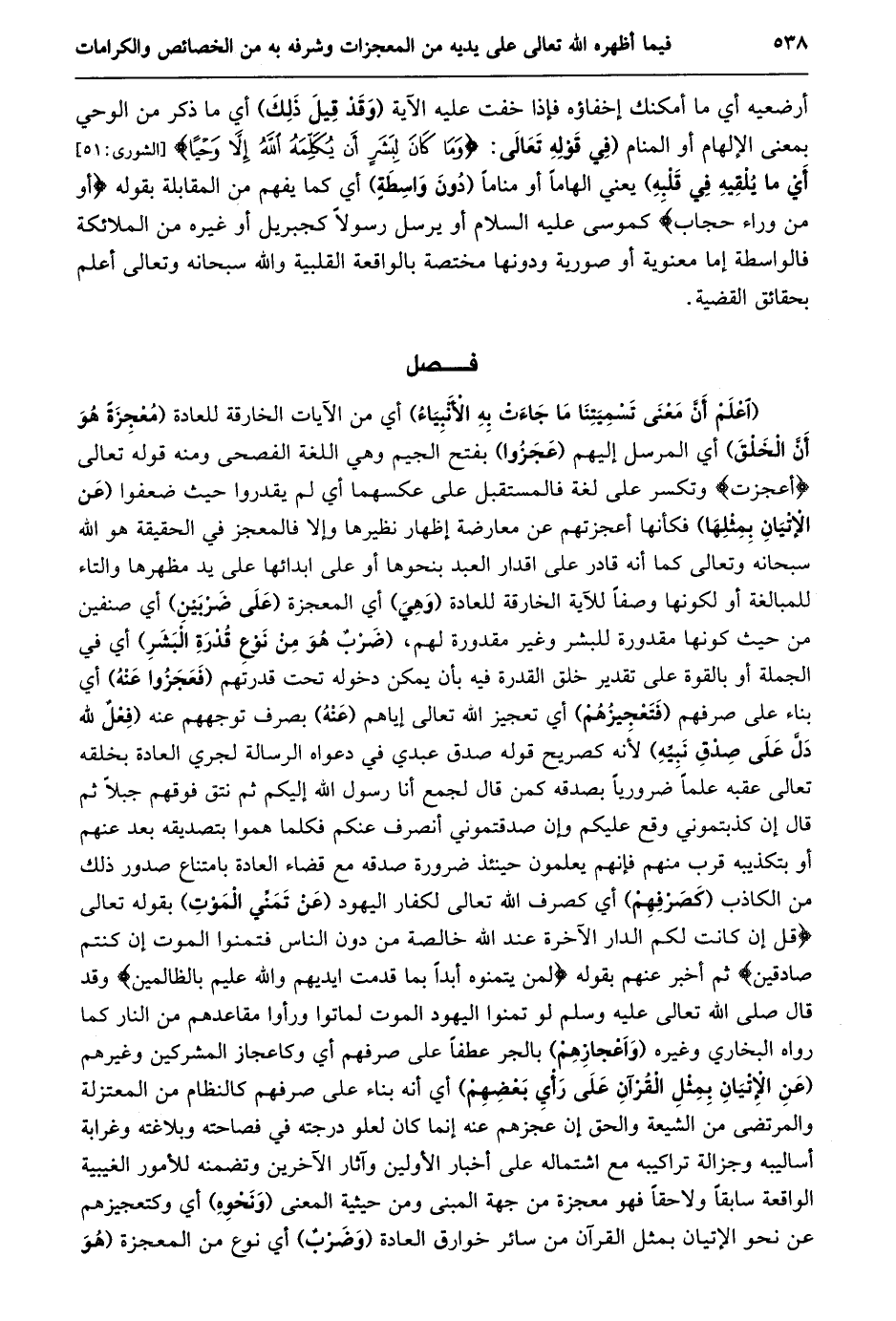 (اعلم أنّ معنى تسميتنا ما جاءت به الأنبياء) أي من الآيات الخارقة للعادة (معجزة هو أنّ الخلق) أي المرسل إليهم (عجزوا) بفتح الجيم وهي اللغة الفصحى ومنه قوله تعالى أَعَجَزْتُ وتكسر على لغة فالمستقبل على عكسهما أي لم يقدروا حيث ضعفوا (عن الإتيان بمثلها) فكأنها أعجزتهم عن معارضة إظهار نظيرها وإلا فالمعجز في الحقيقة هو الله سبحانه وتعالى كما أنه قادر على اقدار العبد بنحوها أو على ابدائها على يد مظهرها والتاء للمبالغة أو لكونها وصفا للآية الخارقة للعادة (وهي) أي المعجزة (على ضربين) أي صنفين من حيث كونها مقدورة للبشر وغير مقدورة لهم، (ضرب هو من نوع قدرة البشر) أي في الجملة أو بالقوة على تقدير خلق القدرة فيه بأن يمكن دخوله تحت قدرتهم (فعجزوا عنه) أي بناء على صرفهم (فتعجيزهم) أي تعجيز الله تعالى إياهم (عنه) بصرف توجههم عَنْهُ (فِعْلٌ لِلَّهِ دَلَّ عَلَى صِدْقِ نَبِيِّهِ) لأنه كصريح قوله صدق عبدي في دعواه الرسالة لجري العادة بخلقه تعالى عقبه علما ضروريا بصدقه كمن قال لجمع أنا رسول الله إليكم ثم نتق فوقهم جبلا ثم قال إن كذبتموني وقع عليكم وإن صدقتموني أنصرف عنكم فكلما هموا بتصديقه بعد عنهم أو بتكذيبه قرب منهم فإنهم يعلمون حينئذ ضرورة صدقه مع قضاء العادة بامتناع صدور ذلك من الكاذب (كصرفهم) أي كصرف الله تعالى لكفار اليهود (عن تمنّي الموت) بقوله تعالى قُلْ إِنْ كانَتْ لَكُمُ الدَّارُ الْآخِرَةُ عِنْدَ اللَّهِ خالِصَةً مِنْ دُونِ النَّاسِ فَتَمَنَّوُا الْمَوْتَ إِنْ كُنْتُمْ صادِقِينَ ثم أخبر عنهم بقوله وَلَنْ يَتَمَنَّوْهُ أَبَداً بِما قَدَّمَتْ أَيْدِيهِمْ وَاللَّهُ عَلِيمٌ بِالظَّالِمِينَ وقد قال صلى الله تعالى عليه وسلم لو تمنوا اليهود الموت لماتوا ورأوا مقاعدهم من النار كما رواه البخاري وغيره (واعجازهم) بالجر عطفا على صرفهم أي وكاعجاز المشركين وغيرهم (عَنِ الْإِتْيَانِ بِمِثْلِ الْقُرْآنِ عَلَى رَأْيِ بَعْضِهِمْ) أي أنه بناء على صرفهم كالنظام من المعتزلة والمرتضى من الشيعة والحق إن عجزهم عنه إنما كان لعلو درجته في فصاحته وبلاغته وغرابة أساليبه وجزالة تراكيبه مع اشتماله على أخبار الأولين وآثار الآخرين وتضمنه للأمور الغيبية الواقعة سابقا ولاحقا فهو معجزة من جهة المبنى ومن حيثية المعنى (ونحوه) أي وكتعجيزهم عن نحو الإتيان بمثل القرآن من سائر خوارق العادة (وضرب) أي نوع من المعجزة (هو
