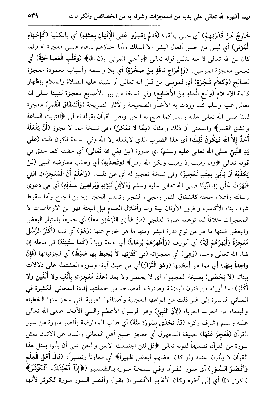 خارج عن قدرتهم) أي حتى بالقوة (فلم يقدروا على الإتيان بمثله) أي بالكلية (كإحياء الموتى) أي ليس من جنس أفعال البشر ولا الملك وأما احياؤهم بدعاء عيسى معجزة له فإنما كان من الله تعالى لا منه بدليل قوله تعالى وَأُحْيِ الْمَوْتى بِإِذْنِ اللَّهِ (وقلب العصا حيّة) أي تسعى معجزة لموسى. (وإخراج ناقة من صخرة) أي بلا واسطة وأسباب معهودة معجزة لصالح (وكلام شجرة) أي لموسى من قبل الله تعالى أو لنبينا عليه الصلاة والسلام بإظهار كلمة الإسلام (ونبع الماء من الأصابع) وفي نسخة من بين الأصابع معجزة لنبينا صلى الله تعالى عليه وسلم كما وردت به الأخبار الصحيحة والآثار الصريحة (وانشقاق القمر) معجزة لبينا صلى الله تعالى عليه وسلم كما صح به الخبر ونص القرآن بقوله تعالى اقْتَرَبَتِ السَّاعَةُ وَانْشَقَّ الْقَمَرُ والمعنى أن ذلك وأمثاله (ممّا لا يمكن) وفي نسخة مما لا يجوز (أن يفعله أحد إلّا الله فيكون ذلك) أي هذا الضرب الذي لا يفعله إلا الله وفي نسخة فَكَوْنُ ذَلِكَ (عَلَى يَدِ النَّبِيِّ صَلَّى اللَّهُ تعالى عليه وسلم) أي صورة (من فعل الله تعالى) أي حقيقة كما حقق في قوله تعالى وَما رَمَيْتَ إِذْ رَمَيْتَ وَلكِنَّ اللَّهَ رَمى (وتحدّيه) أي وطلب معارضة النبي (من يكذّبه أن يأتي بمثله تعجيز) وفي نسخة تعجيز له أي عن ذلك. (وَاعْلَمْ أَنَّ الْمُعْجِزَاتِ الَّتِي ظَهَرَتْ عَلَى يَدِ نبيّنا صلى الله تعالى عليه وسلم ودلائل نبوّته وبراهين صدقه) أي في دعوى رسالته واعلاء حجته كانشقاق القمر ومجيء الشجر وتسليم الحجر وحنين الجذع وأما سقوط شرف بناء الأكاسرة وخرور الأوثان ليلة ولد وأظلال الغمام قبل البعثة فهو من الارهاصات لا المعجزات خلافا لما توهمه عبارة الدلجي (من هذين النّوعين معا) أي جميعا باعتبار البعض والبعض فمنها ما هو من نوع قدرة البشر ومنها ما هو خارج عنها (وهو) أي نبينا (أكثر الرّسل معجزة وأبهرهم آية) أي أنورهم (وأظهرهم برهانا) أي حجة وبيانا (كما سنبيّنه) في محله إن شاء الله تعالى وحده (وهي) أي معجزاته (في كثرتها لا يحيط بها ضبط) أي لجزئياتها (فإنّ واحدا منها) أي مما هو أعظمها (وهو القرآن) أي من حيث آياته وسوره المشتملة على دلالات بيناته (لا يحصى) بصيغة المجهول أي لا يحصر ولا يعد (عَدَدُ مُعْجِزَاتِهِ بِأَلْفٍ وَلَا أَلْفَيْنِ وَلَا أَكْثَرَ) لما أورثه من فنون البلاغة وصنوف الفصاحة من جملتها إفادة المعاني الكثيرة في المباني اليسيرة إلى غير ذلك من أنواعها العجيبة وأصنافها الغريبة التي عجز عنها الخطباء والبلغاء من العرب العرباء (لأنّ النّبيّ) وهو الرسول الأعظم والنبي الأفخم صلى الله تعالى عليه وسلم وشرف وكرم (قد تحدّى بسورة منه) أي طلب المعارضة بأقصر سورة من سور القرآن (فعجز عنها) بصيغة المجهول أي فعجز جميع أهل المعاني والبيان عن الاتيان بمثل سورة من القرآن تصديقا لقوله تعالى قُلْ لَئِنِ اجْتَمَعَتِ الْإِنْسُ وَالْجِنُّ عَلى أَنْ يَأْتُوا بِمِثْلِ هذَا الْقُرْآنِ لا يَأْتُونَ بِمِثْلِهِ وَلَوْ كانَ بَعْضُهُمْ لِبَعْضٍ ظَهِيراً أي معاونا ونصيرا، (قال أهل العلم وأقصر السّور) أي سور القرآن وفي نسخة سوره بالضمير (إِنَّا أَعْطَيْناكَ الْكَوْثَرَ [الكوثر: 1] ) أي إلى آخره وكان الأظهر الأقصر أن يقول وأقصر السور سورة الكوثر لأنها