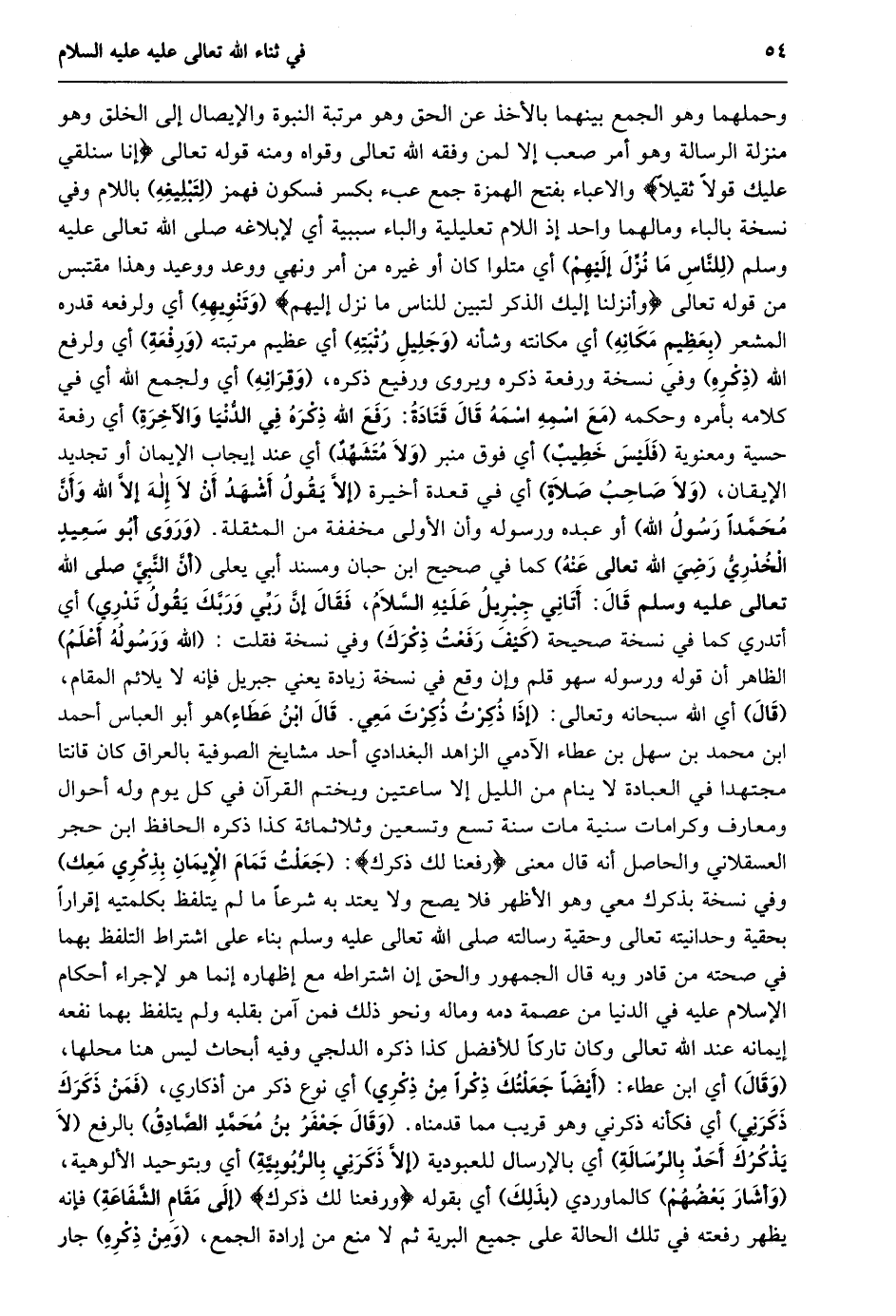 وحملهما وهو الجمع بينهما بالأخذ عن الحق وهو مرتبة النبوة والإيصال إلى الخلق وهو منزلة الرسالة وهو أمر صعب إلا لمن وفقه الله تعالى وقواه ومنه قوله تعالى إِنَّا سَنُلْقِي عَلَيْكَ قَوْلًا ثَقِيلًا والاعباء بفتح الهمزة جمع عبء بكسر فسكون فهمز (لتبليغه) باللام وفي نسخة بالباء وما لهما واحد إذ اللام تعليلية والباء سببية أي لإبلاغه صلى الله تعالى عليه وسلم (للنّاس ما نزّل إليهم) أي متلوا كان أو غيره من أمر ونهي ووعد ووعيد وهذا مقتبس من قوله تعالى وَأَنْزَلْنا إِلَيْكَ الذِّكْرَ لِتُبَيِّنَ لِلنَّاسِ ما نُزِّلَ إِلَيْهِمْ (وتنويهه) أي ولرفعه قدره المشعر (بعظيم مكانه) أي مكانته وشأنه (وجليل رتبته) أي عظيم مرتبته (ورفعة) أي ولرفع الله (ذكره) وفي نسخة ورفعة ذكره ويروى ورفيع ذكره، (وقرانه) أي ولجمع الله أي في كلامه بأمره وحكمه (مَعَ اسْمِهِ اسْمَهُ قَالَ قَتَادَةُ: رَفَعَ اللَّهُ ذكره في الدّنيا والآخرة) أي رفعة حسية ومعنوية (فليس خطيب) أي فوق منبر (ولا متشهّد) أي عند إيجاب الإيمان أو تجديد الإيقان، (ولا صاحب صلاة) أي في قعدة أخيرة (إِلَّا يَقُولُ أَشْهَدُ أَنْ لَا إِلَهَ إِلَّا الله وأنّ محمّدا رسول الله) أو عبده ورسوله وأن الأولى مخففة من المثقلة. (وروى أبو سعيد الخدريّ رضي الله تعالى عنه) كما في صحيح ابن حبان ومسند أبي يعلى (أنّ النّبيّ صلى الله تعالى عَلَيْهِ وَسَلَّمَ قَالَ: أَتَانِي جِبْرِيلُ عَلَيْهِ السَّلَامُ، فقال إنّ ربّي وربّك يقول تدري) أي أتدري كما في نسخة صحيحة (كيف رفعت ذكرك) وفي نسخة فقلت: (الله ورسوله أعلم) الظاهر أن قوله ورسوله سهو قلم وإن وقع في نسخة زيادة يعني جبريل فإنه لا يلائم المقام، (قال) أي الله سبحانه وتعالى: (إِذَا ذُكِرْتُ ذُكِرْتَ مَعِي. قَالَ ابْنُ عَطَاءٍ) هو أبو العباس أحمد ابن محمد بن سهل بن عطاء الآدمي الزاهد البغدادي أحد مشايخ الصوفية بالعراق كان قانتا مجتهدا في العبادة لا ينام من الليل إلا ساعتين ويختم القرآن في كل يوم وله أحوال ومعارف وكرامات سنية مات سنة تسع وتسعين وثلاثمائة كذا ذكره الحافظ ابن حجر العسقلاني والحاصل أنه قال معنى رَفَعْنا لَكَ ذِكْرَكَ: (جعلت تمام الإيمان بذكري معك) وفي نسخة بذكرك معي وهو الأظهر فلا يصح ولا يعتد به شرعا ما لم يتلفظ بكلمتيه إقرارا بحقية وحدانيته تعالى وحقية رسالته صلى الله تعالى عليه وسلم بناء على اشتراط التلفظ بهما في صحته من قادر وبه قال الجمهور والحق إن اشتراطه مع إظهاره إنما هو لإجراء أحكام الإسلام عليه في الدنيا من عصمة دمه وماله ونحو ذلك فمن آمن بقلبه ولم يتلفظ بهما نفعه إيمانه عند الله تعالى وكان تاركا للأفضل كذا ذكره الدلجي وفيه أبحاث ليس هنا محلها، (وقال) أي ابن عطاء: (أيضا جعلتك ذكرا من ذكري) أي نوع ذكر من أذكاري، (فمن ذكرك ذكرني) أي فكأنه ذكرني وهو قريب مما قدمناه. (وقال جعفر بن محمّد الصّادق) بالرفع (لا يذكرك أحد بالرّسالة) أي بالإرسال للعبودية (إلّا ذكرني بالرّبوبيّة) أي وبتوحيد الألوهية، (وأشار بعضهم) كالماوردي (بذلك) أي بقوله وَرَفَعْنا لَكَ ذِكْرَكَ (إلى مقام الشّفاعة) فإنه يظهر رفعته في تلك الحالة على جميع البرية ثم لا منع من إرادة الجمع، (ومن ذكره) جار