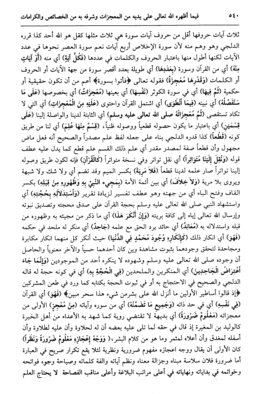 ثلاث آيات حروفها أقل من حروف آيات سورة هي ثلاث مثلها كقل هو الله أحد كذا قرره الدلجي وهو وهم منه لأن سورة الإخلاص أربع آيات نعم سورة العصر نحوها في عدد الآيات لكنها أطول منها باعتبار الحروف والكلمات في عددها (فكلّ آية) أي منه (أو آيات منه) أي من القرآن وسورة (بعددها) أي طويلة بعدد أقصر سورة من جهة الآيات أو الحروف أو الكلمات (وقدرها معجزة) فقوله تعالى فَأْتُوا بِسُورَةٍ أعم من أن تكون حقيقية أو حكمية (ثمّ فيها) أي في سورة الكوثر (نفسها) أي بعينها (معجزات) أي بخصوصها (على ما سنفصّله) أي نبينه (فيما انطوى) أي اشتمل القرآن واحتوى (عليه من المعجزات) أي التي لا تكاد تستقصى (ثمّ معجزاته صلى الله تعالى عليه وسلم) أي الثابتة لدينا والواصلة إلينا (على قسمين) أي باعتبار ما يكون حصوله قطعيا ووصوله ظنيا، (قسم منها علم) أي لنا من طريق كونه (قطعا) كذا قدره الدلجي بناء على جعله لفظ علم مصدرا والصحيح أنه فعل ماض مجهول وأن قطعا صفة لمصدر مقدر أي علم ذلك القسم علم قطع كما يدل عليه عطف قوله (ونقل إلينا متواترا) أي نقل تواتر وفي نسخة متواترا (كالقرآن) فإنه لكون طريق وصوله إلينا تواترا صار علمه لدينا قطعا (فلا مرية) بكسر الميم وقد تضم أي ولا شك ولا شبهة ويروى بلا مرية (ولا خلاف) أي بين أئمة الأمة (بمجيء النّبيّ به وظهوره من قبله) بكسر القاف وفتح الباء أي من جهته وهو عطف تفسير لزيادة تقرير (واستدلاله بحجّته) أي واستشهاد النبي صلى الله تعالى عليه وسلم بحجة القرآن على صدق محجته وتصديق نبوته وإرسال الله تعالى إياه إلى كافة بريته (وإن أنكر هذا) أي ما ذكر من مجيئه به وظهوره من قبله واستدلاله به (معاند) أي حائد يرد الحق مع علمه (جاحد) أي منكر له ملحد في حكمه (فهو) أي انكار ذلك (كإنكاره وجود محمّد في الدّنيا) حيث أنكر كل منهما انكار مكابرة ومجاحدة لتحقق وجودهما بثبوت مشاهدة وين كان أحدهما حسيا والآخر معنويا والحاصل أن وجوده صلى الله تعالى عليه وسلم وشهوده لا ينكره أحد من الموجودين (وإنّما جاء اعتراض الجاحدين) أي المنكرين والملحدين (في الحجّة به) أي في كونه حجة له قاله الدلجي والصحيح في الاحتجاج به أو في ثبوت الحجة بكتابه كما ورد في طعن المشركين إذ قالُوا أَساطِيرُ الْأَوَّلِينَ ما أَنْزَلَ اللَّهُ عَلى بَشَرٍ مِنْ شَيْءٍ هذا سِحْرٌ مُبِينٌ (فهو) أي القرآن (في نفسه) أي في حد ذاته (وجميع ما تضمّنه) أي من سوره وآياته (من معجز) الأولى من معجزاته (معلوم ضرورة) أي بديهة لا تقتضي روية كما شهد به الأعداء من أهل الخبرة كالوليد بن المغيرة إذ قال في حقه لما تلى عليه بعضه إِنَّ لَهُ لِحَلَاوَةً وَإِنَّ عَلَيْهِ لَطَلَاوَةً وَإِنَّ أسفله لمغدق وأن أعلاه لمثمر وما هو من كلام البشر، (ووجه إعجازه معلوم ضرورة ونظرا) كان الأولى أن يقال ووجه اعجازه مفهوم ضرورية ونظرية لئلا يقع تكرار صريح في العبارة أما ضرورة فلان سلاسة مبناه وجزالة معناه ونظم آياته والفة كلماته وصباحة وجوه فواتحه وخواتمه في بداياته ونهاياته في أعلى مراتب البلاغة وأعلى مناقب الفصاحة لا يحتاج العلم
