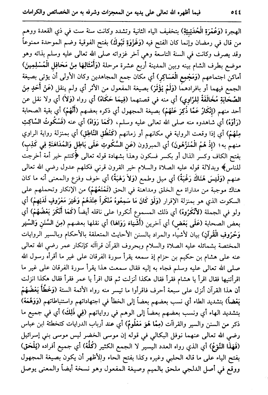 الهجرة (وعمرة الحديبيّة) بتخفيف الياء الثانية وتشدد وكانت سنة ست في ذي القعدة ووهم من قال في رمضان وإنما كان الفتح فيه (وغزوة تبوك) بفتح الفوقية وضم الموحدة ممنوعا وقد يصرف وكانت في السنة التاسعة وهي آخر غزواته صلى الله تعالى عليه وسلم بذاته وهو موضع بطرف الشام بينه وبين المدينة أربع عشرة مرحلة (وأمثالها من محافل المسلمين) أماكن اجتماعهم (ومجمع العساكر) أي مكان جمع المجاهدين وكان الأولى أن يؤتى بصيغة الجمع فيهما أو بافرادهما (ولم يؤثر) بصيغة المفعول من الأثر أي ولم ينقل (عن أحد من الصّحابة مخالفة للرّاوي) أي منه في قصتهما (فيما حكاه) أي رواه (ولا) أي ولا نقل عن أحد منهم (إنكار عمّا ذكر عنهم) بصيغة المجهول أي ذكره بعضهم (أنّهم) أي بقية الصحابة (رأوه) أي شاهدوه منه صلى الله تعالى عليه وسلم، (كما رواه) أي عنه (فسكوت السّاكت منهم) أي إذا وقعت الرواية في مكانهم أو زمانهم (كنطق النّاطق) أي بمنزلة رواية الراوي منهم به؛ (إذ هم المنزّهون) أي المبرؤون (عَنِ السُّكُوتِ عَلَى بَاطِلٍ وَالْمُدَاهَنَةِ فِي كَذِبٍ) بفتح الكاف وكسر الذال أو بكسر فسكون وهذا بشهادة قوله تعالى كُنْتُمْ خَيْرَ أُمَّةٍ أُخْرِجَتْ لِلنَّاسِ وبدلالة قوله عليه الصلاة والسلام خير القرون قرني فكلهم عدول رضي الله تعالى عنهم (وليس هناك رغبة) أي ميل وطمع (ولا رهبة) أي خوف وفزع والمعنى أنه ما كان هناك موجبة من مداراة مع الخلق ومداهنة في الحق (تمنعهم) من الإنكار وتحملهم على السكوت الذي هو بمنزلة الإقرار (وَلَوْ كَانَ مَا سَمِعُوهُ مُنْكَرًا عِنْدَهُمْ وَغَيْرَ معروف لديهم) أي ولو في الجملة (لأنكروه) أي ذلك المسموع أنكروا على ناقله أيضا (كما أنكر بعضهم) أي بعض الصحابة (على بعض) أي آخرين (أشياء رواها) أي نقلها بعضهم (من السّنن والسّير وحروف القرآن) بيان لأشياء والمراد بالسنن الأحاديث المتعلقة بالأحكام وبالسير الروايات المختصة بشمائله عليه الصلاة والسلام وبحروف القرآن قراآته كإنكار عمر رضي الله تعالى عنه على هشام بن حكيم بن حزام إذ سمعه يقرأ سورة الفرقان على غير ما أقرأه رسول الله صلى الله تعالى عليه وسلم فجاء به إليه فقال سمعت هذا يقرأ سورة الفرقان على غير ما اقرأتنيها فقال اقرأ يا هشام فقرأ فقال هكذا أنزلت ثم قال اقرأ يا عمر فقرأ فقال هكذا انزلت أن هذا القرآن أنزل على سبعة أحرف فاقرأوا ما تيسر منه رواه الأئمة الستة (وخطّأ بعضهم بعضا) بتشديد الطاء أي نسب بعضهم بعضا إلى الخطأ في اجتهاداتهم واستنباطاتهم (ووهّمه) بتشديد الهاء أي ونسب بعضهم بعضا إلى الوهم في رواياتهم (في ذلك) أي في جميع ما ذكر من السنن والسير والقراآت (ممّا هو معلوم) أي عند أرباب الدرايات كتخطئة ابن عباس رضي الله تعالى عنهما نوفل البكالي في قوله إن موسى الخضر ليس موسى بني إسرائيل (فهذا النّوع) أي الذي رواه العدد اليسير لا الجمع الكثير (كلّه) أي جميع أفراده (يلحق) بفتح الياء على ما قاله الحلبي وغيره وكذا بفتح الحاء والأظهر أن يكون بصيغة المجهول ووقع في أصل الدلجي ملحق بالميم وصيغة المفعول وهو نسخة أيضا والمعنى يوصل