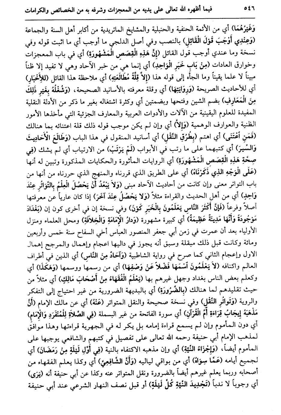 وغيرهما) أي من الأئمة الحنفية والحنبلية والمشايخ الماتريدية من أكابر أهل السنة والجماعة (وعندي أوجب قول القائل) بالنصب وفي أصل الدلجي ما أوجب أي ما اثبت قوله وفي نسخة وَمَا عِنْدِي أَوْجَبَ قَوْلَ الْقَائِلِ (إِنَّ هَذِهِ القصص المشهورة) أي في باب المعجزات وخوارق العادات (من باب خبر الواحد) أي إنما هي من خبر الآحاد وهي لا تفيد إلا ظنا مبينا لا علما يقينا وما الجأه إلى قوله هذا (إلّا قلّة مطالعته) أي ملاحظة هذا القائل (للأخبار) أي للأحاديث الصريحة (وروايتها) أي وقلة معرفته بالأسانيد الصحيحة، (وشغله بغير ذلك من المعارف) بضم الشين وفتحها وبضمتين أي وكثرة اشتغاله بغير ما ذكر من الأدلة النقلية المفيدة للعلوم اليقينية من الآلات والأدوات العربية والمعارف الجزئية التي مأخذها الأمور الظنية والعوارف الوهمية (وإلّا) أي وإن لم يكن موجب قوله ذلك قلة اعتنائه بما هنالك (فمن اعتنى) أي اهتم (بطرق النّقل) أي أسانيد المنقول في هذا الباب (وطالع الأحاديث والسّير) أي كتبهما على ما رتب في الأبواب (لم يرتب) من الارتياب أي لم يشك (في صحّة هذه القصص المشهورة) أي الروايات المأثورة والحكايات المذكورة وتبين له أنها (على الوجه الذي ذكرناه) أي على الطريق الذي قررناه والمنهج الذي حررناه من أنها من باب التواتر معنى وإن كانت من أحاديث الآحاد مبنى (وَلَا يَبْعُدُ أَنْ يَحْصُلَ الْعِلْمُ بِالتَّوَاتُرِ عِنْدَ واحد) أي من أهل الحديث والقراءة مثلا (ولا يحصل عند آخر) إذا كان عاريا عن معرفتها أصلا وفرعا (فإنّ أكثر النّاس يعلمون بالخبر كون) وفي نسخة إن في أخرى كون إن (بغداد موجودة وأنّها مدينة عظيمة) أي كبيرة مشهورة (ودار الإمامة والخلافة) ومحل العلماء ومنزل الأولياء بعد أن عمرت في زمن أبي جعفر المنصور العباس أخي السفاح سنة خمس وأربعين ومائة وكانت قبل ذلك مبقلة وسبق أنه يجوز في داليها اعجام وإهمال والمرجح إهمال الاول وإعجام الثاني كما صرح في رواية الشاطبية (وآحاد من النّاس) أي الذين في أطراف العالم واكنافه (لا يعلمون اسمها فضلا عن وصفها) أي من رسمها ووسمها (وهكذا) أي وكعلم بعض الناس بغداد وجهل غيرهم بها (يعلم الفقهاء من أصحاب مالك) أي مثلا من حيث تقليدهم لما هنالك (بالضّرورة) أي بالبديهة الضرورية من غير احتياج إلى التفكر والروية (وتواتر النّقل) وفي نسخة صحيحة والنقل المتواتر (عنه) أي عن مالك الإمام (أنّ مذهبه إيجاب قراءة أمّ القرآن) أي سورة الفاتحة من غير البسملة (في الصّلاة للمنفرد والإمام) أي دون المأموم وإن لم يسمع قراءة إمامه بل يكر له في الجهرية قراءتها وهذا موافق لمذهب الإمام أبي حنيفة رحمه الله تعالى على تفصيل في كتبهم والشافعي يوجبها على المأموم أيضا، (وإجزاء النّيّة) أي وإن مذهبه الاكتفاء بالنية (في أوّل ليلة من رمضان) أي لجميع أيامه (عمّا سواه) أي من بواقي لياليه (وأنّ الشّافعيّ) أي وكذا يعلم الفقهاء من أصحابه وربما يعلم غيرهم أيضا بالضرورة ونقل المتواتر عنه وكذا عن أبي حنيفة أنه (يرى) أي وجوبا لا ندبا (تجديد النّيّة كلّ ليلة) أو قبل نصف النهار الشرعي عند أبي حنيفة