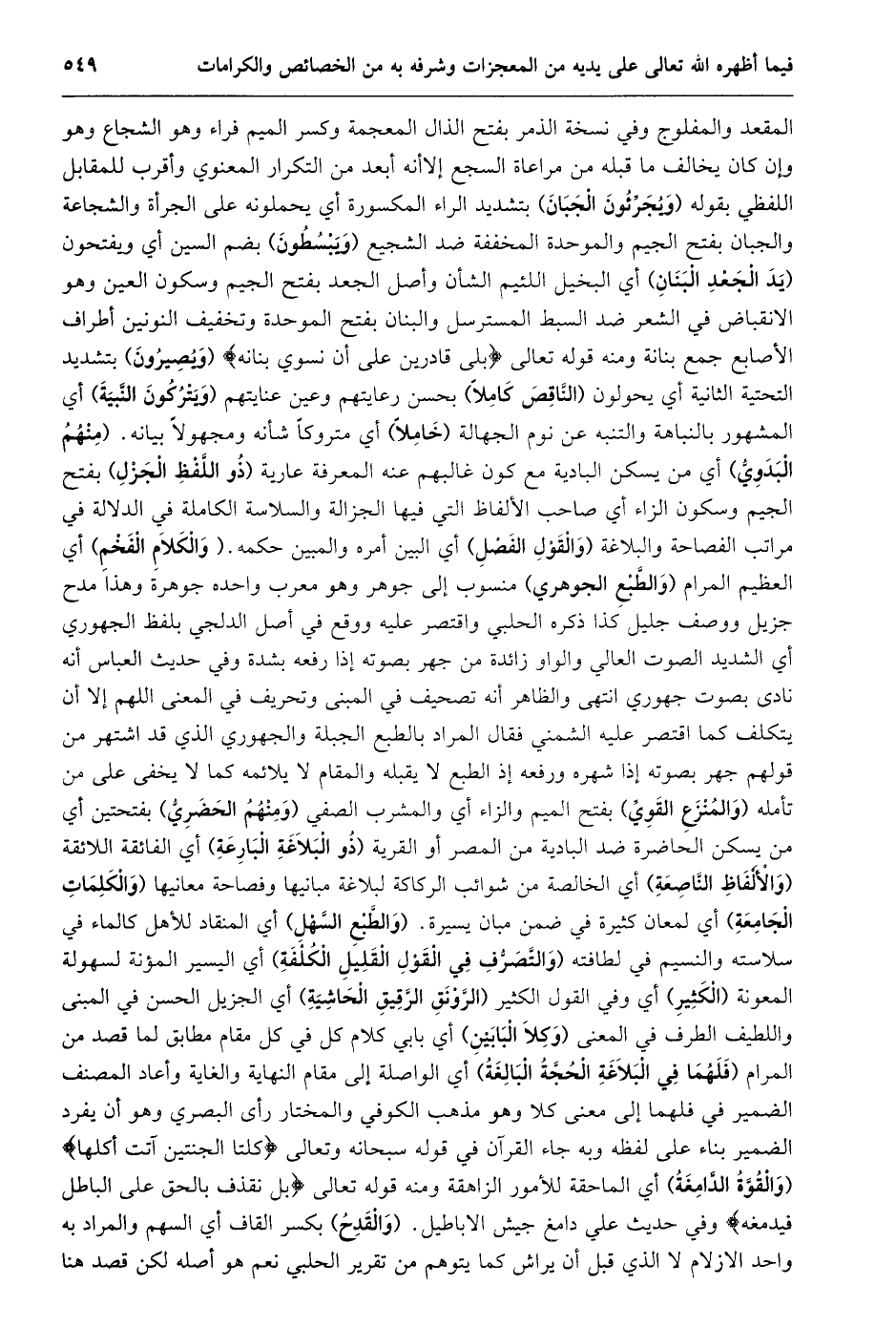 المقعد والمفلوج وفي نسخة الذمر بفتح الذال المعجمة وكسر الميم فراء وهو الشجاع وهو وإن كان يخالف ما قبله من مراعاة السجع إلا أنه أبعد من التكرار المعنوي وأقرب للمقابل اللفظي بقوله (ويجرّئون الجبان) بتشديد الراء المكسورة أي يحملونه على الجرأة والشجاعة والجبان بفتح الجيم والموحدة المخففة ضد الشجيع (ويبسطون) بضم السين أي ويفتحون (يد الجعد البنان) أي البخيل اللئيم الشأن وأصل الجعد بفتح الجيم وسكون العين وهو الانقباض في الشعر ضد السبط المسترسل والبنان بفتح الموحدة وتخفيف النونين أطراف الأصابع جمع بنانة ومنه قوله تعالى بَلى قادِرِينَ عَلى أَنْ نُسَوِّيَ بَنانَهُ (ويصيرون) بتشديد التحتية الثانية أي يحولون (النّاقص كاملا) بحسن رعايتهم وعين عنايتهم (ويتركون النّبية) أي المشهور بالنباهة والتنبه عن نوم الجهالة (خاملا) أي متروكا شأنه ومجهولا بيانه. (منهم البدويّ) أي من يسكن البادية مع كون غالبهم عنه المعرفة عارية (ذو اللّفظ الجزل) بفتح الجيم وسكون الزاء أي صاحب الألفاظ التي فيها الجزالة والسلاسة الكاملة في الدلالة في مراتب الفصاحة والبلاغة (والقول الفصل) أي البين أمره والمبين حكمه. (والكلام الفخم) أي العظيم المرام (والطّبع الجوهري) منسوب إلى جوهر وهو معرب واحده جوهرة وهذا مدح جزيل ووصف جليل كذا ذكره الحلبي واقتصر عليه ووقع في أصل الدلجي بلفظ الجهوري أي الشديد الصوت العالي والواو زائدة من جهر بصوته إذا رفعه بشدة وفي حديث العباس أنه نادى بصوت جهوري انتهى والظاهر أنه تصحيف في المبنى وتحريف في المعنى اللهم إلا أن يتكلف كما اقتصر عليه الشمني فقال المراد بالطبع الجبلة والجهوري الذي قد اشتهر من قولهم جهر بصوته إذا شهره ورفعه إذ الطبع لا يقبله والمقام لا يلائمه كما لا يخفى على من تأمله (والمنزع القويّ) بفتح الميم والزاء أي والمشرب الصفي (ومنهم الحضريّ) بفتحتين أي من يسكن الحاضرة ضد البادية من المصر أو القرية (ذو البلاغة البارعة) أي الفائقة اللائقة (والألفاظ النّاصعة) أي الخالصة من شوائب الركاكة لبلاغة مبانيها وفصاحة معانيها (والكلمات الجامعة) أي لمعان كثيرة في ضمن مبان يسيرة. (والطّبع السّهل) أي المنقاد للأهل كالماء في سلاسته والنسيم في لطافته (والتّصرّف في القول القليل الكلفة) أي اليسير المؤنة لسهولة المعونة (الكثير) أي وفي القول الكثير (الرّونق الرّقيق الحاشية) أي الجزيل الحسن في المبنى واللطيف الطرف في المعنى (وكلا البابين) أي بابي كلام كل في كل مقام مطابق لما قصد من المرام (فلهما في البلاغة الحجّة البالغة) أي الواصلة إلى مقام النهاية والغاية وأعاد المصنف الضمير في فلهما إلى معنى كلا وهو مذهب الكوفي والمختار رأى البصري وهو أن يفرد الضمير بناء على لفظه وبه جاء القرآن في قوله سبحانه وتعالى كِلْتَا الْجَنَّتَيْنِ آتَتْ أُكُلَها (والقوّة الدّامغة) أي الماحقة للأمور الزاهقة ومنه قوله تعالى بَلْ نَقْذِفُ بِالْحَقِّ عَلَى الْباطِلِ فَيَدْمَغُهُ وفي حديث علي دامغ جيش الاباطيل. (والقدح) بكسر القاف أي السهم والمراد به واحد الازلام لا الذي قبل أن يراش كما يتوهم من تقرير الحلبي نعم هو أصله لكن قصد هنا