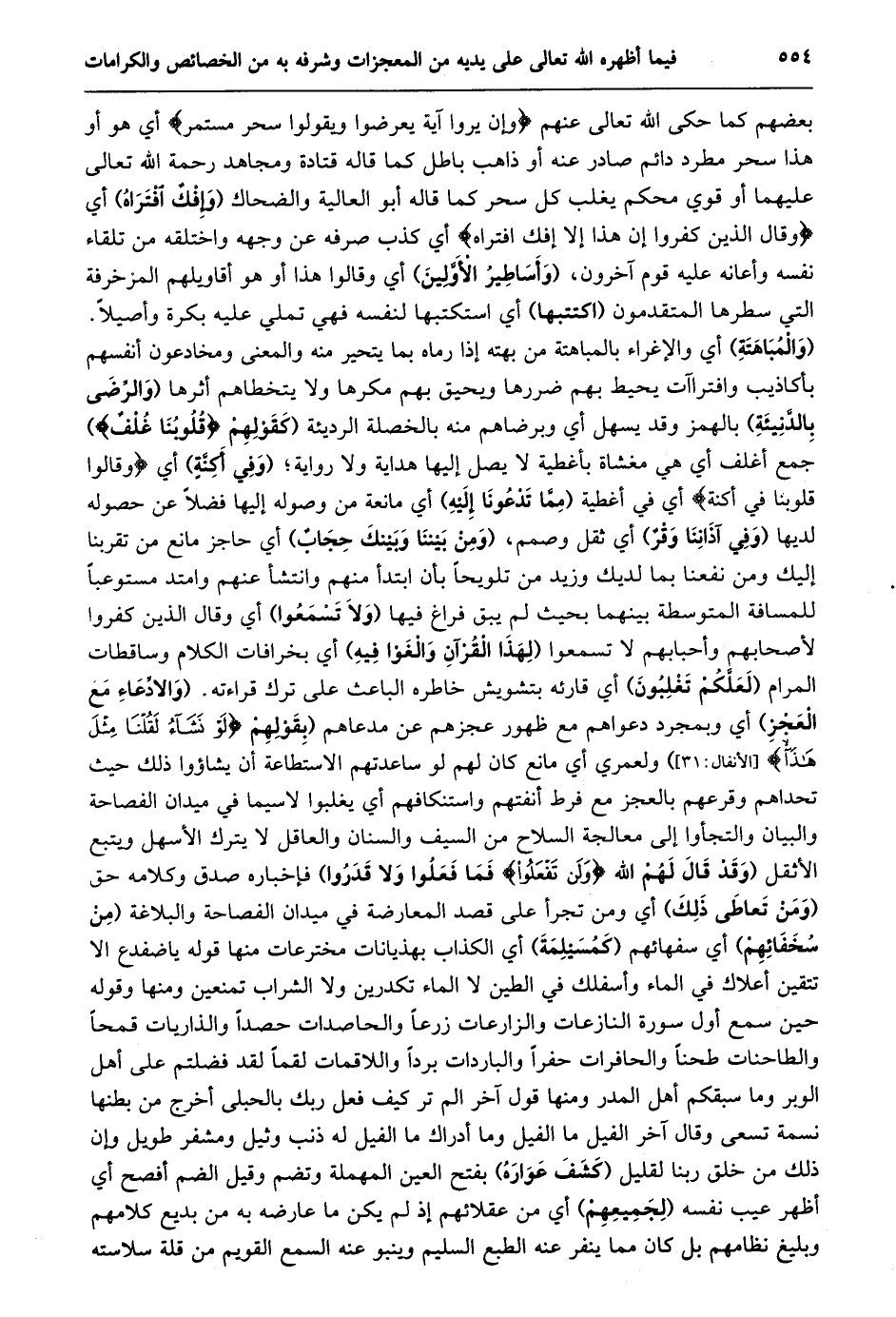 (والمباهتة) أي والإغراء بالمباهتة من بهته إذا رماه بما يتحير منه والمعنى ومخادعون أنفسهم بأكاذيب وافتراآت يحيط بهم ضررها ويحيق بهم مكرها ولا يتخطاهم أثرها (والرّضى بالدّنيئة) بالهمز وقد يسهل أي وبرضاهم منه بالخصلة الرديئة (كقولهم قُلُوبُنا غُلْفٌ) جمع أغلف أي هي مغشاة بأغطية لا يصل إليها هداية ولا رواية؛ (وفي أكنّة) أي وَقالُوا قُلُوبُنا فِي أَكِنَّةٍ أي في أغطية (ممّا تدعونا إليه) أي مانعة من وصوله إليها فضلا عن حصوله لديها (وفي آذاننا وقر) أي ثقل وصمم، (ومن بيننا وبينك حجاب) أي حاجز مانع من تقربنا إليك ومن نفعنا بما لديك وزيد من تلويحا بأن ابتدأ منهم وانتشأ عنهم وامتد مستوعبا للمسافة المتوسطة بينهما بحيث لم يبق فراغ فيها (ولا تسمعوا) أي وقال الذين كفروا لأصحابهم وأحبابهم لا تسمعوا (لهذا القرآن والغوا فيه) أي بخرافات الكلام وساقطات المرام (لعلّكم تغلبون) أي قارئه بتشويش خاطره الباعث على ترك قراءته. (والادّعاء مع العجز) أي وبمجرد دعواهم مع ظهور عجزهم عن مدعاهم (بِقَوْلِهِمْ لَوْ نَشاءُ لَقُلْنا مِثْلَ هَذَا [الْأَنْفَالِ: 31] ) ولعمري أي مانع كان لهم لو ساعدتهم الاستطاعة أن يشاؤوا ذلك حيث تحداهم وقرعهم بالعجز مع فرط أنفتهم واستنكافهم أي يغلبوا لا سيما في ميدان الفصاحة والبيان والتجأوا إلى معالجة السلاح من السيف والسنان والعاقل لا يترك الأسهل ويتبع الأثقل (وَقَدْ قَالَ لَهُمُ اللَّهُ وَلَنْ تَفْعَلُوا فَمَا فعلوا ولا قدروا) فإخباره صدق وكلامه حق (ومن تعاطى ذلك) أي ومن تجرأ على قصد المعارضة في ميدان الفصاحة والبلاغة (من سخفائهم) أي سفهائهم (كمسيلمة) أي الكذاب بهذيانات مخترعات منها قوله يا ضفدع الا تتقين أعلاك في الماء وأسفلك في الطين لا الماء تكدرين ولا الشراب تمنعين ومنها وقوله حين سمع أول سورة النازعات والزارعات زرعا والحاصدات حصدا والذاريات قمحا والطاحنات طحنا والحافرات حفرا والباردات بردا واللاقمات لقما لقد فضلتم على أهل الوبر وما سبقكم أهل المدر ومنها قول آخر الم تر كيف فعل ربك بالحبلى أخرج من بطنها نسمة تسعى وقال آخر الفيل ما الفيل وما أدراك ما الفيل له ذنب وثيل ومشفر طويل وإن ذلك من خلق ربنا لقليل (كشف عواره) بفتح العين المهملة وتضم وقيل الضم أفصح أي أظهر عيب نفسه (لجميعهم) أي من عقلائهم إذ لم يكن ما عارضه به من بديع كلامهم وبليغ نظامهم بل كان مما ينفر عنه الطبع السليم وينبو عنه السمع القويم من قلة سلاسته