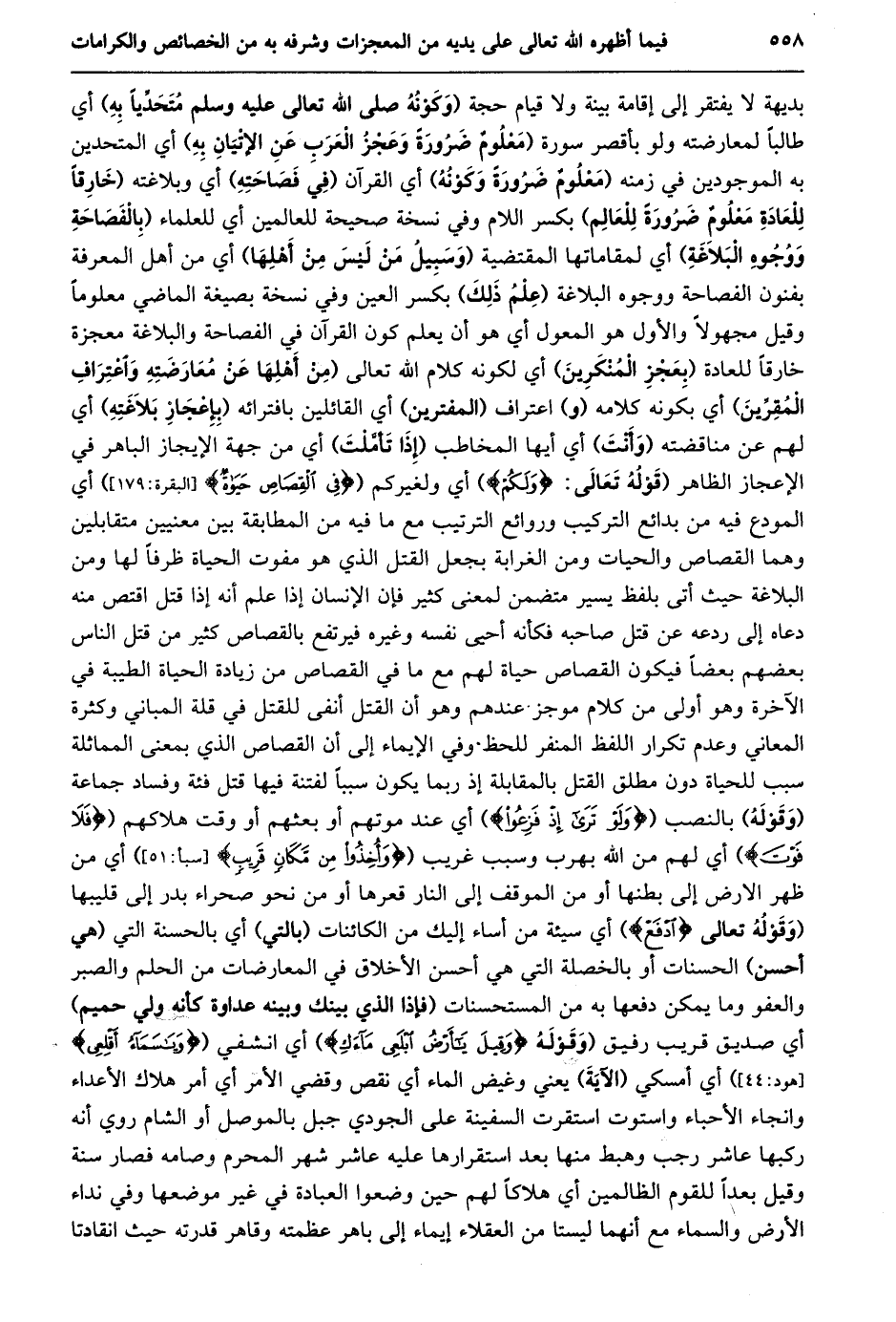 بديهة لا يفتقر إلى إقامة بينة ولا قيام حجة (وكونه صلى الله تعالى عليه وسلم متحدّيا به) أي طالبا لمعارضته ولو بأقصر سورة (مَعْلُومٌ ضَرُورَةً وَعَجْزُ الْعَرَبِ عَنِ الْإِتْيَانِ بِهِ) أي المتحدين به الموجودين في زمنه (معلوم ضرورة وكونه) أي القرآن (في فصاحته) أي وبلاغته (خارقا للعادة معلوم ضرورة للعالم) بكسر اللام وفي نسخة صحيحة للعالمين أي للعلماء (بالفصاحة ووجوه البلاغة) أي لمقاماتها المقتضية (وسبيل من ليس من أهلها) أي من أهل المعرفة بفنون الفصاحة ووجوه البلاغة (علم ذلك) بكسر العين وفي نسخة بصيغة الماضي معلوما وقيل مجهولا والأول هو المعول أي هو أن يعلم كون القرآن في الفصاحة والبلاغة معجزة خارقا للعادة (بعجز المنكرين) أي لكونه كلام الله تعالى (من أهلها عن معارضته واعتراف المقرّين) أي بكونه كلامه (و) اعتراف (المفترين) أي القائلين بافترائه (بإعجاز بلاغته) أي لهم عن مناقضته (وأنت) أي أيها المخاطب (إذا تأمّلت) أي من جهة الإيجاز الباهر في الإعجاز الظاهر (قوله تعالى: وَلَكُمْ) أي ولغيركم (فِي الْقِصاصِ حَياةٌ [البقرة: 179] ) أي المودع فيه من بدائع التركيب وروائع الترتيب مع ما فيه من المطابقة بين معنيين متقابلين وهما القصاص والحيات ومن الغرابة بجعل القتل الذي هو مفوت الحياة ظرفا لها ومن البلاغة حيث أتى بلفظ يسير متضمن لمعنى كثير فإن الإنسان إذا علم أنه إذا قتل اقتص منه دعاه إلى ردعه عن قتل صاحبه فكأنه أحيى نفسه وغيره فيرتفع بالقصاص كثير من قتل الناس بعضهم بعضا فيكون القصاص حياة لهم مع ما في القصاص من زيادة الحياة الطيبة في الآخرة وهو أولى من كلام موجز عندهم وهو أن القتل أنفى للقتل في قلة المباني وكثرة المعاني وعدم تكرار اللفظ المنفر للحظ وفي الإيماء إلى أن القصاص الذي بمعنى المماثلة سبب للحياة دون مطلق القتل بالمقابلة إذ ربما يكون سببا لفتنة فيها قتل فئة وفساد جماعة (وقوله) بالنصب (وَلَوْ تَرى إِذْ فَزِعُوا) أي عند موتهم أو بعثهم أو وقت هلاكهم (فَلا فَوْتَ) أي لهم من الله بهرب وسبب غريب (وَأُخِذُوا مِنْ مَكانٍ قَرِيبٍ [سبأ: 51] ) أي من ظهر الارض إلى بطنها أو من الموقف إلى النار قعرها أو من نحو صحراء بدر إلى قليبها (وقوله تعالى ادْفَعْ) أي سيئة من أساء إليك من الكائنات (بِالَّتِي) أي بالحسنة التي (هِيَ أَحْسَنُ) الحسنات أو بالخصلة التي هي أحسن الأخلاق في المعارضات من الحلم والصبر والعفو وما يمكن دفعها به من المستحسنات (فَإِذَا الَّذِي بَيْنَكَ وَبَيْنَهُ عَداوَةٌ كَأَنَّهُ وَلِيٌّ حَمِيمٌ) أي صديق قريب رفيق (وقوله وَقِيلَ يا أَرْضُ ابْلَعِي ماءَكِ) أي انشفي (وَيا سَماءُ أَقْلِعِي [هود: 44] ) أي أمسكي (الآية) يعني وغيض الماء أي نقص وقضي الأمر أي أمر هلاك الأعداء وانجاء الأحباء واستوت استقرت السفينة على الجودي جبل بالموصل أو الشام روي أنه ركبها عاشر رجب وهبط منها بعد استقرارها عليه عاشر شهر المحرم وصامه فصار سنة وقيل بعدا للقوم الظالمين أي هلاكا لهم حين وضعوا العبادة في غير موضعها وفي نداء الأرض والسماء مع أنهما ليستا من العقلاء إيماء إلى باهر عظمته وقاهر قدرته حيث انقادتا
