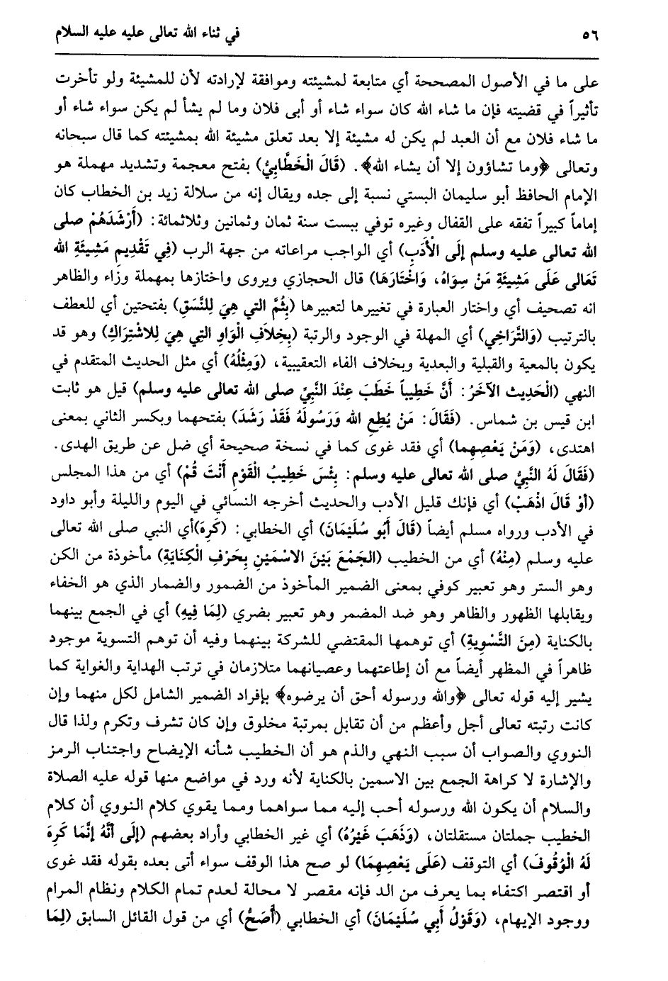 على ما في الأصول المصححة أي متابعة لمشيئة وموافقة لإرادته لأن للمشيئة ولو تأخرت تأثيرا في قضيته فإن ما شاء الله كان سواء شاء أو أبى فلان وما لم يشأ لم يكن سواء شاء أو ما شاء فلان مع أن العبد لم يكن له مشيئة إلا بعد تعلق مشيئة الله بمشيئته كما قال سبحانه وتعالى وَما تَشاؤُنَ إِلَّا أَنْ يَشاءَ اللَّهُ. (قال الخطّابيّ) بفتح معجمة وتشديد مهملة هو الإمام الحافظ أبو سليمان البستي نسبة إلى جده ويقال إنه من سلالة زيد بن الخطاب كان إماما كبيرا تفقه على القفال وغيره توفي ببست سنة ثمان وثمانين وثلاثمائة: (أرشدهم صلى الله تعالى عليه وسلم إلى الأدب) أي الواجب مراعاته من جهة الرب (فِي تَقْدِيمِ مَشِيئَةِ اللَّهِ تَعَالَى عَلَى مَشِيئَةِ من سواه، واختارها) قال الحجازي ويروى واختازها بمهملة وزاء والظاهر انه تصحيف أي واختار العبارة في تغييرها لتعبيرها (بثمّ التي هي للنّسق) بفتحتين أي للعطف بالترتيب (والتّراخي) أي المهلة في الوجود والرتبة (بخلاف الواو التي هي للاشتراك) وهو قد يكون بالمعية والقبلية والبعدية وبخلاف الفاء التعقيبية، (ومثله) أي مثل الحديث المتقدم في النهي (الْحَدِيثُ الْآخَرُ: أَنَّ خَطِيبًا خَطَبَ عِنْدَ النَّبِيِّ صلى الله تعالى عليه وسلم) قيل هو ثابت ابن قيس بن شماس. (فَقَالَ: مَنْ يُطِعِ اللَّهَ وَرَسُولَهُ فَقَدْ رَشَدَ) بفتحهما وبكسر الثاني بمعنى اهتدى، (ومن يعصهما) أي فقد غوى كما في نسخة صحيحة أي ضل عن طريق الهدى.