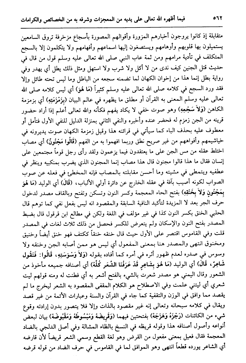 متقابلة إذ كانوا يروجون أخبارهم المزورة وأقوالهم المصورة بأسجاع مزخرفة تروق السامعين يستميلون بها قلوبهم وأوهامهم ويستصغون إليها اسماعهم وأفهامهم ولا يتكلمون إلا بالسجع المتكلف في تأدية مرامهم ومن ثمة عاب النبي صلى الله تعالى عليه وسلم قول من قال في حديث قتل الجنين كيف ندى من لا أكل ولا شرب ولا استهل ومثل ذلك يطل أي يهدر وفي رواية بطل إنما هذا من إخوان الكهان لما تضمنه سجعه من الباطل وما ليس تحته طائل وإلا فقد ورد السجع في كلامه صلى الله تعالى عليه وسلم كثيرا (ما هو) أي ليس كلامه صلى الله تعالى عليه وسلم المعنى به القرآن أو مطلق ما يظهره في عالم البيان (بزمزمته) أي بزمزمة الكاهن (ولا سجعه) وهو صوت خفي لا يكاد يفهم فكأنه والله تعالى أعلم إذا أراد حضور قرينه من الجن زمزم له فحضر عنده وأخبره والنفي الثاني بمنزلة الدليل للنفي الأول فتأمل أو معطوف عليه بحذف الباء كما سيأتي في قرائنه هذا وقيل زمزمة الكهان صوت يديرونه في خياشيمهم وأفواههم من غير صريح نطق وربما افهموا به من الفهم (قالوا مجنون) أي مصاب اختلط عقله من مس الجن على ما يعتقدون فيما يزعمون ولقد رأى رجل قوما مجتمعين على إنسان فقال ما هذا قالوا مجنون قال هذا مصاب إنما المجنون الذي يضرب بمنكبيه وينظر في عطفيه ويتمطى في مشيته وما أحسن مقابلته بالمصاب فإنه المخطئ في فعله عن صوب الصواب لكونه أصيب بآفة في عقله الخارج عن دائرة أولي الألباب، (قال) أي الوليد (ما هو بمجنون ولا بخنقه) بفتح الحاء المعجمة وكسر النون وتسكن وتفتح وبالقاف مصدر لدخول حرف الجر بعد لا المزيدة لتأكيد النافية السابقة والمقصود انه ليس بفعل نفي كما توهم قال الحلبي الخنق بكسر النون كذا في غير مؤلف في اللغة ولكن في مطالع ابن قرقول قال بضبط المصدر بفتح النون والإسكان ولم يتعرض للكسر فحصل من ذلك ثلاث لغات في المصدر قلت وفي القاموس اقتصر على الأول حيث قال خنقه خنقا ككتف فهو خنق أيضا وخنيق ومخنوق انتهى والمصدر هنا بمعنى المفعول أي ليس هو ممن أصابه الجن وخنقه ولا وسوس في صدره لعدم ظهور أثره في أمره كما أفاده بقوله (ولا وسوسته، قالوا: فنقول شاعر، قال) أي الوليد (مَا هُوَ بِشَاعِرٍ قَدْ عَرَفْنَا الشِّعْرَ كُلَّهُ) أي أصنافه جميعه مأخوذ من الشعور وقال اليمني هو مصدر شعرت بالشيء بالفتح أشعر به أي فطنت له ومنه قولهم ليت شعري أي ليتني علمت وفي الاصطلاح هو الكلام المقفى المقصود به الشعر ليخرج ما لم يقصد مما وافق في الوزن والتقفية كما جاء في القرآن والسنة وعبارات الأئمة من غير قصد ويقال في كلامه سبحانه وتعالى إنه غير مقصود بالذات وإلا فلا يتصور بدون إرادته وقوع شيء من الكائنات (رجزه وهزجه) بفتحتين فيهما (وقريضه ومبسوطه ومقبوضه) بيان لبعض أنواعه وأصول أصنافه هذا وقوله قريظه في النسخ بالظاء المشالة وفي أصل الدلجي بالضاد المعجمة فقال فعيل بمعنى مفعول من القرض وهو لغة القطع وسمي الشعر قريضا لأن قارضه أي الشاعر يورده قطعا انتهى وهو الموافق لما في القاموس في حرف الضاد من قوله قرضه