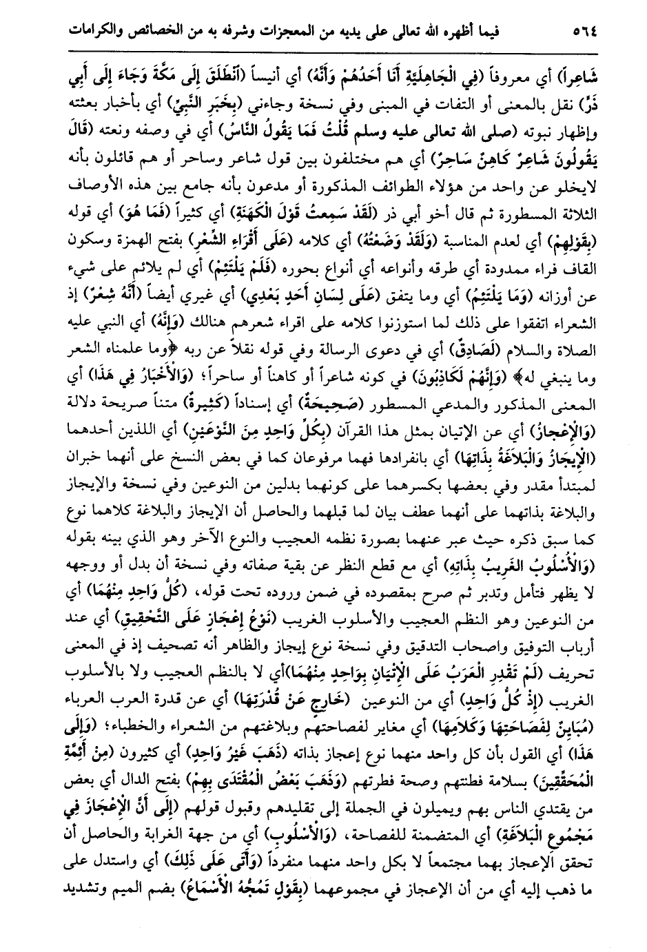 شاعرا) أي معروفا (في الجاهليّة أنا أحدهم وأنّه) أي أنيسا (انْطَلَقَ إِلَى مَكَّةَ وَجَاءَ إِلَى أَبِي ذَرٍّ) نقل بالمعنى أو التفات في المبنى وفي نسخة وجاءني (بخبر النّبيّ) أي بأخبار بعثته وإظهار نبوته (صلى الله تعالى عليه وسلم قلت فما يقول النّاس) أي في وصفه ونعته (قال يقولون شاعر كاهن ساحر) أي هم مختلفون بين قول شاعر وساحر أو هم قائلون بأنه لا يخلو عن واحد من هؤلاء الطوائف المذكورة أو مدعون بأنه جامع بين هذه الأوصاف الثلاثة المسطورة ثم قال أخو أبي ذر (لقد سمعت قول الكهنة) أي كثيرا (فما هو) أي قوله (بقولهم) أي لعدم المناسبة (ولقد وضعته) أي كلامه (على أقراء الشّعر) بفتح الهمزة وسكون القاف فراء ممدودة أي طرقه وأنواعه أي أنواع بحوره (فلم يلتئم) أي لم يلائم على شيء عن أوزانه (وما يلتئم) أي وما يتفق (على لسان أحد بعدي) أي غيري أيضا (أنّه شعر) إذ الشعراء اتفقوا على ذلك لما استوزنوا كلامه على اقراء شعرهم هنالك (وإنّه) أي النبي عليه الصلاة والسلام (لصادق) أي في دعوى الرسالة وفي قوله نقلا عن ربه وَما عَلَّمْناهُ الشِّعْرَ وَما يَنْبَغِي لَهُ (وإنّهم لكاذبون) في كونه شاعرا أو كاهنا أو ساحرا؛ (والأخبار في هذا) أي المعنى المذكور والمدعي المسطور (صحيحة) أي إسنادا (كثيرة) متنا صريحة دلالة (والإعجاز) أي عن الإتيان بمثل هذا القرآن (بكلّ واحد من النّوعين) أي اللذين أحدهما (الإيجاز والبلاغة بذاتها) أي بانفرادها فهما مرفوعان كما في بعض النسخ على أنهما خبران لمبتدأ مقدر وفي بعضها بكسرهما على كونهما بدلين من النوعين وفي نسخة والإيجاز والبلاغة بذاتهما على أنهما عطف بيان لما قبلهما والحاصل أن الإيجاز والبلاغة كلاهما نوع كما سبق ذكره حيث عبر عنهما بصورة نظمه العجيب والنوع الآخر وهو الذي بينه بقوله (والأسلوب الغريب بذاته) أي مع قطع النظر عن بقية صفاته وفي نسخة أن بدل أو ووجهه لا يظهر فتأمل وتدبر ثم صرح بمقصوده في ضمن وروده تحت قوله، (كلّ واحد منهما) أي من النوعين وهو النظم العجيب والأسلوب الغريب (نوع إعجاز على التّحقيق) أي عند أرباب التوفيق واصحاب التدقيق وفي نسخة نوع إيجاز والظاهر أنه تصحيف إذ في المعنى تحريف (لَمْ تَقْدِرِ الْعَرَبُ عَلَى الْإِتْيَانِ بِوَاحِدٍ مِنْهُمَا) أي لا بالنظم العجيب ولا بالأسلوب الغريب (إذ كلّ واحد) أي من النوعين (خارج عن قدرتها) أي عن قدرة العرب العرباء (مباين لفصاحتها وكلامها) أي مغاير لفصاحتهم وبلاغتهم من الشعراء والخطباء؛ (وإلى هذا) أي القول بأن كل واحد منهما نوع إعجاز بذاته (ذهب غير واحد) أي كثيرون (من أئمّة المحقّقين) بسلامة فطنتهم وصحة فطرتهم (وذهب بعض المقتدى بهم) بفتح الدال أي بعض من يقتدي الناس بهم ويميلون في الجملة إلى تقليدهم وقبول قولهم (إلى أنّ الإعجاز في مجموع البلاغة) أي المتضمنة للفصاحة، (والأسلوب) أي من جهة الغرابة والحاصل أن تحقق الإعجاز بهما مجتمعا لا بكل واحد منهما منفردا (وأتى على ذلك) أي واستدل على ما ذهب إليه أي من أن الإعجاز في مجموعهما (بقول تمجّه الأسماع) بضم الميم وتشديد