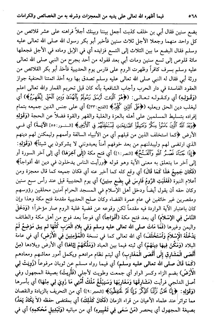 بضع سنين فقال أبي بن خلف كذبت أجعل بيننا وبينك أجلا فراهنه على عشر قلائص من كل واحد منهما وجعلا الأجل ثلاث سنين فأخبر أبوبكر رسول الله صلى الله تعالى عليه وسلم فقال البضع ما بين الثلاث إلى التسع فزايده أي في الإبل وماده في الأجل فجعلها مائة قلوص إلى تسع سنين ومات أبي بعد قفوله من أحد بجرح من النبي صلى الله تعالى عليه وسلم بسرف كافرا وظهرت الروم على فارس يوم الحديبية فأخذ أبو بكر القلائص من ورثة أبي فقال له النبي صلى الله تعالى عليه وسلم تصدق بها وبه أخذ ائمتنا الحنفية جواز العقود الفاسدة في دار الحرب وأجاب الشافعية بأنه كان قبل تحريم القمار والله تعالى اعلم (وقوله) أي وكقوله تعالى: (هُوَ الَّذِي أَرْسَلَ رَسُولَهُ بِالْهُدى وَدِينِ الْحَقِّ لِيُظْهِرَهُ) أي ليغلب دين الحق ويعليه (عَلَى الدِّينِ كُلِّهِ [الفتح: 33] ) أي على جنس الدين جميعه بتمام إفراده بتسليط المسلمين على أهله بالعزة والغلبة والقهر والقوة فضلا عن الحجة (وَقَوْلِهِ وَعَدَ اللَّهُ الَّذِينَ آمَنُوا مِنْكُمْ وَعَمِلُوا الصَّالِحاتِ لَيَسْتَخْلِفَنَّهُمْ فِي الْأَرْضِ [النور: 55] الآية) أي في الأرض كَمَا اسْتَخْلَفَ الَّذِينَ مِنْ قَبْلِهِمْ أي من الأنبياء السالفة وأممهم وَلَيُمَكِّنَنَّ لَهُمْ دِينَهُمُ الَّذِي ارْتَضى لَهُمْ وَلَيُبَدِّلَنَّهُمْ مِنْ بَعْدِ خَوْفِهِمْ أَمْناً يَعْبُدُونَنِي لا يُشْرِكُونَ بِي شَيْئاً (وَقَوْلِهِ: