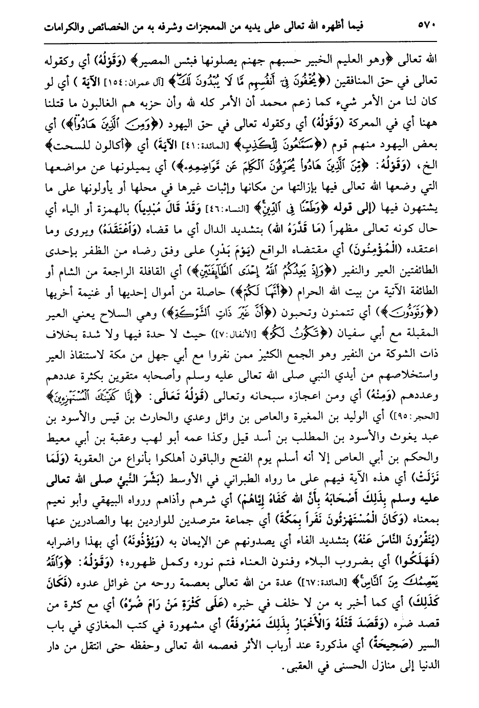 الله تعالى وَهُوَ الْحَكِيمُ الْخَبِيرُ حَسْبُهُمْ جَهَنَّمُ يَصْلَوْنَها فَبِئْسَ الْمَصِيرُ (وقوله) أي وكقوله تعالى في حق المنافقين (يُخْفُونَ فِي أَنْفُسِهِمْ مَا لَا يُبْدُونَ لَكَ [آل عمران: 154] الآية) أي لو كان لنا من الأمر شيء كما زعم محمد أن الأمر كله لله وأن حزبه هم الغالبون ما قتلنا ههنا أي في المعركة (وقوله) أي وكقوله تعالى في حق اليهود (وَمِنَ الَّذِينَ هادُوا) أي بعض اليهود منهم قوم (سَمَّاعُونَ لِلْكَذِبِ [المائدة: 41] الآية) أي أَكَّالُونَ لِلسُّحْتِ الخ، (وَقَوْلِهِ: مِنَ الَّذِينَ هادُوا يُحَرِّفُونَ الْكَلِمَ عَنْ مَواضِعِهِ) أي يميلونها عن مواضعها التي وضعها الله تعالى فيها بإزالتها من مكانها وإثبات غيرها في محلها أو يأولونها على ما يشتهون فيها (إلى قوله وَطَعْناً فِي الدِّينِ [النساء: 46] وقد قال مبديا) بالهمزة أو الياء أي حال كونه تعالى مظهرا (ما قدّره الله) بتشديد الدال أي ما قضاه (واعتقده) ويروى وما اعتقده (المؤمنون) أي مقتضاه الواقع (يوم بدر) على وفق رضاه من الظفر بإحدى الطائفتين العير والنفير (وَإِذْ يَعِدُكُمُ اللَّهُ إِحْدَى الطَّائِفَتَيْنِ) أي القافلة الراجعة من الشام أو الطائفة الآتية من بيت الله الحرام (أَنَّها لَكُمْ) حاصلة من أموال إحديها أو غنيمة أخريها (وَتَوَدُّونَ) أي تتمنون وتحبون (أَنَّ غَيْرَ ذاتِ الشَّوْكَةِ) وهي السلاح يعني العير المقبلة مع أبي سفيان (تَكُونُ لَكُمْ [الأنفال: 7] ) حيث لا حدة فيها ولا شدة بخلاف ذات الشوكة من النفير وهو الجمع الكثير ممن نفروا مع أبي جهل من مكة لاستنقاذ العير واستخلاصهم من أيدي النبي صلى الله تعالى عليه وسلم وأصحابه متقوين بكثرة عددهم وعددهم (ومنه) أي ومن اعجازه سبحانه وتعالى (قوله تعالى: إِنَّا كَفَيْناكَ الْمُسْتَهْزِئِينَ [الحجر: 95] ) أي الوليد بن المغيرة والعاص بن وائل وعدي والحارث بن قيس والأسود بن عبد يغوث والأسود بن المطلب بن أسد قيل وكذا عمه أبو لهب وعقبة بن أبي معيط والحكم بن أبي العاص إلا أنه أسلم يوم الفتح والباقون أهلكوا بأنواع من العقوبة (ولما نزلت) أي هذه الآية فيهم على ما رواه الطبراني في الأوسط (بشّر النّبيّ صلى الله تعالى عَلَيْهِ وَسَلَّمَ بِذَلِكَ أَصْحَابَهُ بِأَنَّ اللَّهَ كَفَاهُ إيّاهم) أي شرهم وأذاهم ورواه البيهقي وأبو نعيم بمعناه (وكان المستهزئون نفرا بمكّة) أي جماعة مترصدين للواردين بها والصادرين عنها (ينفّرون النّاس عنه) بتشديد الفاء أي يصدونهم عن الإيمان به (ويؤذونه) أي بهذا واضرابه (فهلكوا) أي بضروب البلاء وفنون العناء فتم نوره وكمل ظهوره؛ (وقوله: وَاللَّهُ يَعْصِمُكَ مِنَ النَّاسِ [المائدة: 67] ) عدة من الله تعالى بعصمة روحه من غوائل عدوه (فكان كذلك) أي كما أخبر به من لا خلف في خبره (على كثرة من رام ضرّه) أي مع كثرة من قصد ضره (وقصد قتله والأخبار بذلك معروفة) أي مشهورة في كتب المغازي في باب السير (صحيحة) أي مذكورة عند أرباب الأثر فعصمه الله تعالى وحفظه حتى انتقل من دار الدنيا إلى منازل الحسنى في العقبى.