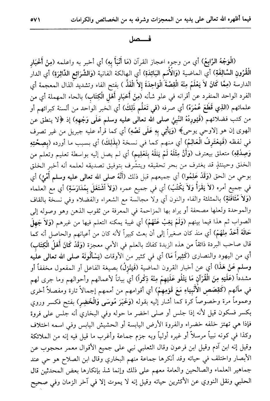 (الوجه الرّابع) أي من وجوه اعجاز القرآن (ما أنبأ به) أي أخبر به واعلمه (من أخبار القرون السّالفة) أي الماضية (والأمم البائدة) أي الهالكة الفانية (والشّرائع الدّاثرة) أي الدار الدارسة (مِمَّا كَانَ لَا يَعْلَمُ مِنْهُ الْقِصَّةَ الْوَاحِدَةَ إلّا الفذّ) بفتح الفاء وتشديد الذال المعجمة أي الفرد الواحد المنفرد عن أقرانه في علو شأنه (من أخبار أهل الكتاب) بالحاء المهملة أي من علمائهم (الذي قطع عمره) أي صرفه (في تعلّم ذلك) أي الخبر الواحد من ألسنة كبرائهم أو من كتب فضلائهم (فيورده النّبيّ صلى الله تعالى عليه وسلم على وجهه) إذ ما يَنْطِقُ عَنِ الْهَوى إِنْ هُوَ إِلَّا وَحْيٌ يُوحى (ويأتي به على نصّه) أي كما قرأه عليه جبريل من غير تصرف في لفظه (فيعترف العالم) أي منهم كما في نسخة (بذلك) أي بسبب ما أورده (بصحّته وصدقه) متعلق بيعترف (وأنّ مثله لم ينله بتعليم) أي لم يصل إليه بواسطة تعليم وتعلم من الخلق وحينئذ قد يغترف من بحر تحقيقه ويتشرف بتوفيق تصديقه لعلمه أنه أخبر الخلق بوحي من الحق (وقد علموا) أي جميعهم قبل ذلك (أنّه صلى الله تعالى عليه وسلم أمّيّ) أي في جميع أمره (لا يقرأ ولا يكتب) أي في جميع عمره (ولا اشتغل بمدارسة) أي مع العلماء (ولا مثافنة) بالمثلثة والفاء والنون أي ولا مجالسة مع الشعراء والفضلاء وفي نسخة بالقاف والموحدة ولعلها مصحفة أو يراد بها المزاحمة في المعرفة من ثقوب الذهن وهو وصوله إلى الصواب ثم هذا فيما بينهم (ولم يغب عنهم) أي غيبة يمكنه التعلم فيها من غيرهم (ولا جهل حاله أحد منهم) أي منذ كان صغيرا إلى أن بعث كبيرا لأنه كان من أعيانهم والحاصل أنه كما قال صاحب البردة ذائقا من هذه الزبدة كفاك بالعلم في الأمي معجزة (وقد كان أهل الكتاب) أي من اليهود والنصارى (كثيرا ما) أي في كثير من الأوقات (يسألونه صلى الله تعالى عليه وسلم عن هذا) أي عن أخبار القرون الماضية (فينزل) بصيغة الفاعل أو المفعول مخففا أو مشددا (عَلَيْهِ مِنَ الْقُرْآنِ مَا يَتْلُو عَلَيْهِمْ مِنْهُ ذكرا) أي بيانا لأعمالهم وأحوالهم وما جرى لهم في مآلهم (كقصص الأنبياء مع قومهم) أي أقوامهم من أممهم إجمالا تارة ومفصلا أخرى وعموما مرة وخصوصا كرة كما أشار إليه بقوله (وخبر موسى والخضر) بفتح فكسر وروي بكسر فسكون قيل لأنه إذا جلس أو صلى اخضر ما حوله وفي البخاري أنه جلس على فروة فإذا هي تهتز خلفه خضراء والفروة الأرض اليابسة أو الحشيش اليابس وفي اسمه اختلاف وكذا في كونه نبيا مرسلا أو غيره أوليا وبه جزم جماعة وأغرب ما قيل فيه إنه من الملائكة وقيل إنه ابن آدم وقيل ابن فرعون وقال الثعلبي نبي على جميع الأقوال معمر محجوب عن الأبصار واختلف في حياته وقد أنكرها جماعة منهم البخاري وقال ابن الصلاح هو حي عند جماهير العلماء والصالحين والعامة معهم على ذلك وإنما شذ بإنكارها بعض المحدثين قال الحلبي ونقل النووي عن الأكثرين حياته وقيل إنه لا يموت إلا في آخر الزمان وفي صحيح