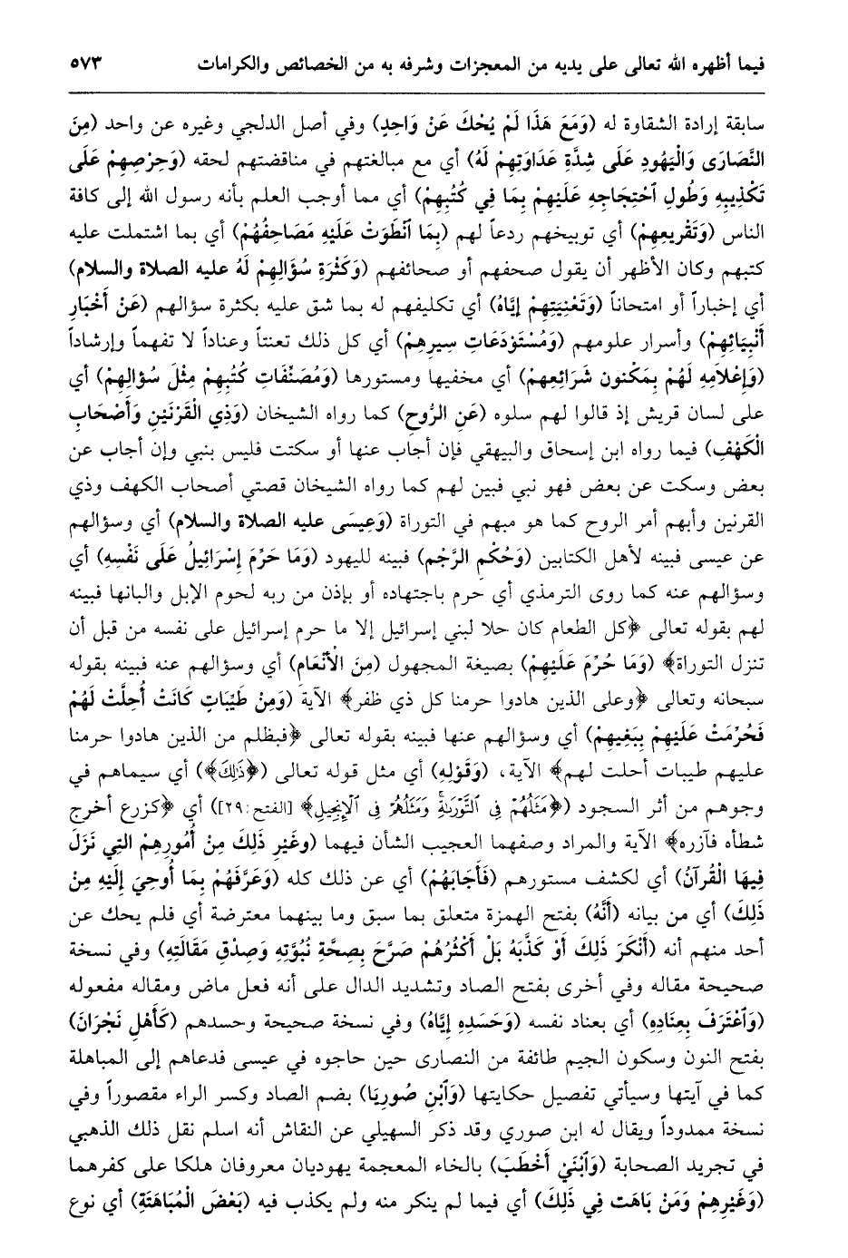 سابقة إرادة الشقاوة له (ومع هذا لم يحك عن واحد) وفي أصل الدلجي وغيره عَنْ وَاحِدٍ (مِنَ النَّصَارَى وَالْيَهُودِ عَلَى شِدَّةِ عداوتهم له) أي مع مبالغتهم في مناقضتهم لحقه (وَحِرْصِهِمْ عَلَى تَكْذِيبِهِ وَطُولِ احْتِجَاجِهِ عَلَيْهِمْ بِمَا في كتبهم) أي مما أوجب العلم بأنه رسول الله إلى كافة الناس (وتقريعهم) أي توبيخهم ردعا لهم (بما انطوت عليه مصاحفهم) أي بما اشتملت عليه كتبهم وكان الأظهر أن يقول صحفهم أو صحائفهم (وكثرة سؤالهم له عليه الصلاة والسلام) أي إخبارا أو امتحانا (وتعنيتهم إيّاه) أي تكليفهم له بما شق عليه بكثرة سؤالهم (عَنْ أَخْبَارِ أَنْبِيَائِهِمْ) وَأَسْرَارِ عُلُومِهِمْ (وَمُسْتَوْدَعَاتِ سِيَرِهِمْ) أي كل ذلك تعنتا وعنادا لا تفهما وإرشادا (وإعلامه لهم بمكنون شرائعهم) أي مخفيها ومستورها (ومصنّفات كتبهم مثل سؤالهم) أي على لسان قريش إذ قالوا لهم سلوه (عن الرّوح) كما رواه الشيخان (وذي القرنين وأصحاب الكهف) فيما رواه ابن إسحاق والبيهقي فإن أجاب عنها أو سكتت فليس بنبي وإن أجاب عن بعض وسكت عن بعض فهو نبي فبين لهم كما رواه الشيخان قصتي أصحاب الكهف وذي القرنين وأبهم أمر الروح كما هو مبهم في التوراة (وعيسى عليه الصلاة والسلام) أي وسؤالهم عن عيسى فبينه لأهل الكتابين (وحكم الرّجم) فبينه لليهود (وما حرّم إسرائيل على نفسه) أي وسؤالهم عنه كما روى الترمذي أي حرم باجتهاده أو بإذن من ربه لحوم الإبل والبانها فبينه لهم بقوله تعالى كُلُّ الطَّعامِ كانَ حِلًّا لِبَنِي إِسْرائِيلَ إِلَّا ما حَرَّمَ إِسْرائِيلُ عَلى نَفْسِهِ مِنْ قَبْلِ أَنْ تُنَزَّلَ التَّوْراةُ (وما حرّم عليهم) بصيغة المجهول (من الأنعام) أي وسؤالهم عنه فبينه بقوله سبحانه وتعالى وَعَلَى الَّذِينَ هادُوا حَرَّمْنا كُلَّ ذِي ظُفُرٍ الآية (ومن طيّبات كانت أحلّت لهم فحرّمت عليهم ببغيهم) أي وسؤالهم عنها فبينه بقوله تعالى فَبِظُلْمٍ مِنَ الَّذِينَ هادُوا حَرَّمْنا عَلَيْهِمْ طَيِّباتٍ أُحِلَّتْ لَهُمْ الآية، (وقوله) أي مثل قوله تعالى (ذلِكَ) أي سيماهم في وجوهم من أثر السجود (مَثَلُهُمْ فِي التَّوْراةِ وَمَثَلُهُمْ فِي الْإِنْجِيلِ [الْفَتْحِ: 29] ) أي كَزَرْعٍ أَخْرَجَ شَطْأَهُ فَآزَرَهُ الآية والمراد وصفهما العجيب الشأن فيهما (وَغَيْرِ ذَلِكَ مِنْ أُمُورِهِمُ الَّتِي نَزَلَ فِيهَا القرآن) أي لكشف مستورهم (فأجابهم) أي عن ذلك كله (وعرّفهم بما أوحي إليه من ذلك) أي من بيانه (أنّه) بفتح الهمزة متعلق بما سبق وما بينهما معترضة أي فلم يحك عن أحد منهم أَنَّهُ (أَنْكَرَ ذَلِكَ أَوْ كَذَّبَهُ بَلْ أَكْثَرُهُمْ صرّح بصحّة نبوّته وصدق مقالته) وفي نسخة صحيحة مقاله وفي أخرى بفتح الصاد وتشديد الدال على أنه فعل ماض ومقاله مفعوله (واعترف بعناده) أي بعناد نفسه (وحسده إيّاه) وفي نسخة صحيحة وحسدهم (كأهل نجران) بفتح النون وسكون الجيم طائفة من النصارى حين حاجوه في عيسى فدعاهم إلى المباهلة كما في آيتها وسيأتي تفصيل حكايتها (وابن صوريا) بضم الصاد وكسر الراء مقصورا وفي نسخة ممدودا ويقال له ابن صوري وقد ذكر السهيلي عن النقاش أنه اسلم نقل ذلك الذهبي في تجريد الصحابة (وابني أخطب) بالخاء المعجمة يهوديان معروفان هلكا على كفرهما (وغيرهم ومن باهت في ذلك) أي فيما لم ينكر منه ولم يكذب فيه (بعض المباهتة) أي نوع