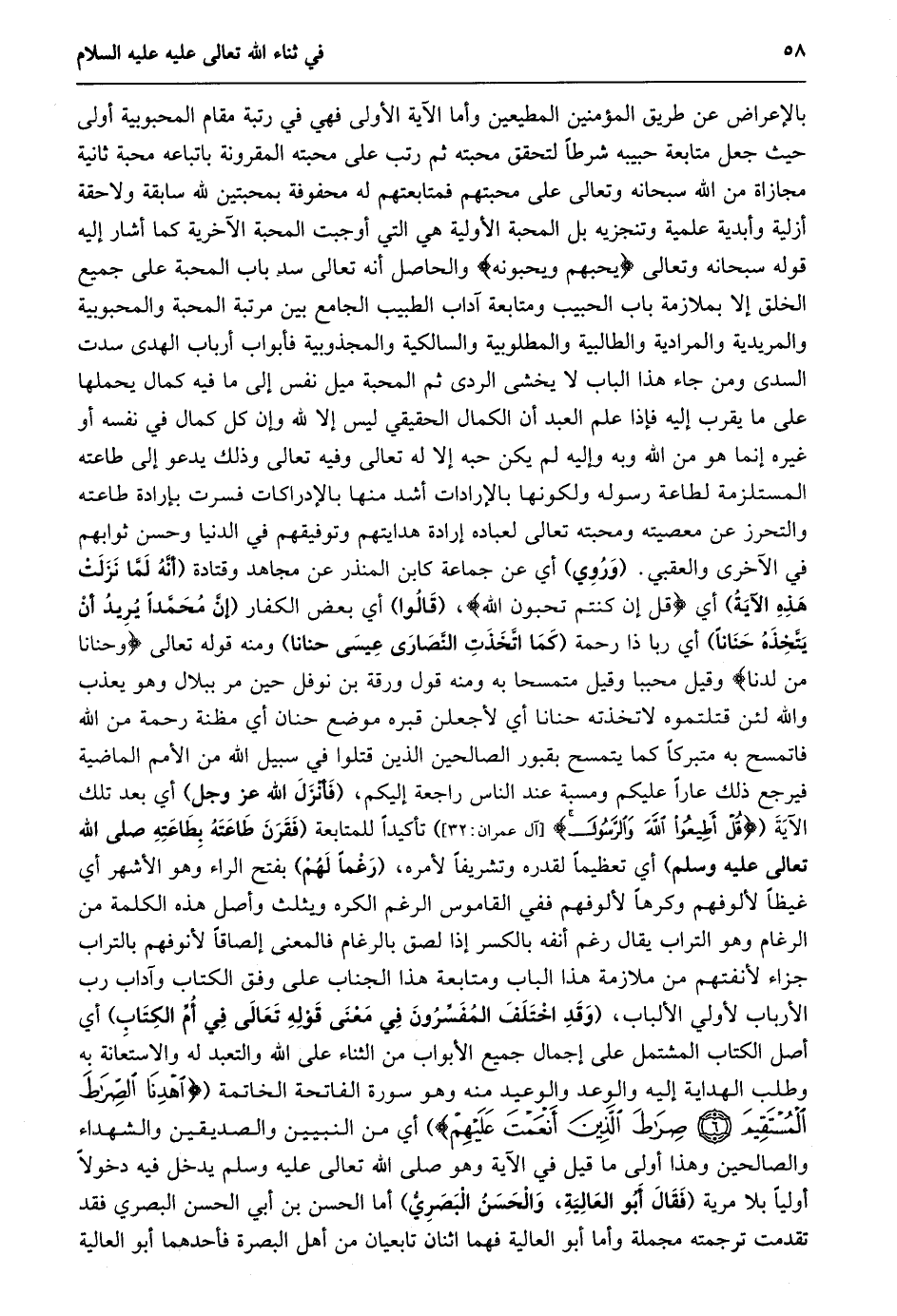 بالإعراض عن طريق المؤمنين المطيعين وأما الآية الأولى فهي في رتبة مقام المحبوبية أولى حيث جعل متابعة حبيبه شرطا لتحقق محبته ثم رتب على محبته المقرونة باتباعه محبة ثانية مجازاة من الله سبحانه وتعالى على محبتهم فمتابعتهم له محفوفة بمحبتين لله سابقة ولا حقة أزلية وأبدية علمية وتنجزيه بل المحبة الأولية هي التي أوجبت المحبة الآخرية كما أشار إليه قوله سبحانه وتعالى يُحِبُّهُمْ وَيُحِبُّونَهُ والحاصل أنه تعالى سد باب المحبة على جميع الخلق إلا بملازمة باب الحبيب ومتابعة آداب الطبيب الجامع بين مرتبة المحبة والمحبوبية والمريدية والمرادية والطالبية والمطلوبية والسالكية والمجذوبية فأبواب أرباب الهدى سدت السدى ومن جاء هذا الباب لا يخشى الردى ثم المحبة ميل نفس إلى ما فيه كمال يحملها على ما يقرب إليه فإذا علم العبد أن الكمال الحقيقي ليس إلا لله وإن كل كمال في نفسه أو غيره إنما هو من الله وبه وإليه لم يكن حبه إلا له تعالى وفيه تعالى وذلك يدعو إلى طاعته المستلزمة لطاعة رسوله ولكونها بالإرادات أشد منها بالإدراكات فسرت بإرادة طاعته والتحرز عن معصيته ومحبته تعالى لعباده إرادة هدايتهم وتوفيقهم في الدنيا وحسن ثوابهم في الآخرى والعقبي. (وروي) أي عن جماعة كابن المنذر عن مجاهد وقتادة (أنّه لمّا نزلت هذه الآية) أي قُلْ إِنْ كُنْتُمْ تُحِبُّونَ اللَّهَ، (قالوا) أي بعض الكفار (إنّ محمّدا يريد أن يتّخذه حنانا) أي ربا ذا رحمة (كما اتّخذت النّصارى عيسى حنانا) ومنه قوله تعالى وَحَناناً مِنْ لَدُنَّا وقيل محببا وقيل متمسحا به ومنه قول ورقة بن نوفل حين مر ببلال وهو يعذب والله لئن قتلتموه لاتخذته حنانا أي لأجعلن قبره موضع حنان أي مظنة رحمة من الله فاتمسح به متبركا كما يتمسح بقبور الصالحين الذين قتلوا في سبيل الله من الأمم الماضية فيرجع ذلك عارا عليكم ومسبة عند الناس راجعة إليكم، (فأنزل الله عز وجل) أي بعد تلك الْآيَةَ (قُلْ أَطِيعُوا اللَّهَ وَالرَّسُولَ [آلِ عِمْرَانَ: 32] ) تأكيدا للمتابعة (فقرن طاعته بطاعته صلى الله تعالى عليه وسلم) أي تعظيما لقدره وتشريفا لأمره، (رغما لهم) بفتح الراء وهو الأشهر أي غيظا لألوفهم وكرها لألوفهم ففي القاموس الرغم الكره ويثلث وأصل هذه الكلمة من الرغام وهو التراب يقال رغم أنفه بالكسر إذا لصق بالرغام فالمعنى إلصاقا لأنوفهم بالتراب جزاء لأنفتهم من ملازمة هذا الباب ومتابعة هذا الجناب على وفق الكتاب وآداب رب الأرباب لأولي الألباب، (وَقَدِ اخْتَلَفَ الْمُفَسِّرُونَ فِي مَعْنَى قَوْلِهِ تَعَالَى في أُمُّ الْكِتابِ) أي أصل الكتاب المشتمل على إجمال جميع الأبواب من الثناء على الله والتعبد له والاستعانة به وطلب الهداية إليه والوعد والوعيد منه وهو سورة الفاتحة الخاتمة (اهْدِنَا الصِّراطَ الْمُسْتَقِيمَ (6) صِراطَ الَّذِينَ أَنْعَمْتَ عَلَيْهِمْ) أي من النبيين والصديقين والشهداء والصالحين وهذا أولى ما قيل في الآية وهو صلى الله تعالى عليه وسلم يدخل فيه دخولا أوليا بلا مرية (فقال أبو العالية، والحسن البصريّ) أما الحسن بن أبي الحسن البصري فقد تقدمت ترجمته مجملة وأما أبو العالية فهما اثنان تابعيان من أهل البصرة فأحدهما أبو العالية