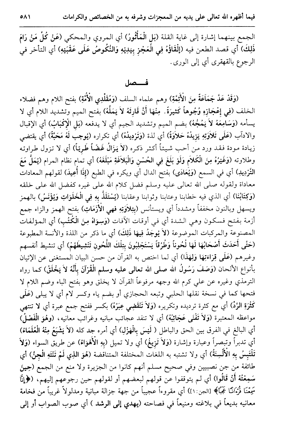 (وقد عدّ جماعة من الأئمّة) وهم علماء السلف (ومقلّدي الأمّة) بفتح اللام وهم فضلاء الخلف (فِي إِعْجَازِهِ وُجُوهًا كَثِيرَةً. مِنْهَا أَنَّ قَارِئَهُ لا يملّه) بفتح الميم وتشديد اللام أي لا يسأمه (وسامعه لا يمجّه) بضم الميم وتشديد الجيم أي لا يدفعه (بل الإكباب) أي الإقبال والآداب (على تلاوته يزيده حلاوة) أي لذة (وترديده) أي تكراره (يوجب له محبّة) أي يقتضي زيادة مودة فقد ورد من أحب شيئا أكثر ذكره (لا يزال غضّا طريّا) أي لا تزول طراوته وطلاوته (وَغَيْرُهُ مِنَ الْكَلَامِ وَلَوْ بَلَغَ فِي الْحُسْنِ والبلاغة مبلغه) أي تمام نظام المرام (يملّ مع التّرديد) أي في السمع (ويعادى) بفتح الدال أي ويكره في الطبع (إذا أعيد) لقولهم المعادات معاداة ولقوله صلى الله تعالى عليه وسلم فضل كلام الله على غيره كفضل الله على خلقه (وكتابنا) أي الذي فيه خطابنا وعتابنا وثوابنا وعقابنا (يستلذّ به في الخلوات ويؤنس) بالهمز ويسهل وبالنون مخففا ومشددا أي ويستأنس (بتلاوته فهي الأزمات) بفتح الهمز والزاء جمع أزمة بفتح فسكون وهي الشدة أي في أوقات الآفات (وسواه من الكتب) أي المؤلفات المصنوعة والمركبات الموضوعة (لا يوجد فيها ذلك) أي ما ذكر من اللذة والأنسة المطبوعة (حتّى أحدث أصحابها لها لحونا وطرقا يستجلبون بتلك اللّحون تنشيطهم) أي تنشيط أنفسهم وغيرهم (على قراءتها ولهذا) أي لما اختص به القرآن من حسن البيان المستغنى عن الإتيان بأنواع الألحان (وصف رسول الله صلى الله تعالى عليه وسلم القرآن بأنّه لا يخلق) كما رواه الترمذي وغيره عن علي كرم الله وجهه مرفوعا القرآن لا يخلق وهو بفتح الباء وضم اللام لا فتحها كما في نسخة نقلها الحلبي وتبعه الحجازي أو بضم ياء وكسر لام أي لا يبلى (على كثرة الرّدّ) أي مع كثرة ترديده وتكريره (ولا تنقضي عبره) بكسر ففتح جمع عبرة أي لا تنتهي مواعظه المعتبرة (ولا تفنى عجائبه) أي لا تنفد عجائب مبانيه وغرائب معانيه، (وهو الفصل) أي البالغ في الفرق بين الحق والباطل (ليس بالهزل) أي أمره جد كله (لا يشبع منه العلماء) أي تدبرا وتبصرا وعبارة وإشارة (ولا تزيغ) أي ولا تميل (به الأهواء) عن طريق السواء (ولا تلتبس به الألسنة) أي ولا تشتبه به اللغات المختلفة المتناقضة (هو الذي لم تنته الجنّ) أي طائفة من جن نصبيين وفي صحيح مسلم أنهم كانوا من الجزيرة ولا منع من الجمع (حين سمعته أن قالوا) أي لم يتوقفوا عن قولهم لبعضهم أو لقولهم حين رجوعهم إليهم، (إِنَّا سَمِعْنا قُرْآناً عَجَباً [الجن: 1] ) أي مقروءا عجيبا من جهة جزالة مبانية ومدلولا غريبا من فخامة معانيه بديعا في بلاغته ومنيعا في فصاحته (يهدي إلى الرشد) أي صوب الصواب أو إلى