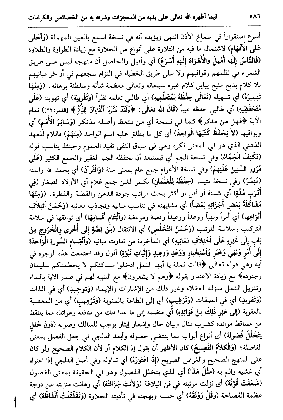 أسرع استقرارا في سماخ الأذن انتهى ويؤيده أنه في نسخة اسمع بالعين المهملة (وأحلى على الأفهام) لاشتمال ما فيه من التلاوة على أنواع من الحلاوة مع زيادة الطراوة والطلاوة (فالنّاس إليه أميل والأهواء إليه أسرع) أي وأقبل والحاصل أن منهجه ليس على طريق الشعراء في نظمهم وقوافيهم ولا على طريق الخطباء في التزام سجعهم في أواخر مبانيهم بلا كلام بديع منيع يباين كلام غيره سبحانه وتعالى معظمة شأنه وسلطنة برهانه. (ومنها تيسيره) أي تسهيله (تعالى حفظه لمتعلّميه) أي طالبي تعلمه نظرا (وتقريبه) أي تهوينه (على متحفّظيه) أي طالبي حفظه غيبا (قَالَ اللَّهُ تَعَالَى: وَلَقَدْ يَسَّرْنَا الْقُرْآنَ لِلذِّكْرِ [القمر: 22] ) تمام الآية فَهَلْ مِنْ مُدَّكِرٍ كما في نسخة أي من متعظ وأصله مذتكر (وسائر الأمم) أي وبواقيها (لا يحفظ كتبها الواحد) أي كل ما يطلق عليه اسم الواحد (منهم) فاللام للعهد الذهني الذي هو في المعنى نكرة وهي في سياق النفي تفيد العموم وحينئذ يناسب قوله (فكيف الجمّاء) وفي نسخة الجم أي فيستبعد أن يحفظه الجم الغفير والجمع الكثير (على مرور السّنين عليهم) وفي نسخة الأعوام جمع عام بمعنى سنة (والقرآن) أي بحمد الله والمنة (ميسّر) وفي نسخة متيسر (حفظه للغلمان) بكسر الغين جمع غلام أي الأولاد الصغار (في أقرب مدّة) أي كسنة أو أقل أو أكثر بحث مراتب جودة الذهن والفطنة والفطرة. (ومنها مشاكلة بعض أجزائه بعضا) أي مشابهته في تناسب مبانيه وتجاذب معانيه (وحسن ائتلاف أنواعها) أي أمرا ونهيا ووعدا ووعيدا وقصة وموعظة (والتئام أقسامها) أي توافقها في سلامة التركيب وسلاسة الترتيب (وحسن التّخلّص) أي الانتقال (مِنْ قِصَّةٍ إِلَى أُخْرَى وَالْخُرُوجِ مِنْ بَابٍ إلى غيره على اختلاف معانيه) أي المأخوذة من تفاوت مبانيه (وَانْقِسَامُ السُّورَةِ الْوَاحِدَةِ إِلَى أَمْرٍ وَنَهْيٍ وَخَبَرٍ واستخبار ووعد ووعيد وإثبات نبوّة) أقول وقد اجتمعت هذه الوجوه في آية وهي قوله تعالى قالَتْ نَمْلَةٌ يا أَيُّهَا النَّمْلُ ادْخُلُوا مَساكِنَكُمْ لا يَحْطِمَنَّكُمْ سُلَيْمانُ وَجُنُودُهُ مع زيادة الاعتذار بقوله وَهُمْ لا يَشْعُرُونَ مع التنبيه لهم في صدر الآية بالنداء وتنزيل النمل منزلة العقلاء وغير ذلك من الإشارات والإيماء (وتوحيد) أي في الذات (وتفريد) أي في الصفات (وترغيب) أي إلى الطاعة بالمثوبة (وترهيب) أي من المعصية بالعقوبة (إلى غير ذلك من فوائده) أي منضمة إلى ما عدا ذلك من منافعه وعوائده مما يلتقط من مساقط موائده كضرب مثال وبيان حال وإشعار إيثار يوجب للسالك وصوله (دون خلل يتخلّل فصوله) أي أنواع أبواب مما يقتضي حصوله وأبعد الدلجي في جعل الفصل بمعنى الفاصلة؛ (والكلام الفصيح) كان الأظهر أن يقول إذ الكلام أو لأن الكلام الصحيح ولو كان على المنهج الصحيح والغرض الصريح (إذا اعتوره) أي تداوله وفي أصل الدلجي إذا اعتراه أي غشيه والم به (مثل هذا) أي الذي يتخلل الفصول وهو في الحقيقة بمعنى الفضول (ضعفت قوّته) أي نزلت مرتبته في فن البلاغة (ولانت جزالته) أي وهانت منزلته عن درجة عظمة الفصاحة (وقلّ رونقه) أي حسنه وبهجته في تأديته الحلاوة (وتقلقلت ألفاظه) أي