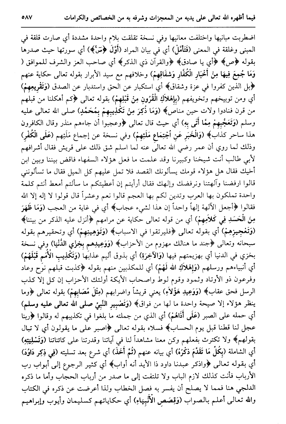 اضطربت مبانيها واختلفت معانيها وفي نسخة تقلقت بلام واحدة مشددة أي صارت قلقة في المبنى وغلقة في المعنى (فتأمّل) أي في بيان المراد (أوّل ص) أي سورتها حيث صدرها بقوله ص أي يا صادق وَالْقُرْآنِ ذِي الذِّكْرِ أي صاحب العز والشرف للموافق (وما جمع فيها من أخبار الكفّار وشفاقهم) وخلافهم مع سيد الأبرار بقوله تعالى حكاية عنهم بَلِ الَّذِينَ كَفَرُوا فِي عِزَّةٍ وَشِقاقٍ أي استكبار عن الحق واستدبار عن الصدق (وتقريعهم) أي ومن توبيخهم وتخويفهم (بإهلاك القرون من قبلهم) بقوله تعالى كَمْ أَهْلَكْنا مِنْ قَبْلِهِمْ مِنْ قَرْنٍ فَنادَوْا وَلاتَ حِينَ مَناصٍ (وَمَا ذُكِرَ مِنْ تَكْذِيبِهِمْ بِمُحَمَّدٍ) صَلَّى اللَّهُ تعالى عليه وسلم (وتعجّبهم ممّا أتى به) أي حيث قال تعالى وَعَجِبُوا أَنْ جاءَهُمْ مُنْذِرٌ مِنْهُمْ وَقالَ الْكافِرُونَ هذا ساحِرٌ كَذَّابٌ (والخبر عن اجتماع ملئهم) وفي نسخة عن إجماع ملئهم (على الكفر) وذلك لما روي أن عمر رضي الله تعالى عنه لما اسلم شق ذلك على قريش فقال أشرافهم لأبي طالب أنت شيخنا وكبيرنا وقد علمت ما فعل هؤلاء السفهاء فاقض بيننا وبين ابن أخيك فقال هل هؤلاء قومك يسألونك القصد فلا تمل عليهم كل الميل فقال ما تسألونني قالوا ارفضنا وآلهتنا ونرفضك وإلهك فقال أرأيتم إن أعطيتكم ما سألتم أمعط أنتم كلمة واحدة تملكون بها العرب وتدين لكم بها العجم قالوا نعم وعشرا قال قولوا لا إله إلا الله فقالوا أَجَعَلَ الْآلِهَةَ إِلهاً واحِداً إِنَّ هذا لَشَيْءٌ عُجابٌ أي في غاية من العجب (وما ظهر من الحسد في كلامهم) أي من قوله تعالى حكاية عن مرامهم أُنْزِلَ عَلَيْهِ الذِّكْرُ مِنْ بَيْنِنا (وتعجيزهم) أي بقوله تعالى فَلْيَرْتَقُوا فِي الْأَسْبابِ (وتوهينهم) أي وتحقيرهم بقوله سبحانه وتعالى جُنْدٌ ما هُنالِكَ مَهْزُومٌ مِنَ الْأَحْزابِ (ووعيدهم بخزي الدّنيا) وفي نسخة بخزي في الدنيا أي بهزيمتهم فيها (والآخرة) أي بذوق أليم عذابها (وتكذيب الأمم قبلهم) أي أنبياءهم ورسلهم (وإهلاك الله لهم) أي للمكذبين منهم بقوله كَذَّبَتْ قَبْلَهُمْ قَوْمُ نُوحٍ وَعادٌ وَفِرْعَوْنُ ذُو الْأَوْتادِ وَثَمُودُ وَقَوْمُ لُوطٍ وَأَصْحابُ الْأَيْكَةِ أُولئِكَ الْأَحْزابُ إِنْ كُلٌّ إِلَّا كَذَّبَ الرُّسُلَ فَحَقَّ عِقابِ (ووعيد هؤلاء) يعني قريشا واضرابهم (مثل مصابهم) بقوله تعالى وَما يَنْظُرُ هؤُلاءِ إِلَّا صَيْحَةً واحِدَةً ما لَها مِنْ فَواقٍ (وتصبير النّبيّ صلى الله تعالى عليه وسلم) أي حمله على الصبر (على أذاهم) أي الذي من جملته ما بلغوا في تكذيبهم له وقالوا رَبَّنا عَجِّلْ لَنا قِطَّنا قَبْلَ يَوْمِ الْحِسابِ فسلاه بقوله تعالى اصْبِرْ عَلى ما يَقُولُونَ أي لا تبال بقولهم ولا تكترث بفعلهم وكن معنا مشاهدا لنا في آياتنا وقدرتنا على كائناتنا (وتسليته) أي الشاملة (بكلّ ما تقدّم ذكره) أي بيانه عنهم (ثمّ أخذ) أي شرع بعد تسليته (في ذكر داود) أي بقوله تعالى وَاذْكُرْ عَبْدَنا داوُدَ ذَا الْأَيْدِ إِنَّهُ أَوَّابٌ أي كثير الرجوع إلى أبواب رب الأرباب فأنت كذلك لازم الباب ولا تلتفت إلى ما صدر من أرباب الحجاب وأما ما ذكره الدلجي هنا فمما لا يصلح أن يفسر به فصل الخطاب ولذا أعرضت عن ذكره في الكتاب والله تعالى أعلم بالصواب (وقصص الأنبياء) أي حكاياتهم كسليمان وأيوب وإبراهيم