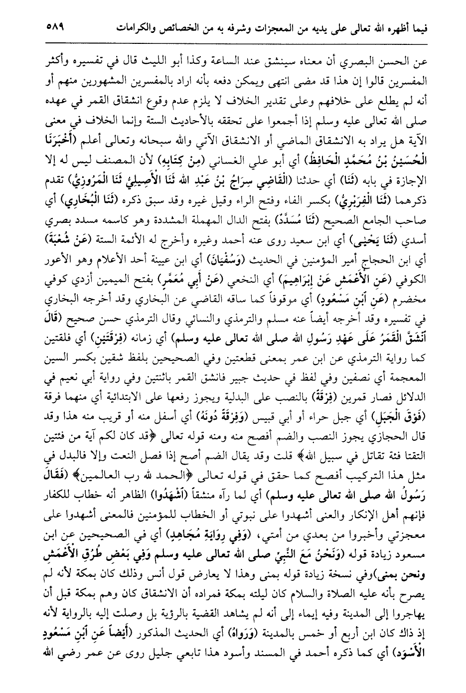 عن الحسن البصري أن معناه سينشق عند الساعة وكذا أبو الليث قال في تفسيره وأكثر المفسرين قالوا إن هذا قد مضى انتهى ويمكن دفعه بأنه اراد بالمفسرين المشهورين منهم أو أنه لم يطلع على خلافهم وعلى تقدير الخلاف لا يلزم عدم وقوع انشقاق القمر في عهده صلى الله تعالى عليه وسلم إذا أجمعوا على تحققه بالأحاديث الستة وإنما الخلاف في معنى الآية هل يراد به الانشقاق الماضي أو الانشقاق الآتي والله سبحانه وتعالى أعلم (أخبرنا الحسين بن محمّد الحافظ) أي أبو علي الغساني (من كتابه) لأن المصنف ليس له إلا الإجازة في بابه (ثنا) أي حدثنا (القاضي سراج بن عبد الله ثنا الأصيليّ ثنا المروزيّ) تقدم ذكرهما (ثنا الفربريّ) بكسر الفاء وفتح الراء وقيل غيره وقد سبق ذكره (ثنا البخاري) أي صاحب الجامع الصحيح (ثنا مسدّد) بفتح الدال المهملة المشددة وهو كاسمه مسدد بصري أسدي (ثنا يحيى) أي ابن سعيد روى عنه أحمد وغيره وأخرج له الأئمة الستة (عن شعبة) أي ابن الحجاج أمير المؤمنين في الحديث (وسفيان) أي ابن عيينة أحد الأعلام وهو الأعور الكوفي (عن الأعمش عن إبراهيم) أي النخعي (عن أبي معمّر) بفتح الميمين أزدي كوفي مخضرم (عن ابن مسعود) أي موقوفا كما ساقه القاضي عن البخاري وقد أخرجه البخاري في تفسيره وقد أخرجه أيضا عنه مسلم والترمذي والنسائي وقال الترمذي حسن صحيح (قَالَ انْشَقَّ الْقَمَرُ عَلَى عَهْدِ رَسُولِ اللَّهِ صلى الله تعالى عليه وسلم) أي زمانه (فرقتين) أي فلقتين كما رواية الترمذي عن ابن عمر بمعنى قطعتين وفي الصحيحين بلفظ شقين بكسر السين المعجمة أي نصفين وفي لفظ في حديث جبير فانشق القمر باثنتين وفي رواية أبي نعيم في الدلائل فصار قمرين (فرقة) بالنصب على البدلية ويجوز رفعها على الابتدائية أي منهما فرقة (فوق الجبل) أي جبل حراء أو أبي قبيس (وفرقة دونه) أي أسفل منه أو قريب منه هذا وقد قال الحجازي يجوز النصب والضم أفصح منه ومنه قوله تعالى قَدْ كانَ لَكُمْ آيَةٌ فِي فِئَتَيْنِ الْتَقَتا فِئَةٌ تُقاتِلُ فِي سَبِيلِ اللَّهِ قلت وقد يقال الضم أصح إذا فصل النعت وإلا فالبدل في مثل هذا التركيب أفصح كما حقق في قوله تعالى الْحَمْدُ لِلَّهِ رَبِّ الْعالَمِينَ (فقال رسول الله صلى الله تعالى عليه وسلم) أي لما رآه منشقا (اشهدوا) الظاهر أنه خطاب للكفار فإنهم أهل الإنكار والعنى أشهدوا على نبوتي أو الخطاب للمؤمنين فالمعنى أشهدوا على معجزتي وأخبروا من بعدي من أمتي، (وفي رواية مجاهد) أي في الصحيحين عن ابن مسعود زيادة قوله (ونحن مع النّبيّ صلى الله تعالى عَلَيْهِ وَسَلَّمَ وَفِي بَعْضِ طُرُقِ الْأَعْمَشِ وَنَحْنُ بمنى) وفي نسخة زيادة قوله بمنى وهذا لا يعارض قول أنس وذلك كان بمكة لأنه لم يصرح بأنه عليه الصلاة والسلام كان ليلته بمكة فمراده أن الانشقاق كان وهم بمكة قبل أن يهاجروا إلى المدينة وفيه إيماء إلى أنه لم يشاهد القضية بالرؤية بل وصلت إليه بالرواية لأنه إذ ذاك كان ابن أربع أو خمس بالمدينة (ورواه) أي الحديث المذكور (أيضا عن ابن مسعود الأسود) أي كما ذكره أحمد في المسند وأسود هذا تابعي جليل روى عن عمر رضي الله