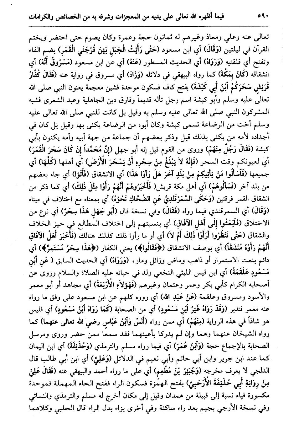 تعالى عنه وعلي ومعاذ وغيرهم له ثمانون حجة وعمرة وكان يصوم حتى احتضر ويختم القرآن في ليلتين (وقال) أي ابن مسعود (حتّى رأيت الجبل بين فرجتي القمر) بضم الفاء وتفتح أي فلقتيه (ورواه) أي الحديث المسطور (عنه) أي ابن مسعود (مسروق أنّه) أي انشقاقه (كان بمكّة) كما رواه البيهقي في دلائله (وزاد) أي مسروق في رواية عنه (فَقَالَ كُفَّارُ قُرَيْشٍ سَحَرَكُمُ ابْنُ أَبِي كَبْشَةَ) بفتح كاف فسكون موحدة فشين معجمة يعنون النبي صلى الله تعالى عليه وسلم وأبو كبشة اسم رجل تأله قديما وفارق دين الجاهلية وعبد الشعرى فشبه المشركون النبي صلى الله تعالى عليه وسلم به وقيل بل كانت للنبي صلى الله تعالى عليه وسلم أخت من الرضاعة تسمى كبشة وكان أبوه من الرضاعة يكنى بها وقيل بل كان في أجداده لأمه من يكنى بذلك قيل وذكر بعضهم أن جماعة من جهة أبيه وأمه يكنون بأبي كبشة (فقال رجل منهم) وروى من القوم قيل إنه أبو جهل (إنّ محمّدا إن كان سحر القمر) أي لعيونكم وقت السحر (فَإِنَّهُ لَا يَبْلُغُ مِنْ سِحْرِهِ أَنْ يَسْحَرَ الأرض) أي أهلها (كلّها) أي جميعها (فَاسْأَلُوا مَنْ يَأْتِيكُمْ مِنْ بَلَدٍ آخَرَ هَلْ رأوا هذا) أي الانشقاق (فأتوا) أي جاء بعضهم من بلد آخر (فسألوهم) أي أهل مكة قريش (فأخبروهم أنّهم رأوا مثل ذلك) أي كما ذكر من انشقاق القمر فرقتين (وحكى السّمرقنديّ عن الضّحّاك نحوه) أي بمعناه مع اختلاف في مبناه (وقال) أي السمرقندي فيما رواه (فقال) وفي نسخة قال (أبو جهل هذا سحر) أي نوع من الاختلاق (فابعثوا إلى أهل الآفاق) أي بنسبتهم إلى اختلاف المطالع في حيز الخلاف والشقاق (حتّى تنظروا أرأوا ذلك أم لا) أي أو ما رأوا ذلك كذلك هنالك (فأخبر أهل الآفاق أنّهم رأوه منشقا) أي بوصف الانشقاق (فقالوا) يعني الكفار (هذا سِحْرٌ مُسْتَمِرٌّ) أي دائم بنعت الاستمرار أو ذاهب وماض وزائل ومار، (ورواه) أي الحديث السابق (عن ابن مسعود علقمة) أي ابن قيس الليثي النخعي ولد في حياته عليه الصلاة والسلام وروى عن أصحابه الكرام كأبي بكر وعمر وعثمان وغيرهم (فهؤلاء الأربعة) أي مجاهد أو أبو معمر والأسود ومسروق وعلقمة (عن عبد الله) أي رووه كلهم عن ابن مسعود على وفق ما رواه عنه معمر فتدبر (وقد رواه غير ابن مسعود) أي من الصحابة (كما رواه ابن مسعود) أي فليس هو شاذا في هذه الرواية (منهم) أي ممن رواه (أنس وابن عبّاس رضي الله تعالى عنهما) كما رواه الشيخان عنهما وهما وإن لم يدركا بأعينهما فقد سمعا ممن حضر وروى ومرسل الصحابة بالإجماع حجة (وابن عمر) أي فيما رواه مسلم والترمذي (وحذيفة) أي ابن اليمان كما عند ابن جرير وابن أبي حاتم وأبي نعيم في الدلائل (وعليّ) أي ابن أبي طالب قال الدلجي لا يعرف مخرجه (وجبير بن مطعم) أي على ما رواه أحمد والبيهقي عنه (فَقَالَ عَلِيٌّ مِنْ رِوَايَةِ أَبِي حُذَيْفَةَ الْأَرْحَبِيِّ) بفتح الهمزة فسكون الراء ففتح الحاء المهملة فموحدة مكسورة فياء نسبة إلى قبيلة من همدان وقيل إلى مكان أخرج له مسلم والترمذي والنسائي وفي نسخة الأرجي بجيم بعد راء ساكنة وفي أخرى بزاء بدل الراء قال الحلبي وكلاهما