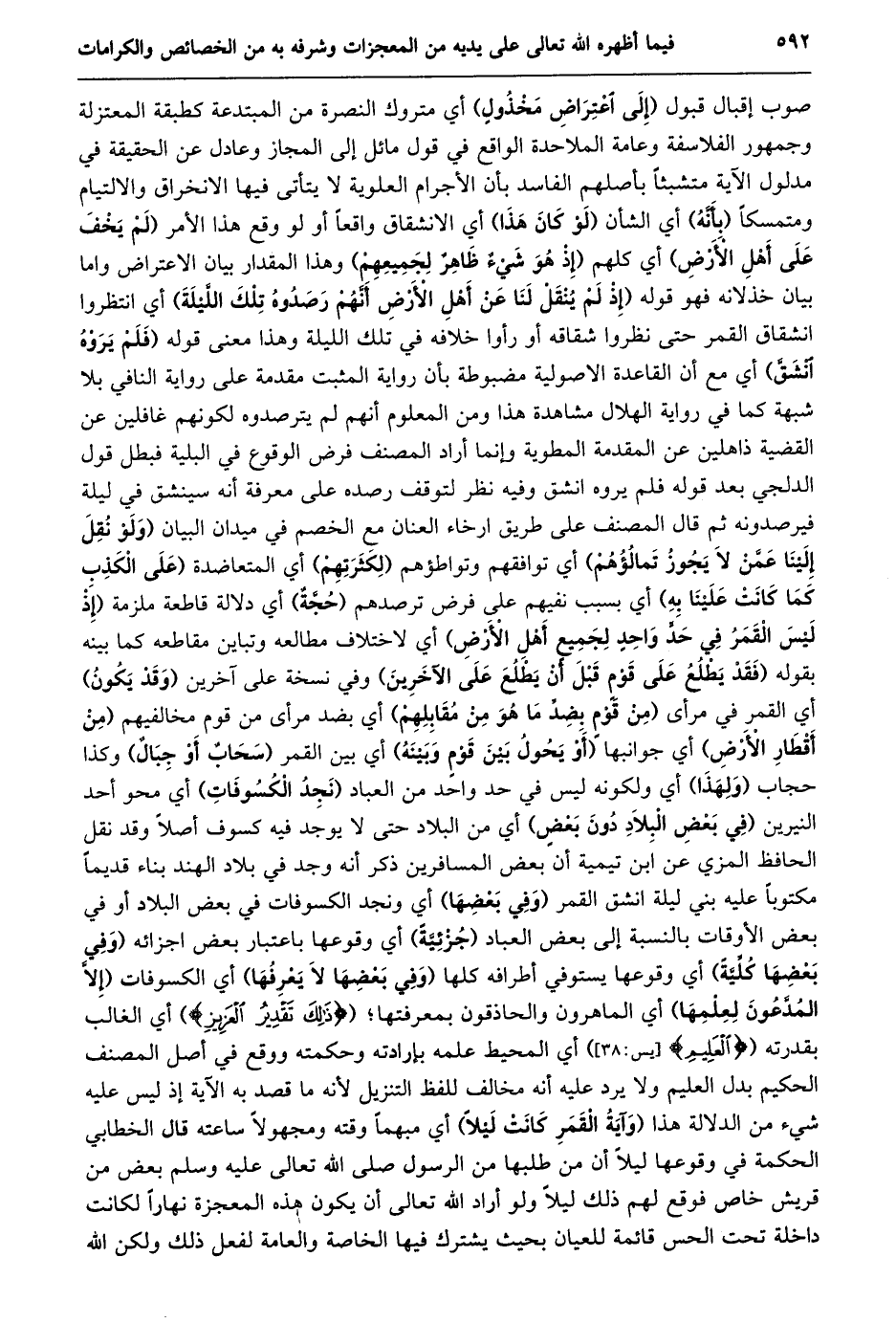 صوب إقبال قبول (إلى اعتراض مخذول) أي متروك النصرة من المبتدعة كطبقة المعتزلة وجمهور الفلاسفة وعامة الملاحدة الواقع في قول مائل إلى المجاز وعادل عن الحقيقة في مدلول الآية متشبثا بأصلهم الفاسد بأن الأجرام العلوية لا يتأتى فيها الانخراق والالتيام ومتمسكا (بأنّه) أي الشأن (لو كان هذا) أي الانشقاق واقعا أو لو وقع هذا الأمر (لم يخف على أهل الأرض) أي كلهم (إذ هو شيء ظاهر لجميعهم) وهذا المقدار بيان الاعتراض واما بيان خذلانه فهو قوله (إِذْ لَمْ يُنْقَلْ لَنَا عَنْ أَهْلِ الْأَرْضِ أنّهم رصدوه تلك اللّيلة) أي انتظروا انشقاق القمر حتى نظروا شقاقه أو رأوا خلافه في تلك الليلة وهذا معنى قوله (فلم يروه انشقّ) أي مع أن القاعدة الاصولية مضبوطة بأن رواية المثبت مقدمة على رواية النافي بلا شبهة كما في رواية الهلال مشاهدة هذا ومن المعلوم أنهم لم يترصدوه لكونهم غافلين عن القضية ذاهلين عن المقدمة المطوية وإنما أراد المصنف فرض الوقوع في البلية فبطل قول الدلجي بعد قوله فلم يروه انشق وفيه نظر لتوقف رصده على معرفة أنه سينشق في ليلة فيرصدونه ثم قال المصنف على طريق ارخاء العنان مع الخصم في ميدان البيان (وَلَوْ نُقِلَ إِلَيْنَا عَمَّنْ لَا يَجُوزُ تَمَالُؤُهُمْ) أي توافقهم وتواطؤهم (لكثرتهم) أي المتعاضدة (على الكذب كما كانت علينا به) أي بسبب نفيهم على فرض ترصدهم (حجّة) أي دلالة قاطعة ملزمة (إِذْ لَيْسَ الْقَمَرُ فِي حَدٍّ وَاحِدٍ لِجَمِيعِ أهل الأرض) أي لاختلاف مطالعه وتباين مقاطعه كما بينه بقوله (فَقَدْ يَطْلُعُ عَلَى قَوْمٍ قَبْلَ أَنْ يَطْلُعَ على الآخرين) وفي نسخة على آخرين (وقد يكون) أي القمر في مرأى (مِنْ قَوْمٍ بِضِدِّ مَا هُوَ مِنْ مُقَابِلِهِمْ) أي بضد مرأى من قوم مخالفيهم (من أقطار الأرض) أي جوانبها (أو يحول بين قوم وبينه) أي بين القمر (سحاب أو جبال) وكذا حجاب (ولهذا) أي ولكونه ليس في حد واحد من العباد (نجد الكسوفات) أي محو أحد النيرين (في بعض البلاد دون بعض) أي من البلاد حتى لا يوجد فيه كسوف أصلا وقد نقل الحافظ المزي عن ابن تيمية أن بعض المسافرين ذكر أنه وجد في بلاد الهند بناء قديما مكتوبا عليه بني ليلة انشق القمر (وفي بعضها) أي ونجد الكسوفات في بعض البلاد أو في بعض الأوقات بالنسبة إلى بعض العباد (جزئيّة) أي وقوعها باعتبار بعض اجزائه (وفي بعضها كلّيّة) أي وقوعها يستوفي أطرافه كلها (وفي بعضها لا يعرفها) أي الكسوفات (إلّا المدّعون لعلمها) أي الماهرون والحاذقون بمعرفتها؛ (ذلِكَ تَقْدِيرُ الْعَزِيزِ) أي الغالب بقدرته (الْعَلِيمِ [يس: 38] ) أي المحيط علمه بإرادته وحكمته ووقع في أصل المصنف الحكيم بدل العليم ولا يرد عليه أنه مخالف للفظ التنزيل لأنه ما قصد به الآية إذ ليس عليه شيء من الدلالة هذا (وآية القمر كانت ليلا) أي مبهما وقته ومجهولا ساعته قال الخطابي الحكمة في وقوعها ليلا أن من طلبها من الرسول صلى الله تعالى عليه وسلم بعض من قريش خاص فوقع لهم ذلك ليلا ولو أراد الله تعالى أن يكون هذه المعجزة نهارا لكانت داخلة تحت الحس قائمة للعيان بحيث يشترك فيها الخاصة والعامة لفعل ذلك ولكن الله