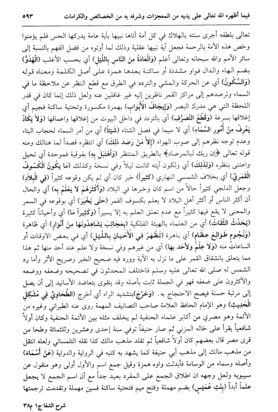 تعالى بلطفه أجرى سنته بالهلاك في كل أمة أتاها نبيها بآية عامة يدركها الحس فلم يؤمنوا وخص هذه الأمة بالرحمة فجعل آية نبيها عقلية وذلك لما أوتوه من فضل الفهم بالنسبة إلى سائر الأمم والله سبحانه وتعالى أعلم (والعادة من النّاس باللّيل) أي بحسب الأغلب (الهدوّ) بضم الهاء والدال فواو مشددة أو ساكنة بعدها همزة على أصل الكلمة ومعناه قوله (والسّكون) أي عن الحركة والمشي والتردد في الطرق مع قطع النظر عن ملاحظة ما في السماء وترصدهم إلى مراكز القمر ناظرين إليه غير غافلين عنه ولعل ذلك إنما كان في قدر اللحظة التي هي مدرك البصر (وإيجاف الأبواب) بهمزة مكسورة وتحتية ساكنة فجيم أي إغلاقها بسرعة (وقطع التّصرّف) أي بالتردد في داخل البيوت من إغلاقها واعماقها (ولا يكاد يعرف من أمور السّماء) أي لا سيما في فصل الشتاء (شيئا) أي من أمر السماء لحجاب البناء وعدم توجه نظرهم إى صوب الهواء (إلّا من رصد ذلك) أي انتظره قصدا لما هنالك ومنه قوله تعالى إِنَّ رَبَّكَ لَبِالْمِرْصادِ بالطريق المنتظر (واهتبل به) بفوقية فموحدة أي تحيل واعتنى بنظره (ولذلك) أي ولكون آيته كانت ليلا وفي نسخة وكذلك (ما يكون الكسوف القمريّ) أي بخلاف الشمسي النهاري (كثيرا) خبر كان أي لم يكن وقوعه كثيرا (في البلاد) وجعل الدلجي كثيرا حالا من اسم كان وخبرها في البلاد (وأكثرهم لا يعلم به) أي والحال أن أكثر الناس أو أكثر أهل البلاد لا يعلم بكسوف القمر (حتّى يخبر) أي بوقوعه في السمر والمعنى لا يقع فيها كثيرا مع عدم تعلق العلم به إلا يسيرا (وكثيرا ما) أي وأحيانا كثيرة (يحدّث الثّقات) أي من العلماء بالهيئة الفلكية (بعجائب يشاهدونها من أنوار) أي ظاهرة (ونجوم طوالع عظام) أي باهرة (تظهر في الأحيان باللّيل) أي في بعض الاوقات أو الساعات منه (ولا علم ولأحد بها) أي من غيرهم وفي نسخة ولا علم عند أحد منها ثم هذا مما يتعلق بانشقاق القمر على ما نزل به الآية وورد فيه صحيح الخبر وصريح الأثر وأما رد الشمس له صلى الله تعالى عليه وسلم فاختلف المحدثون في تصحيحه وضعفه ووضعه والأكثرون على ضعفه فهو في الجملة ثابت بأصله وقد يتقوى بتعاضد الأسانيد إلى أن يصل إلى مرتبة حسنة فيصح الاحتجاج به. (وخرّج) بتشديد الراء أي أخرج (الطّحاويّ في مشكل الحديث) وهو الإمام الحافظ العلامة صاحب التصانيف المهمة روى عنه الطبراني وغيره من الأئمة وهو مصري من أكابر علماء الحنفية لم يخلف مثله بين الأئمة الحنفية وكان أولا شافعيا يقرأ على خاله المزني ثم صار حنيفا توفي سنة إحدى وعشرين وثلثمائة وطحا من قرى مصر قال بعضهم كان أولا شافعيا ثم تقلد مذهب مالك كذا نقله التلمساني ولعله انتقل من مذهب مالك إلى مذهب أبي حنيفة كما يشهد به كتبه في الرواية والدراية (عن أسماء) وأصله وسماء من الوسامة فأبدلت واوه همزة وقيل جمع اسم والأول أولى وهو منقول عن سيبويه ولعل وجهه ان اطلاق الجمع على المفرد بعيد جدا مع أن اسم الجمع لا يجعل علما أبدا (بنت عميس) بضم مهملة وفتح ميم فتحتية ساكنة فسين مهملة وتقدمت ترجمتها