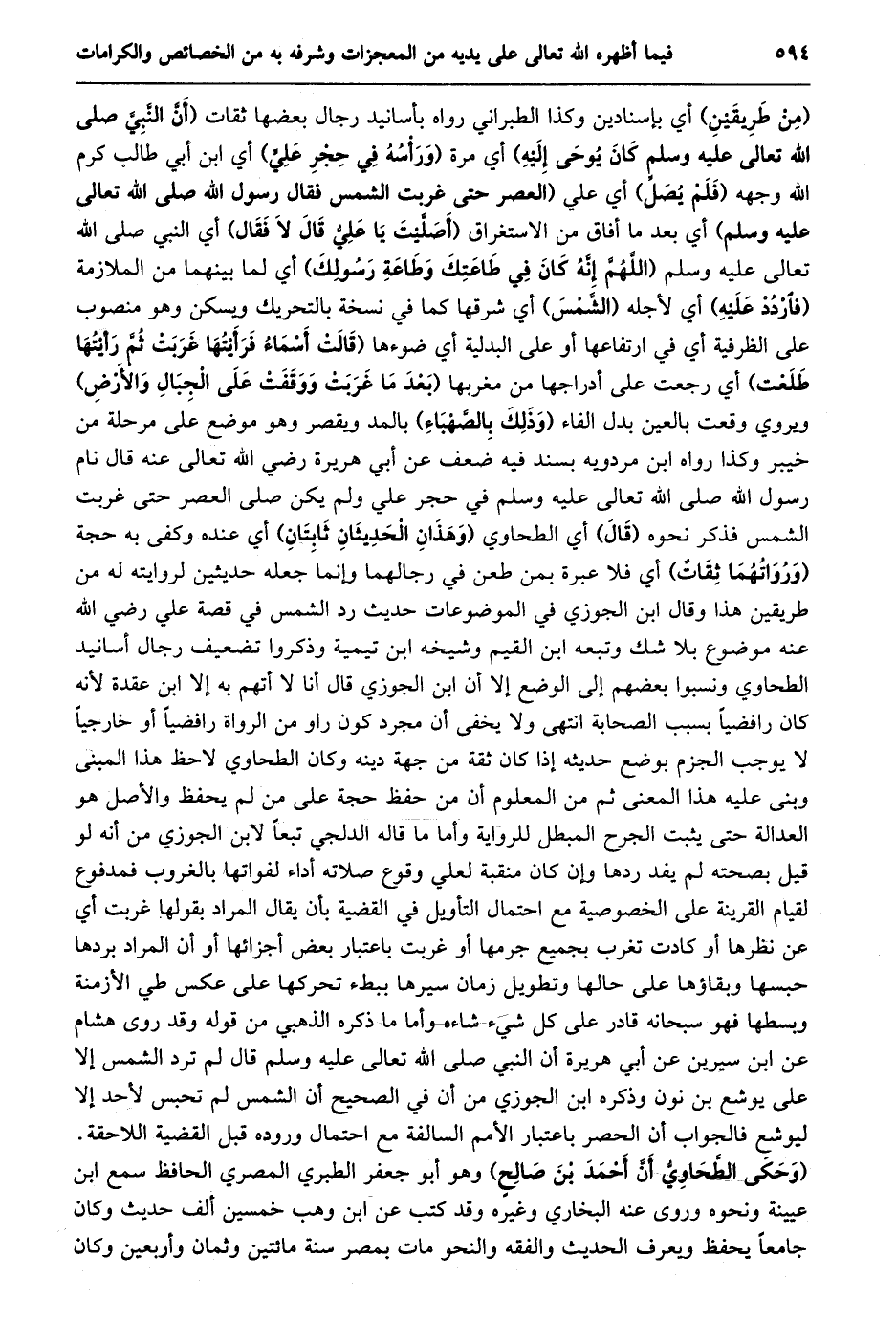 (من طريقين) أي بإسنادين وكذا الطبراني رواه بأسانيد رجال بعضها ثقات (أنّ النّبيّ صلى الله تعالى عليه وسلم كان يوحى إليه) أي مرة (ورأسه في حجر عليّ) أي ابن أبي طالب كرم الله وجهه (فلم يصلّ) أي علي (الْعَصْرَ حَتَّى غَرَبَتِ الشَّمْسُ فَقَالَ رَسُولُ اللَّهِ صلى الله تعالى عليه وسلم) أي بعد ما أفاق من الاستغراق (أصلّيت يا عليّ قال لا فقال) أي النبي صلى الله تعالى عليه وسلم (اللَّهُمَّ إِنَّهُ كَانَ فِي طَاعَتِكَ وَطَاعَةِ رَسُولِكَ) أي لما بينهما من الملازمة (فاردد عليه) أي لأجله (الشّمس) أي شرقها كما في نسخة بالتحريك ويسكن وهو منصوب على الظرفية أي في ارتفاعها أو على البدلية أي ضوءها (قالت أسماء فرأيتها غربت ثمّ رأيتها طلعت) أي رجعت على أدراجها من مغربها (بَعْدَ مَا غَرَبَتْ وَوَقَفَتْ عَلَى الْجِبَالِ وَالْأَرْضِ) ويروي وقعت بالعين بدل الفاء (وذلك بالصّهباء) بالمد ويقصر وهو موضع على مرحلة من خيبر وكذا رواه ابن مردويه بسند فيه ضعف عن أبي هريرة رضي الله تعالى عنه قال نام رسول الله صلى الله تعالى عليه وسلم في حجر علي ولم يكن صلى العصر حتى غربت الشمس فذكر نحوه (قال) أي الطحاوي (وهذان الحديثان ثابتان) أي عنده وكفى به حجة (ورواتهما ثقات) أي فلا عبرة بمن طعن في رجالهما وإنما جعله حديثين لروايته له من طريقين هذا وقال ابن الجوزي في الموضوعات حديث رد الشمس في قصة علي رضي الله عنه موضوع بلا شك وتبعه ابن القيم وشيخه ابن تيمية وذكروا تضعيف رجال أسانيد الطحاوي ونسبوا بعضهم إلى الوضع إلا أن ابن الجوزي قال أنا لا أتهم به إلا ابن عقدة لأنه كان رافضيا بسبب الصحابة انتهى ولا يخفى أن مجرد كون راو من الرواة رافضيا أو خارجيا لا يوجب الجزم بوضع حديثه إذا كان ثقة من جهة دينه وكان الطحاوي لاحظ هذا المبنى وبنى عليه هذا المعنى ثم من المعلوم أن من حفظ حجة على من لم يحفظ والأصل هو العدالة حتى يثبت الجرح المبطل للرواية وأما ما قاله الدلجي تبعا لابن الجوزي من أنه لو قيل بصحته لم يفد ردها وإن كان منقبة لعلي وقوع صلاته أداء لفواتها بالغروب فمدفوع لقيام القرينة على الخصوصية مع احتمال التأويل في القضية بأن يقال المراد بقولها غربت أي عن نظرها أو كادت تغرب بجميع جرمها أو غربت باعتبار بعض أجزائها أو أن المراد بردها حبسها وبقاؤها على حالها وتطويل زمان سيرها ببطء تحركها على عكس طي الأزمنة وبسطها فهو سبحانه قادر على كل شيء شاءه وأما ما ذكره الذهبي من قوله وقد روى هشام عن ابن سيرين عن أبي هريرة أن النبي صلى الله تعالى عليه وسلم قال لم ترد الشمس إلا على يوشع بن نون وذكره ابن الجوزي من أن في الصحيح أن الشمس لم تحبس لأحد إلا ليوشع فالجواب أن الحصر باعتبار الأمم السالفة مع احتمال وروده قبل القضية اللاحقة.