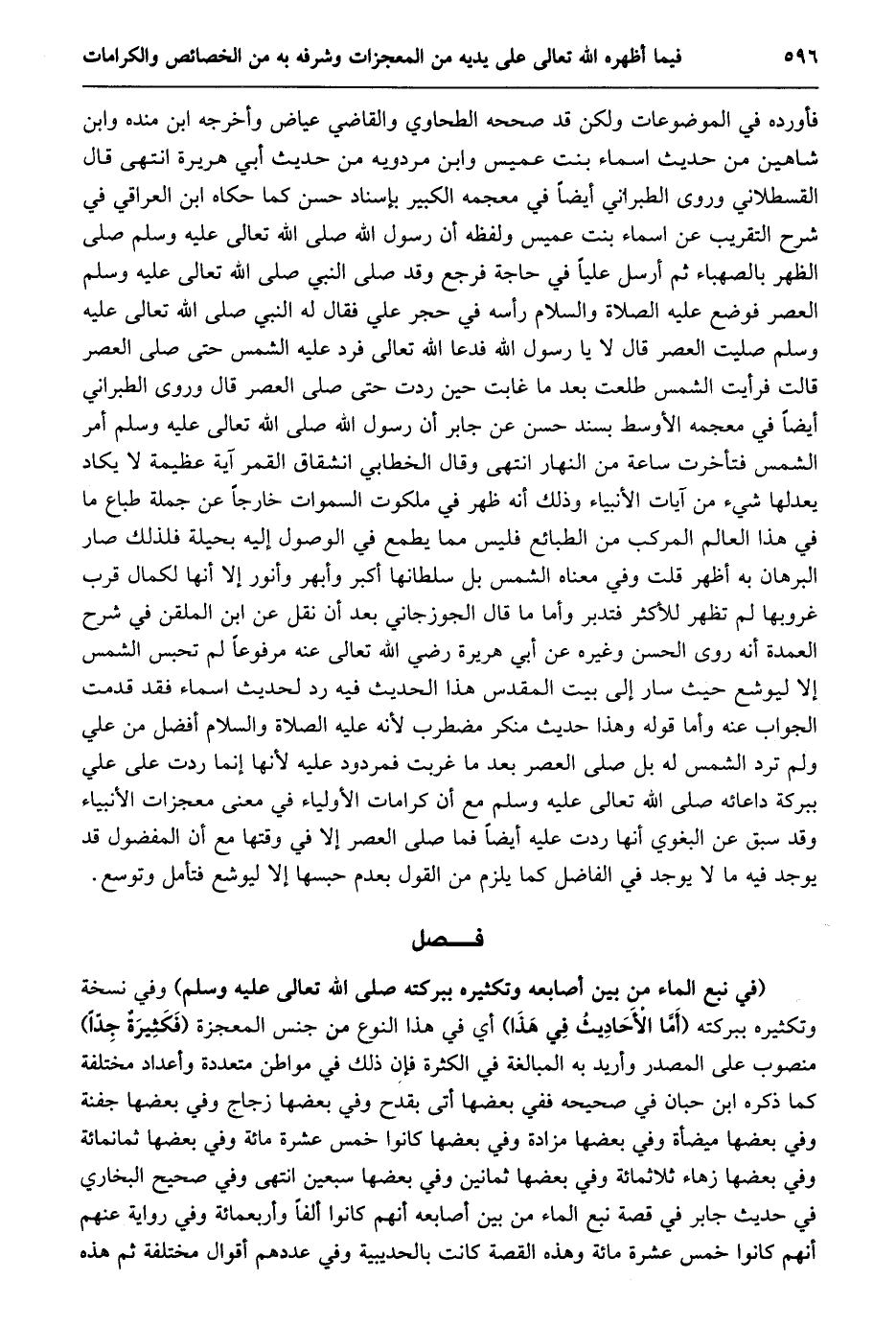 (فِي نَبْعِ الْمَاءِ مِنْ بَيْنِ أَصَابِعِهِ وَتَكْثِيرِهِ ببركته صلى الله تعالى عليه وسلم) وفي نسخة وتكثيره ببركته (أمّا الأحاديث في هذا) أي في هذا النوع من جنس المعجزة (فكثيرة جدّا) منصوب على المصدر وأريد به المبالغة في الكثرة فإن ذلك في مواطن متعددة وأعداد مختلفة كما ذكره ابن حبان في صحيحه ففي بعضها أتى بقدح وفي بعضها زجاج وفي بعضها جفنة وفي بعضها ميضأة وفي بعضها مزادة وفي بعضها كانوا خمس عشرة مائة وفي بعضها ثمانمائة وفي بعضها زهاء ثلاثمائة وفي بعضها ثمانين وفي بعضها سبعين انتهى وفي صحيح البخاري في حديث جابر في قصة نبع الماء من بين أصابعه أنهم كانوا ألفا وأربعمائة وفي رواية عنهم أنهم كانوا خمس عشرة مائة وهذه القصة كانت بالحديبية وفي عددهم أقوال مختلفة ثم هذه