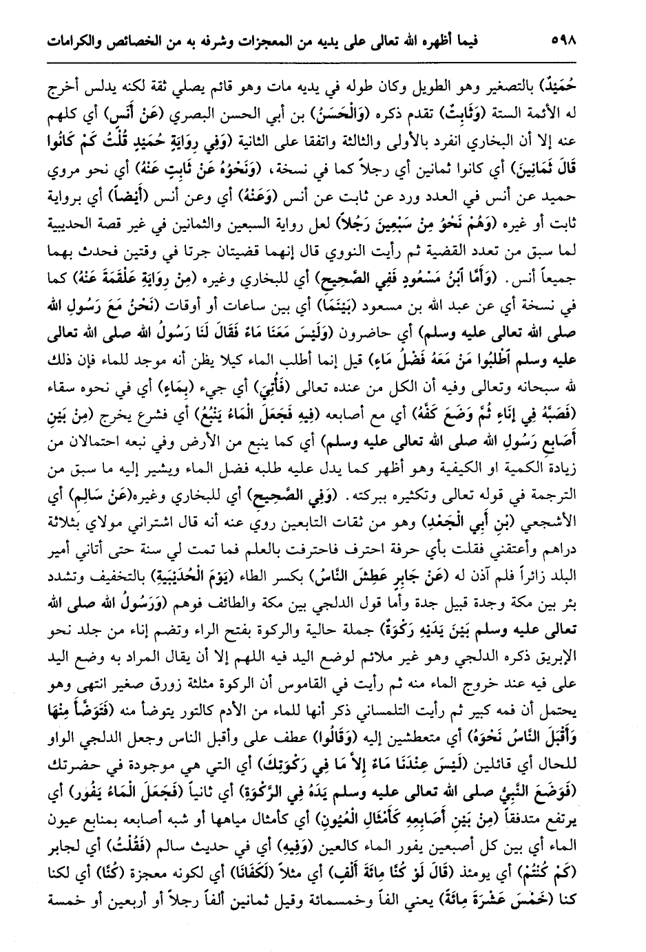 حميد) بالتصغير وهو الطويل وكان طوله في يديه مات وهو قائم يصلي ثقة لكنه يدلس أخرج له الأئمة الستة (وثابت) تقدم ذكره (والحسن) بن أبي الحسن البصري (عن أنس) أي كلهم عنه إلا أن البخاري انفرد بالأولى والثالثة واتفقا على الثانية (وَفِي رِوَايَةِ حُمَيْدٍ قُلْتُ كَمْ كَانُوا قَالَ ثمانين) أي كانوا ثمانين أي رجلا كما في نسخة، (ونحوه عن ثابت عنه) أي نحو مروي حميد عن أنس في العدد ورد عن ثابت عن أنس (وعنه) أي وعن أنس (أيضا) أي برواية ثابت أو غيره (وهم نحو من سبعين رجلا) لعل رواية السبعين والثمانين في غير قصة الحديبية لما سبق من تعدد القضية ثم رأيت النووي قال إنهما قضيتان جرتا في وقتين فحدث بهما جميعا أنس. (وأمّا ابن مسعود ففي الصّحيح) أي للبخاري وغيره (من رواية علقمة عنه) كما في نسخة أي عن عبد الله بن مسعود (بينما) أي بين ساعات أو أوقات (نحن مع رسول الله صلى الله تعالى عليه وسلم) أي حاضرون (وَلَيْسَ مَعَنَا مَاءٌ فَقَالَ لَنَا رَسُولُ اللَّهِ صلى الله تعالى عَلَيْهِ وَسَلَّمَ اطْلُبُوا مَنْ مَعَهُ فَضْلُ مَاءٍ) قيل إنما أطلب الماء كيلا يظن أنه موجد للماء فإن ذلك لله سبحانه وتعالى وفيه أن الكل من عنده تعالى (فأتي) أي جيء (بماء) أي في نحوه سقاء (فصبّه في إناء ثمّ وضع كفّه) أي مع أصابعه (فيه فجعل الماء ينبع) أي فشرع يخرج (مِنْ بَيْنِ أَصَابِعِ رَسُولِ اللَّهِ صَلَّى اللَّهُ تعالى عليه وسلم) أي كما ينبع من الأرض وفي نبعه احتمالان من زيادة الكمية او الكيفية وهو أظهر كما يدل عليه طلبه فضل الماء ويشير إليه ما سبق من الترجمة في قوله تعالى وتكثيره ببركته. (وفي الصّحيح) أي للبخاري وغيره (عن سالم) أي الأشجعي (بن أبي الجعد) وهو من ثقات التابعين روي عنه أنه قال اشتراني مولاي بثلاثة دراهم وأعتقني فقلت بأي حرفة احترف فاحترفت بالعلم فما تمت لي سنة حتى أتاني أمير البلد زائرا فلم آذن له (عن جابر عطش النّاس) بكسر الطاء (يوم الحديبية) بالتخفيف وتشدد بئر بين مكة وجدة قبيل جدة وأما قول الدلجي بين مكة والطائف فوهم (ورسول الله صلى الله تعالى عليه وسلم بين يديه ركوة) جملة حالية والركوة بفتح الراء وتضم إناء من جلد نحو الإبريق ذكره الدلجي وهو غير ملائم لوضع اليد فيه اللهم إلا أن يقال المراد به وضع اليد على فيه عند خروج الماء منه ثم رأيت في القاموس أن الركوة مثلثة زورق صغير انتهى وهو يحتمل أن فمه كبير ثم رأيت التلمساني ذكر أنها للماء من الأدم كالتور يتوضأ منه (فتوضّأ منها وأقبل النّاس نحوه) أي متعطشين إليه (وقالوا) عطف على وأقبل الناس وجعل الدلجي الواو للحال أي قائلين (لَيْسَ عِنْدَنَا مَاءٌ إِلَّا مَا فِي رَكْوَتِكَ) أي التي هي موجودة في حضرتك (فوضع النّبيّ صلى الله تعالى عليه وسلم يده في الرّكوة) أي ثانيا (فجعل الماء يفور) أي يرتفع متدفقا (من بين أصابعه كأمثال العيون) أي كأمثال مياهها أو شبه أصابعه بمنابع عيون الماء أي بين كل أصبعين يفور الماء كالعين (وفيه) أي في حديث سالم (فقلت) أي لجابر (كم كنتم) أي يومئذ (قال لو كنّا مائة ألف) أي مثلا (لكفانا) أي لكونه معجزة (كنّا) أي لكنا كنا (خمس عشرة مائة) يعني الفا وخمسمائة وقيل ثمانين ألفا رجلا أو أربعين أو خمسة