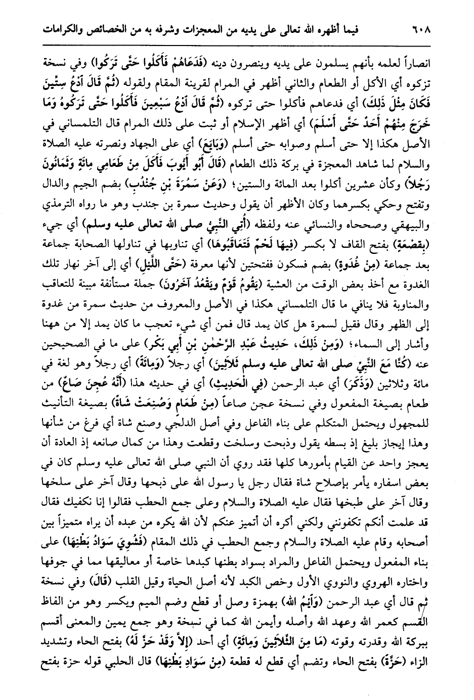 انصارا لعلمه بأنهم يسلمون على يديه وينصرون دينه (فدعاهم فأكلوا حتّى تركوا) وفي نسخة تزكوه أي الأكل أو الطعام والثاني أظهر في المرام لقرينة المقام ولقوله (ثُمَّ قَالَ ادْعُ سِتِّينَ فَكَانَ مِثْلُ ذَلِكَ) أي فدعاهم فأكلوا حتى تركوه (ثمّ قال ادع سبعين فأكلوا حتّى تركوه وما خرج منهم أحد حتّى أسلم) أي أظهر الإسلام أو ثبت على ذلك المرام قال التلمساني في الأصل هكذا إلا حتى أسلم وصوابه حتى أسلم (وبايع) أي على الجهاد ونصرته عليه الصلاة والسلام لما شاهد المعجزة في بركة ذلك الطعام (قَالَ أَبُو أَيُّوبَ فَأَكَلَ مِنْ طَعَامِي مِائَةٌ وثمانون رجلا) وكأن عشرين أكلوا بعد المائة والستين؛ (وعن سمرة بن جندب) بضم الجيم والدال وتفتح وحكي بكسرهما وكان الأظهر أن يقول وحديث سمرة بن جندب وهو ما رواه الترمذي والبيهقي وصححاه والنسائي عنه ولفظه (أتي النّبيّ صلى الله تعالى عليه وسلم) أي جيء (بقصعة) بفتح القاف لا بكسر (فيها لحم فتعاقبوها) أي تناوبها في تناولها الصحابة جماعة بعد جماعة (من غدوة) بضم فسكون ففتحتين لأنها معرفة (حتّى اللّيل) أي إلى آخر نهار تلك الغدوة مع أخذ بعض الوقت من العشية (يقوم قوم ويقعد آخرون) جملة مستأنفة مبينة للتعاقب والمناوبة فلا ينافي ما قال التلمساني هكذا في الأصل والمعروف من حديث سمرة من غدوة إلى الظهر وقال فقيل لسمرة هل كان يمد قال فمن أي شيء تعجب ما كان يمد إلا من ههنا وأشار إلى السماء؛ (وَمِنْ ذَلِكَ، حَدِيثُ عَبْدِ الرَّحْمَنِ بْنِ أَبِي بكر) على ما في الصحيحين عنه (كنّا مع النّبيّ صلى الله تعالى عليه وسلم ثلاثين) أي رجلا (ومائة) أي رجلا وهو لغة في مائة وثلاثين (وذكر) أي عبد الرحمن (في الحديث) أي في حديثه هذا (أنّه عجن صاع) من طعام بصيغة المفعول وفي نسخة عجن صاعا (من طعام وصنعت شاة) بصيغة التأنيث للمجهول ويحتمل المتكلم على بناء الفاعل وفي أصل الدلجي وصنع شاة أي فرغ من شأنها وهذا إيجاز بليغ إذ بسطه يقول وذبحت وسلخت وقطعت وهذا من كمال صانعه إذ العادة أن يعجز واحد عن القيام بأمورها كلها فقد روي أن النبي صلى الله تعالى عليه وسلم كان في بعض اسفاره يأمر بإصلاح شاة فقال رجل يا رسول الله على ذبحها وقال آخر على سلخها وقال آخر على طبخها فقال عليه الصلاة والسلام وعلى جمع الحطب فقالوا إنا نكفيك فقال قد علمت أنكم تكفونني ولكني أكره أن أتميز عنكم لأن الله يكره من عبده أن يراه متميزا بين أصحابه وقام عليه الصلاة والسلام وجمع الحطب في ذلك المقام (فشوي سواد بطنها) على بناء المفعول ويحتمل الفاعل والمراد بسواد بطنها كبدها خاصة أو معاليقها مما في جوفها واختاره الهروي والنووي الأول وخص الكبد لأنه أصل الحياة وقيل القلب (قال) وفي نسخة ثم قال أي عبد الرحمن (وايم الله) بهمزة وصل أو قطع وضم الميم ويكسر وهو من الفاظ القسم كعمر الله وعهد الله وأصله وأيمن الله كما في نسخة وهو جمع يمين والمعنى أقسم ببركة الله وقدرته وقوته (ما من الثّلاثين ومائة) أي أحد (إلّا وقد حزّ له) بفتح الحاء وتشديد الزاء (حزّة) بفتح الحاء وتضم أي قطع له قطعة (من سواد بطنها) قال الحلبي قوله حزة بفتح