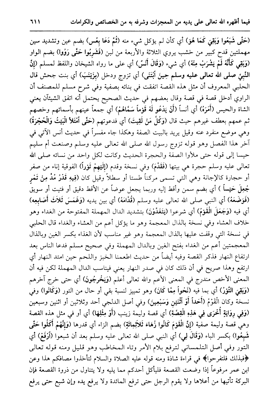 (حتّى شبعوا وبقي كما هو) أي كأن لم يؤكل شيء منه (ثمّ دعا بعس) بضم عين وتشديد سين مهملتين قدح كبير من خشب يروي الثلاثة والأربعة من لبن (فشربوا حتّى رووا) بضم الواو (وبقي كأنّه لم يشرب منه) أي شيء (وقال أنس) أي على ما رواه الشيخان واللفظ لمسلم (إنّ النّبيّ صلى الله تعالى عليه وسلم حين ابتنى) أي تزوج ودخل (بزينب) أي بنت جحش قال الحلبي المعروف أن مثل هذه القصة اتفقت في بنائه بصفية وفي شرح مسلم للمصنف أن الراوي أدخل قصة في قصة وقال بعضهم في حديث الصحيح يحتمل أنه اتفق الشيئآن يعني الشاة والحيس (أمره) أي أنسا (أن يدعو له قوما سمّاهم) أي جمعا عينهم بأسمائهم وخصهم ثم عمهم بعطف غيرهم حيث قال (وكلّ من لقيت) أي فدعوتهم (حتّى امتلأ البيت والحجرة) وهي موضع منفرد عنه وقيل يريد بالبيت الصفة وهكذا جاء مفسرا في حديث أنس الآتي في آخر هذا الفصل وهو قوله تزوج رسول الله صلى الله تعالى عليه وسلم وصنعت أم سليم حيسا إلى قوله حتى ملأوا الصفة والحجرة الحديث وكانت لكل واحد من نسائه صلى الله تعالى عليه وسلم حجرة هي بيتها (فقدّم) وفي نسخة وقدم (إليهم تورا) الفوقية إناء من صفر أو حجارة كالإجانة وهي التي تسمى مركنا طستا أو سطلا وقيل كان (فِيهِ قَدْرُ مُدٍّ مِنْ تَمْرٍ جَعَلَ حَيْسًا) أي بضم سمن وأقط إليه وربما يجعل عوضا عن الأقط دقيق أو فتيت أو سويق (فوضعه) أي النبي صلى الله تعالى عليه وسلم (قدّامه) أي بين يديه (وغمس ثلاث أصابعه) أي فيه (وجعل القوم) أي شرعوا (يتغدّون) بتشديد الدال المهملة المفتوحة من الغداء وهو خلاف العشاء وفي نسخة بالذال المعجمة وهو ما يؤكل أعم من العشاء والغداء قال الحلبي في نسخة التي وقفت عليها بالذال المعجمة وهو غير مناسب لأن الغذاء بكسر الغين وبالذال المعجمتين أعم من الغداء بفتح الغين وبالدال المهملة وفي صحيح مسلم فدعا الناس بعد ارتفاع النهار فذكر القصة وفيه أيضا من حديث اطعمنا الخبز واللحم حين امتد النهار أي ارتفع وهذا صريح في أن ذلك كان في صدر النهار يعني فيناسب الدال المهملة لكن فيه أن المعنى الأخص مندرج في المعنى الأعم والله تعالى أعلم (ويخرجون) أي حتى خرج آخرهم (وبقي التّور) أي بما فيه (نحوا ممّا كان) وهو تمييز لنسبة بقي أو حال من التور (وكانوا) وفي نسخة وَكَانَ الْقَوْمُ (أَحَدًا أَوِ اثْنَيْنِ وَسَبْعِينَ) وَفِي أصل الدلجي أحد وثلاثين أَوِ اثْنَيْنِ وَسَبْعِينَ (وَفِي رِوَايَةٍ أُخْرَى فِي هذه القصّة) أي قصة وليمة زينب (أو مثلها) أي أو في مثل هذه القصة وهي قصة وليمة صفية (إنّ القوم كانوا زهاء ثلاثمائة) بضم الزاء أي قدرها (وإنّهم أكلوا حتّى شبعوا) بكسر الباء (وقال لي) أي النبي صلى الله تعالى عليه وسلم بعد أن شبعوا (ارفع) أي التور وفي أصل التلمساني لترفع بلام الأمر وتاء المخاطب وهو قليل ومنه قوله تعالى فبذلك فلتفرحوا في قراءة شاذة ومنه قوله عليه الصلاة والسلام لتأخذوا مصافكم هذا وعن ابن عمر مرفوعا إذا وضعت القصعة فليأكل أحدكم مما يليه ولا يتناول من ذروة القصعة فإن البركة تأتيها من أعلاها ولا يقوم الرجل حتى ترفع المائدة ولا يرفع يده وإن شبع حتى يرفع