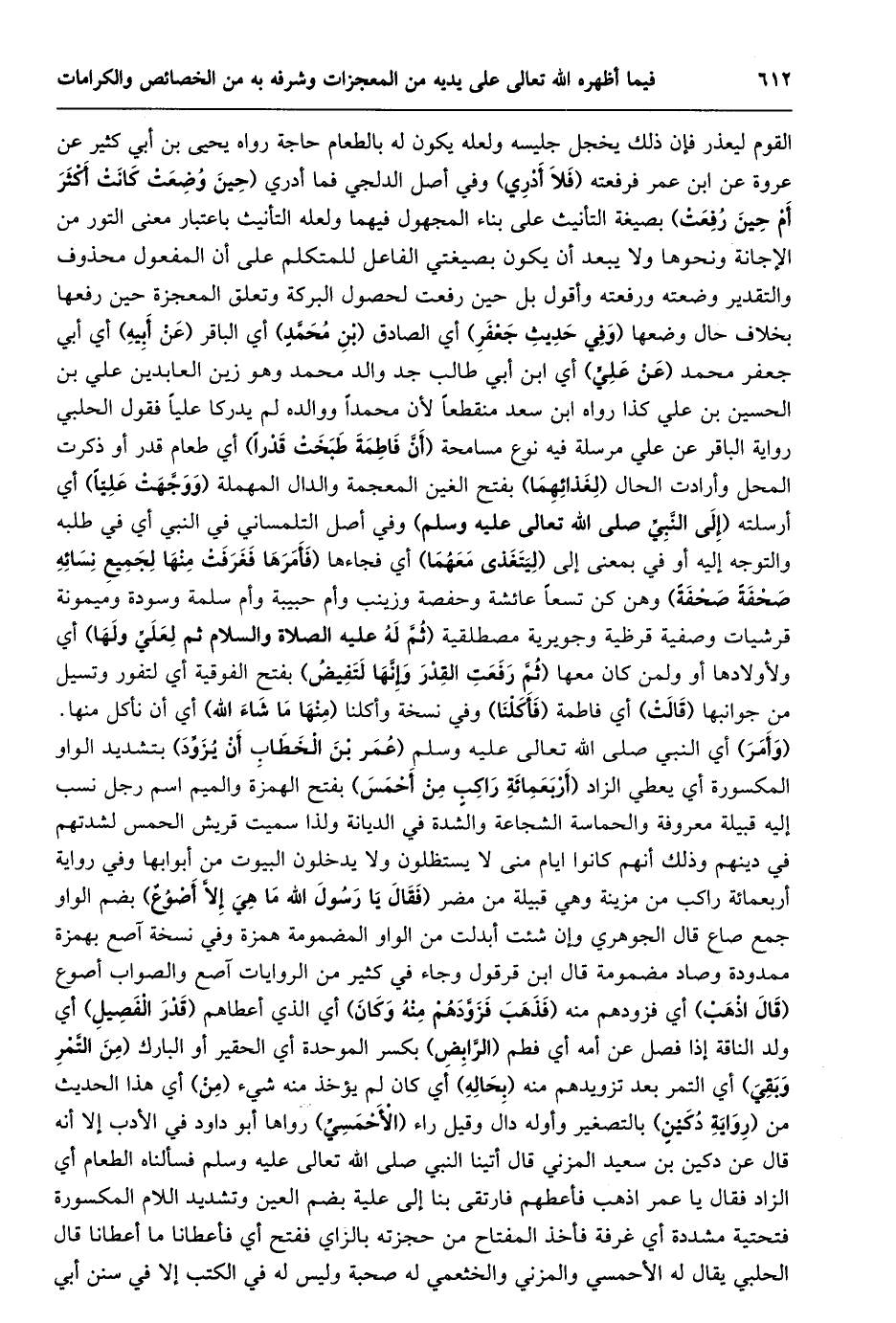 القوم ليعذر فإن ذلك يخجل جليسه ولعله يكون له بالطعام حاجة رواه يحيى بن أبي كثير عن عروة عن ابن عمر فرفعته (فلا أدري) وفي أصل الدلجي فَمَا أَدْرِي (حِينَ وُضِعَتْ كَانَتْ أَكْثَرَ أَمْ حين رفعت) بصيغة التأنيث على بناء المجهول فيهما ولعله التأنيث باعتبار معنى التور من الإجانة ونحوها ولا يبعد أن يكون بصيغتي الفاعل للمتكلم على أن المفعول محذوف والتقدير وضعته ورفعته وأقول بل حين رفعت لحصول البركة وتعلق المعجزة حين رفعها بخلاف حال وضعها (وفي حديث جعفر) أي الصادق (بن محمّد) أي الباقر (عن أبيه) أي أبي جعفر محمد (عن عليّ) أي ابن أبي طالب جد والد محمد وهو زين العابدين علي بن الحسين بن علي كذا رواه ابن سعد منقطعا لأن محمدا ووالده لم يدركا عليا فقول الحلبي رواية الباقر عن علي مرسلة فيه نوع مسامحة (أنّ فاطمة طبخت قدرا) أي طعام قدر أو ذكرت المحل وأرادت الحال (لغذائهما) بفتح الغين المعجمة والدال المهملة (ووجّهت عليّا) أي أرسلته (إلى النّبيّ صلى الله تعالى عليه وسلم) وفي أصل التلمساني في النبي أي في طلبه والتوجه إليه أو في بمعنى إلى (ليتغذى معهما) أي فجاءها (فأمرها فغرفت منها لجميع نسائه صحفة صحفة) وهن كن تسعا عائشة وحفصة وزينب وأم حبيبة وأم سلمة وسودة وميمونة قرشيات وصفية قرظية وجويرية مصطلقية (ثمّ له عليه الصلاة والسلام ثم لعليّ ولها) أي ولأولادها أو ولمن كان معها (ثمّ رفعت القدر وإنّها لتفيض) بفتح الفوقية أي لتفور وتسيل من جوانبها (قالت) أي فاطمة (فأكلنا) وفي نسخة وأكلنا (منها ما شاء الله) أي أن نأكل منها.
