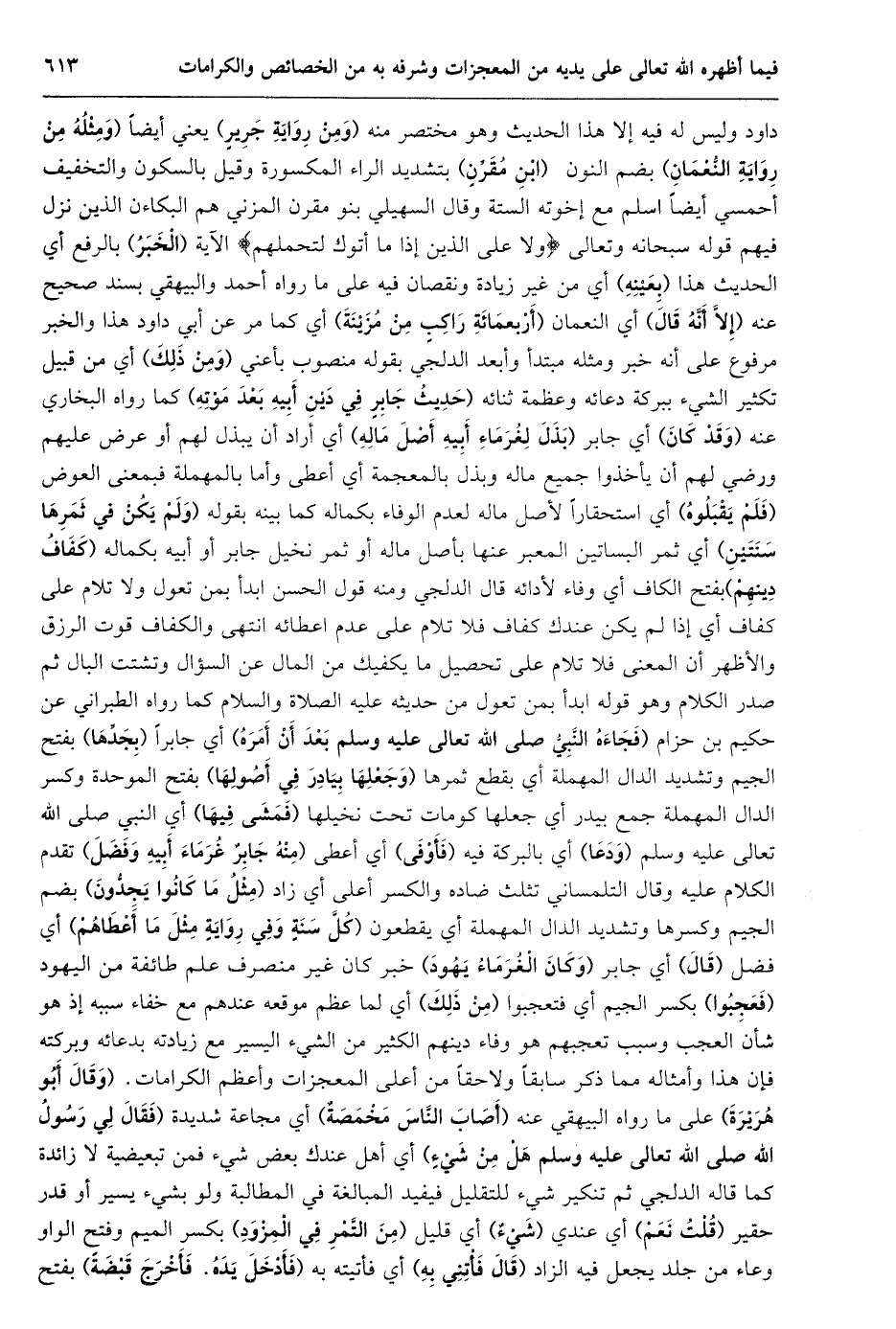داود وليس له فيه إلا هذا الحديث وهو مختصر منه (ومن رواية جرير) يعني أيضا (ومثله من رواية النّعمان) بضم النون (ابن مقرّن) بتشديد الراء المكسورة وقيل بالسكون والتخفيف أحمسي أيضا اسلم مع إخوته الستة وقال السهيلي بنو مقرن المزني هم البكاءن الذين نزل فيهم قوله سبحانه وتعالى وَلا عَلَى الَّذِينَ إِذا ما أَتَوْكَ لِتَحْمِلَهُمْ الآية (الخبر) بالرفع أي الحديث هذا (بعينه) أي من غير زيادة ونقصان فيه على ما رواه أحمد والبيهقي بسند صحيح عنه (إلّا أنّه قال) أي النعمان (أربعمائة راكب من مزينة) أي كما مر عن أبي داود هذا والخبر مرفوع على أنه خبر ومثله مبتدأ وأبعد الدلجي بقوله منصوب بأعني (ومن ذلك) أي من قبيل تكثير الشيء ببركة دعائه وعظمة ثنائه (حَدِيثُ جَابِرٍ فِي دَيْنِ أَبِيهِ بَعْدَ مَوْتِهِ) كما رواه البخاري عنه (وقد كان) أي جابر (بذل لغرماء أبيه أصل ماله) أي أراد أن يبذل لهم أو عرض عليهم ورضي لهم أن يأخذوا جميع ماله وبذل بالمعجمة أي أعطى وأما بالمهملة فبمعنى العوض (فلم يقبلوه) أي استحقارا لأصل ماله لعدم الوفاء بكماله كما بينه بقوله (ولم يكن في ثمرها سنتين) أي ثمر البساتين المعبر عنها بأصل ماله أو ثمر نخيل جابر أو أبيه بكماله (كفاف دينهم) بفتح الكاف أي وفاء لأدائه قال الدلجي ومنه قول الحسن ابدأ بمن تعول ولا تلام على كفاف أي إذا لم يكن عندك كفاف فلا تلام على عدم اعطائه انتهى والكفاف قوت الرزق والأظهر أن المعنى فلا تلام على تحصيل ما يكفيك من المال عن السؤال وتشتت البال ثم صدر الكلام وهو قوله ابدأ بمن تعول من حديثه عليه الصلاة والسلام كما رواه الطبراني عن حكيم بن حزام (فجاءه النّبيّ صلى الله تعالى عليه وسلم بعد أن أمره) أي جابرا (بجدّها) بفتح الجيم وتشديد الدال المهملة أي بقطع ثمرها (وجعلها بيادر في أصولها) بفتح الموحدة وكسر الدال المهملة جمع بيدر أي جعلها كومات تحت نخيلها (فمشى فيها) أي النبي صلى الله تعالى عليه وسلم (ودعا) أي بالبركة فيه (فأوفى) أي أعطى (منه جابر غرماء أبيه وفضل) تقدم الكلام عليه وقال التلمساني تثلث ضاده والكسر أعلى أي زاد (مثل ما كانوا يجدّون) بضم الجيم وكسرها وتشديد الدال المهملة أي يقطعون (كُلَّ سَنَةٍ وَفِي رِوَايَةٍ مِثْلُ مَا أَعْطَاهُمْ) أي فضل (قال) أي جابر (وكان الغرماء يهود) خبر كان غير منصرف علم طائفة من اليهود (فعجبوا) بكسر الجيم أي فتعجبوا (من ذلك) أي لما عظم موقعه عندهم مع خفاء سببه إذ هو شأن العجب وسبب تعجبهم هو وفاء دينهم الكثير من الشيء اليسير مع زيادته بدعائه وبركته فإن هذا وأمثاله مما ذكر سابقا ولا حقا من أعلى المعجزات وأعظم الكرامات. (وقال أبو هريرة) على ما رواه البيهقي عنه (أصاب النّاس مخمصة) أي مجاعة شديدة (فقال لي رسول الله صلى الله تعالى عليه وسلم هل من شيء) أي أهل عندك بعض شيء فمن تبعيضية لا زائدة كما قاله الدلجي ثم تنكير شيء للتقليل فيفيد المبالغة في المطالبة ولو بشيء يسير أو قدر حقير (قلت نعم) أي عندي (شيء) أي قليل (من التّمر في المزود) بكسر الميم وفتح الواو وعاء من جلد يجعل فيه الزاد (قال فأتني به) أي فأتيته به (فأدخل يده. فأخرج قبضة) بفتح